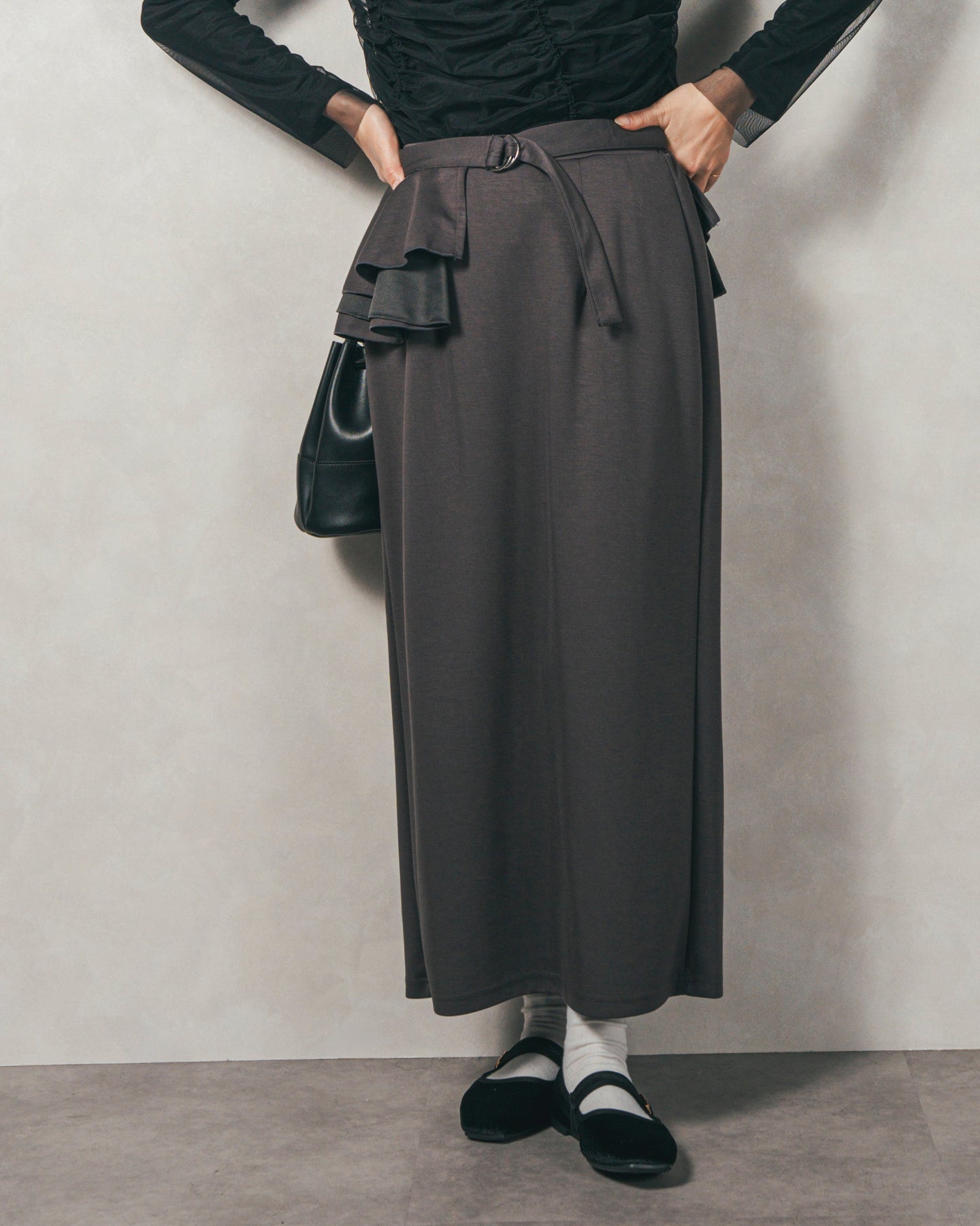 取り外しができるフリルベルトがポイント。フリルが、気になる腰まわりをカバーしつつ、コーディネートのアクセントになります。ベルトを外せばシンプルなIラインスカートに。(フリルからのぞくレースは商品には含まれません)