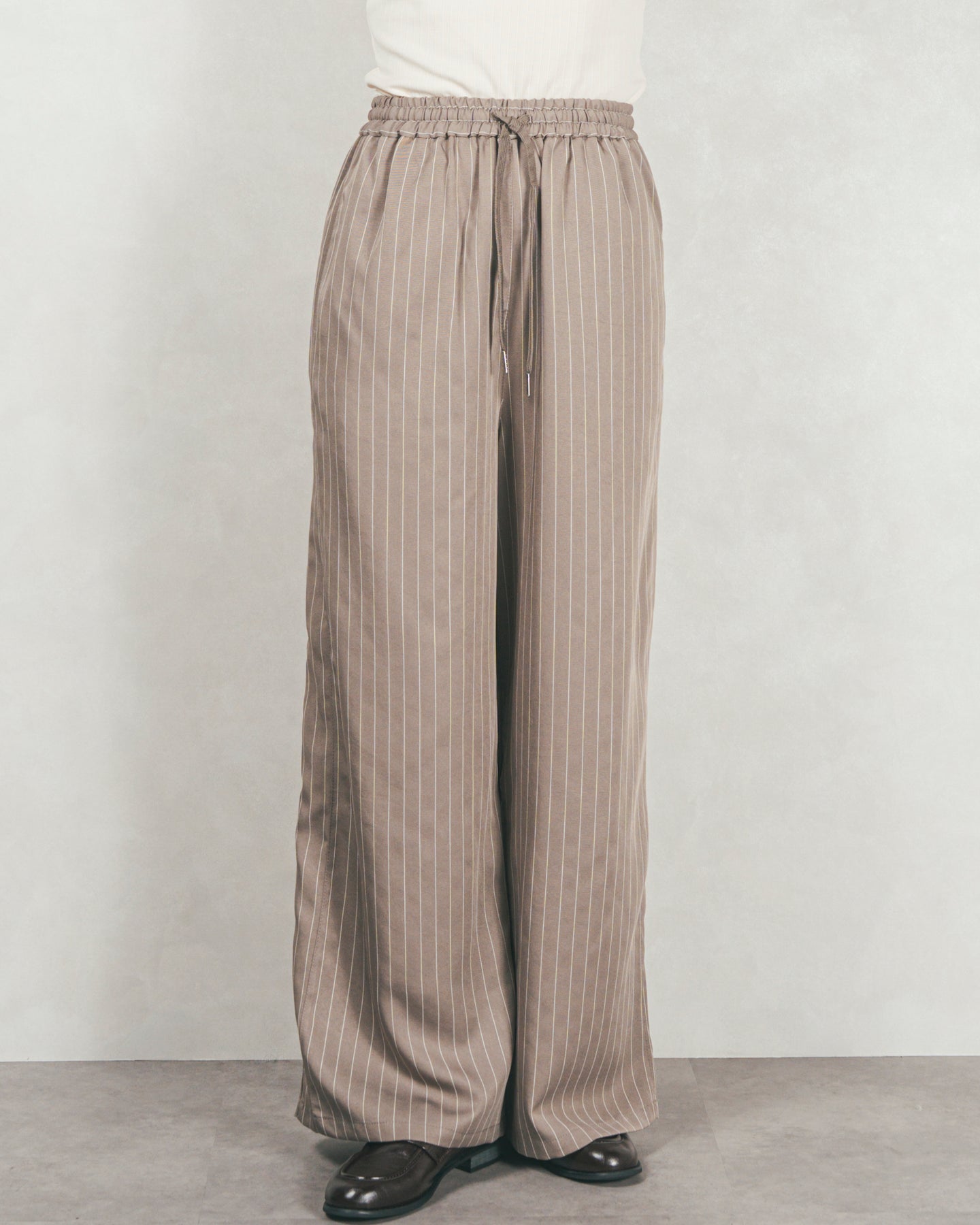 ワイドストレートのシルエットでリラックス感がありつつ、ストライプ柄できちんと感をプラス。ピンストライプの柄は脚長効果も◎