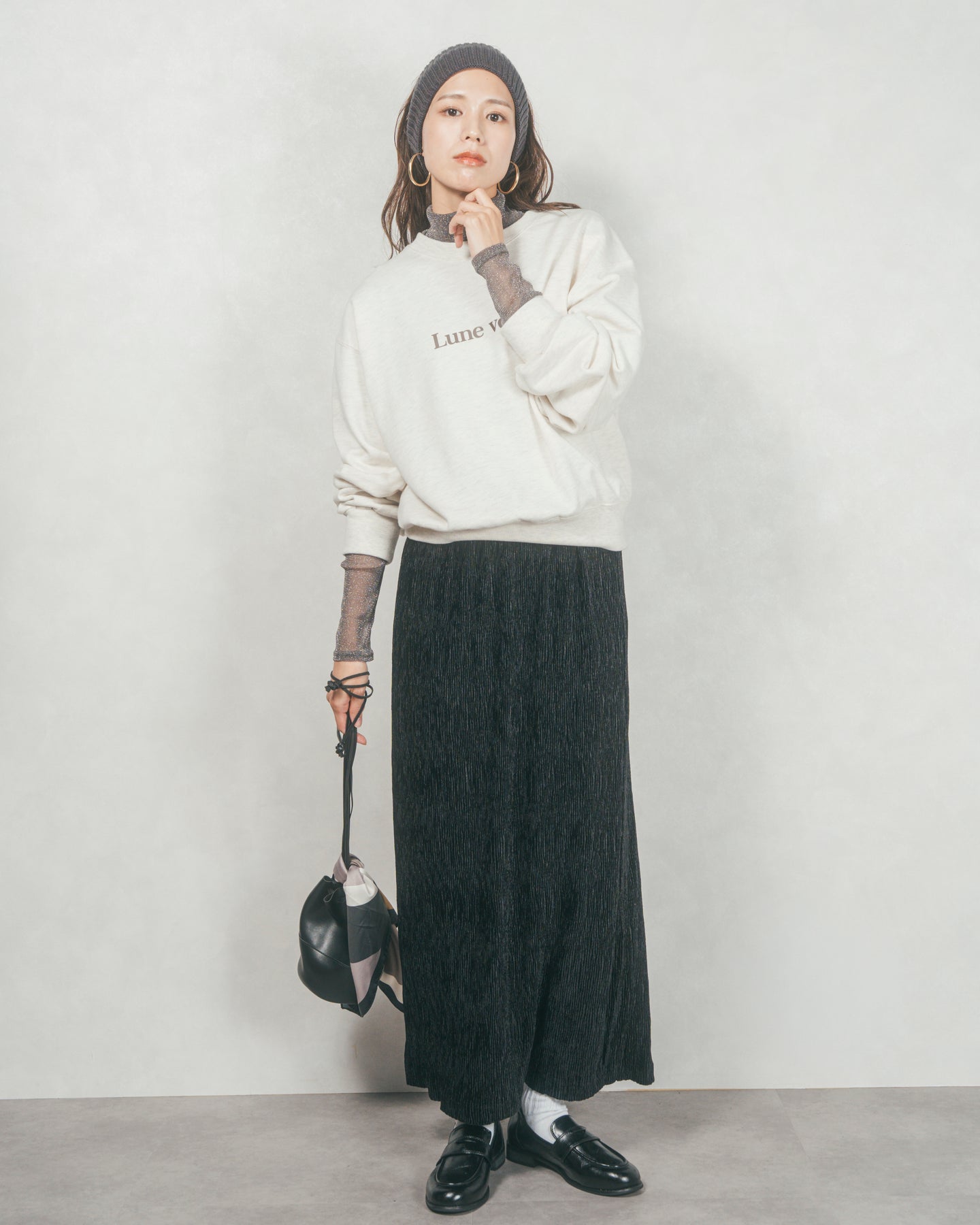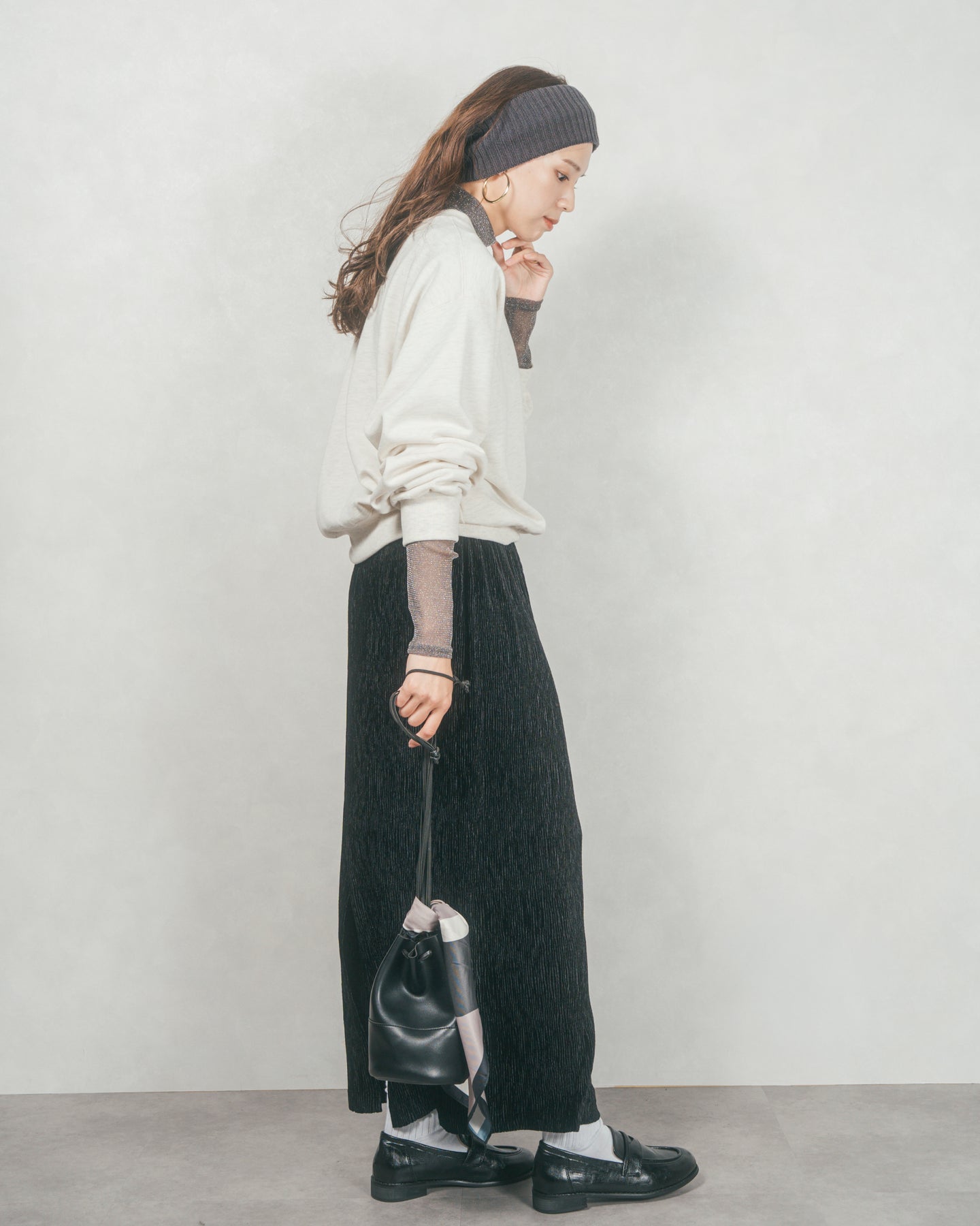 着回し力の高いベーシックカラー展開で、どんなボトムスとも相性ばっちり。プリーツスカートやタイトスカートと合わせた甘辛ミックススタイルがトレンド感あるおすすめの着こなしです。