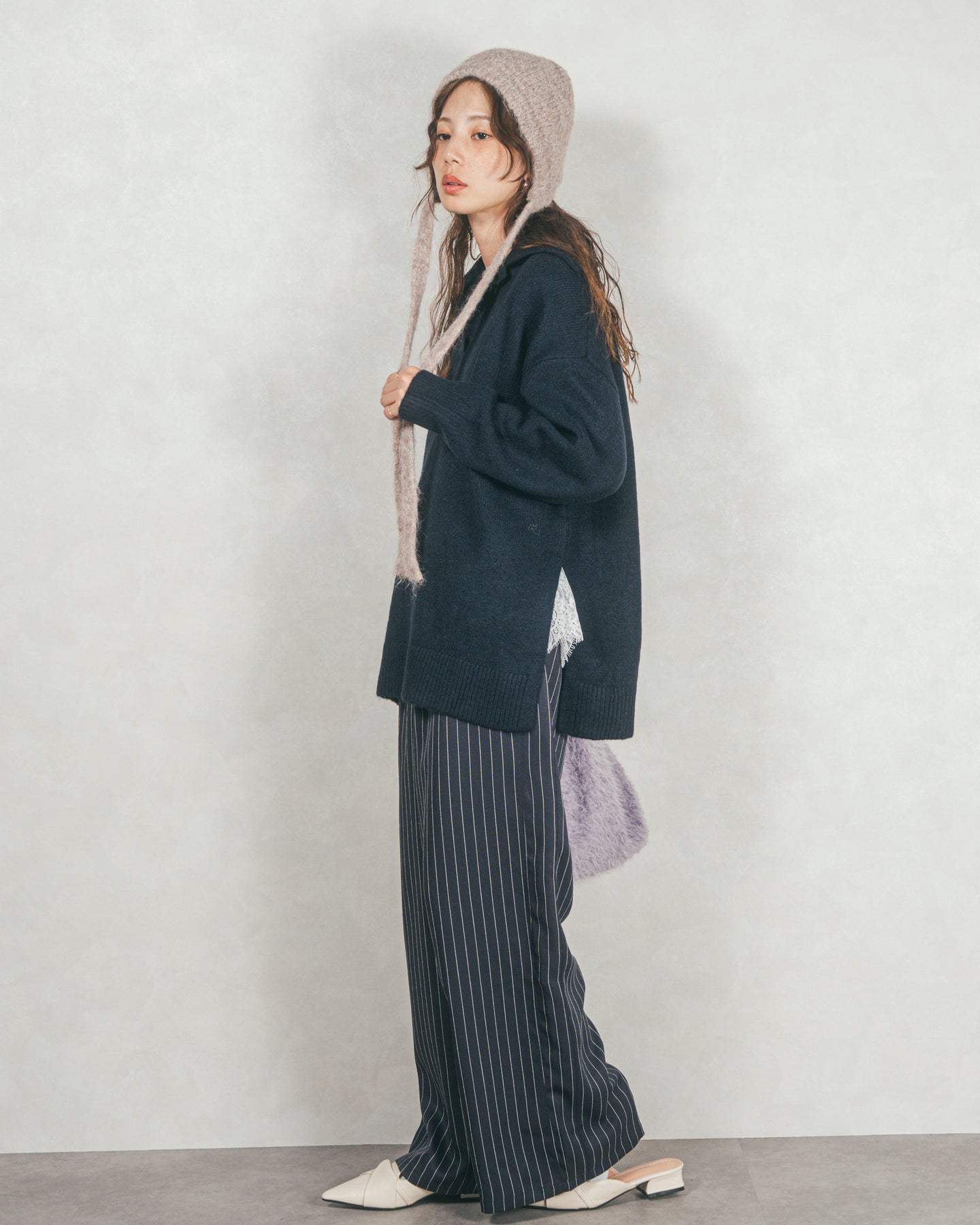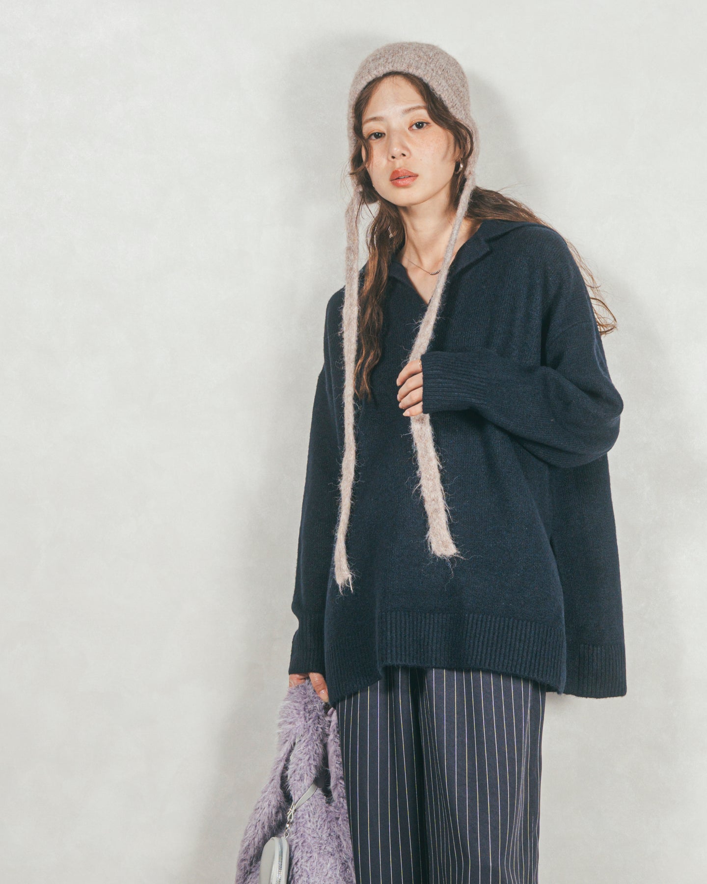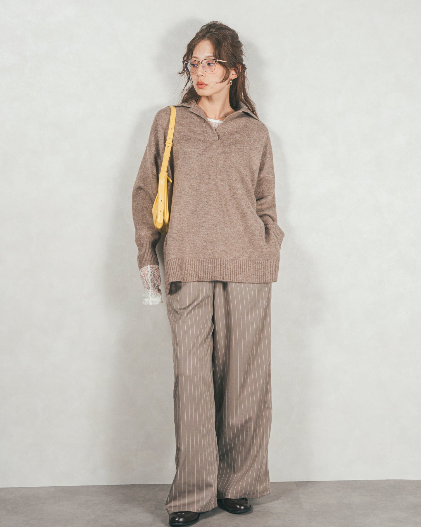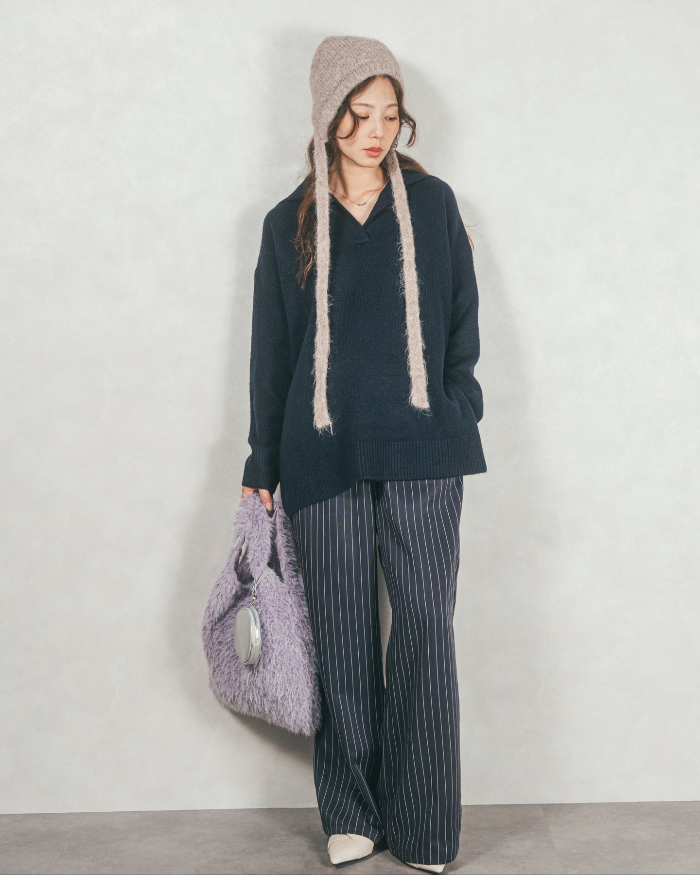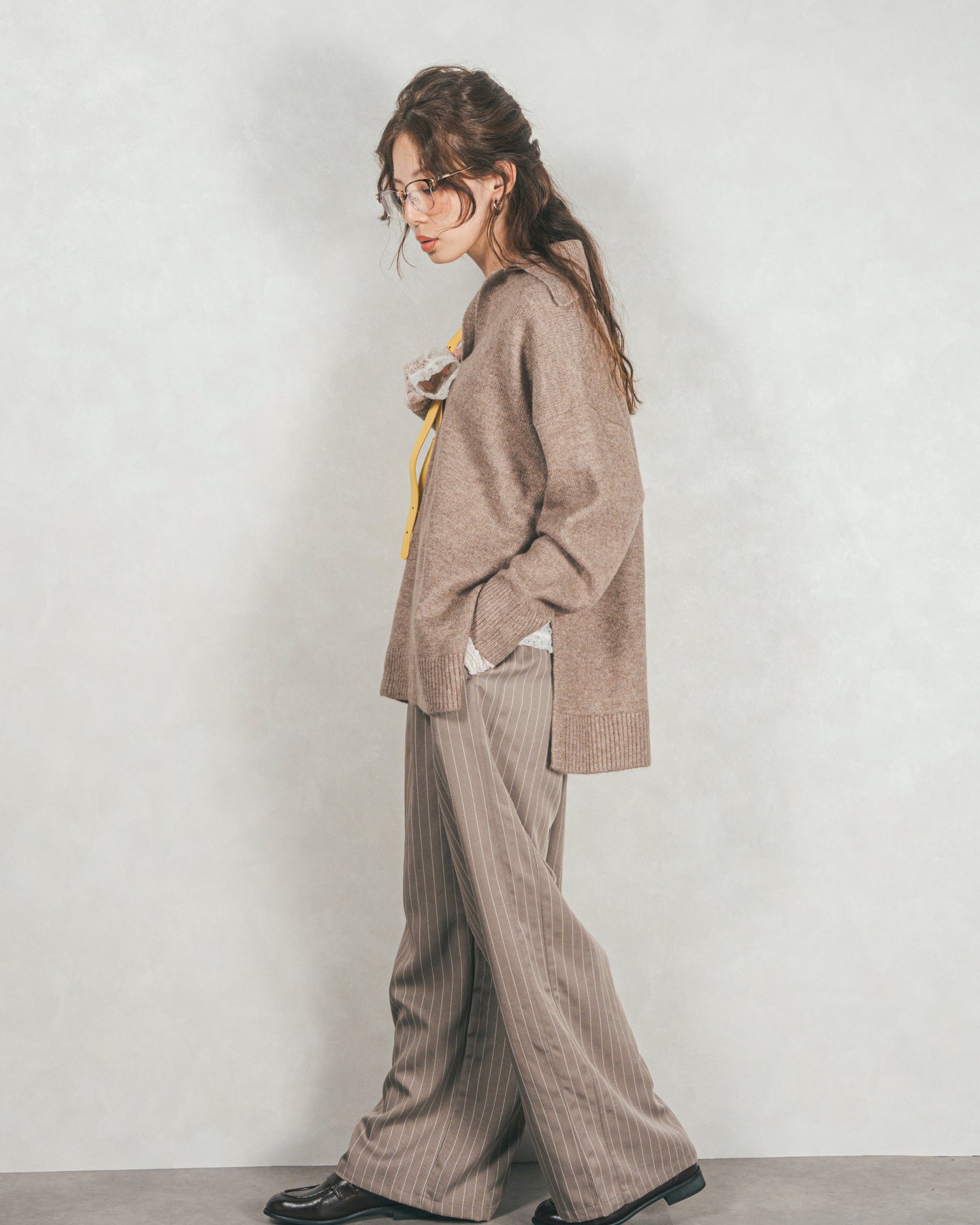 [SET]サイドスリット襟付きスキッパーニット+Relaxストライプパンツ