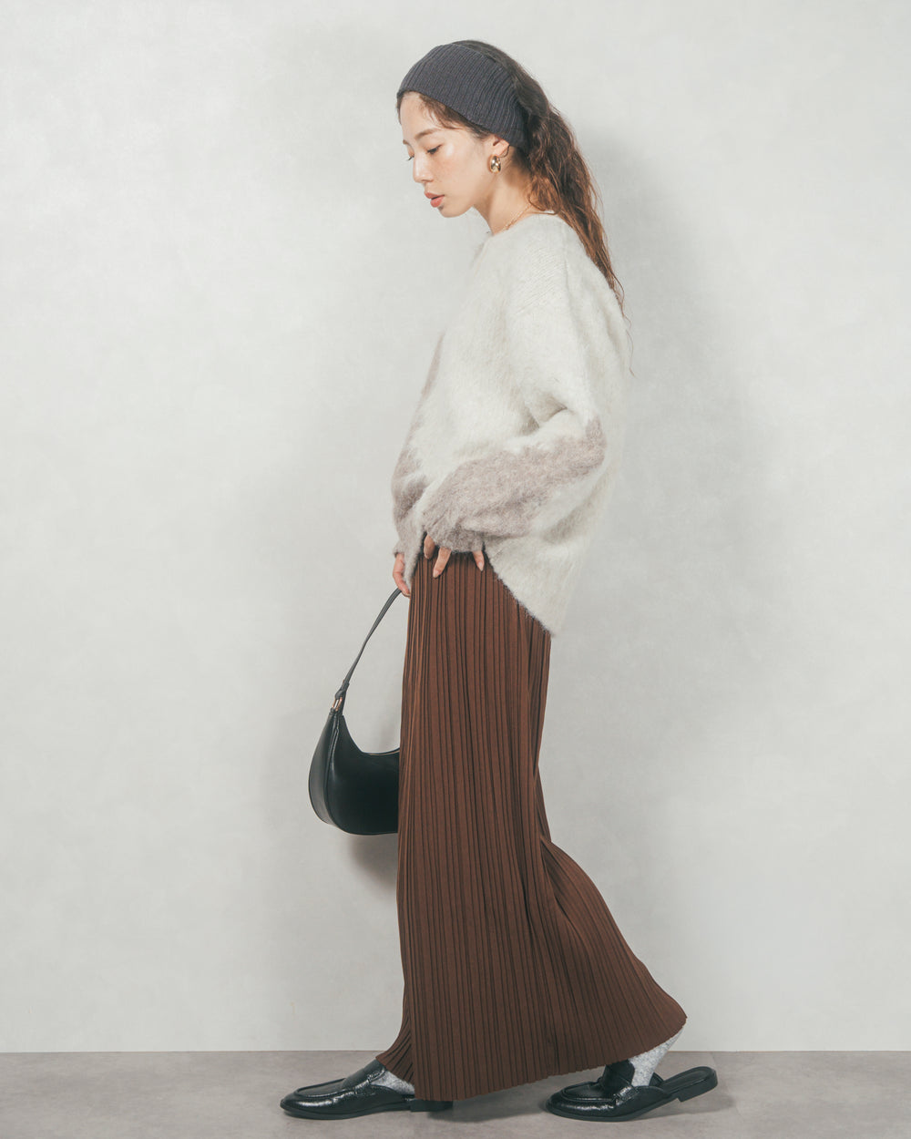 落ち着きの中に遊び心が光るカラーリングは、コーデの主役にも差し色にも。シンプルなボトムと合わせて、ニットの個性を活かすスタイリングがおすすめです。