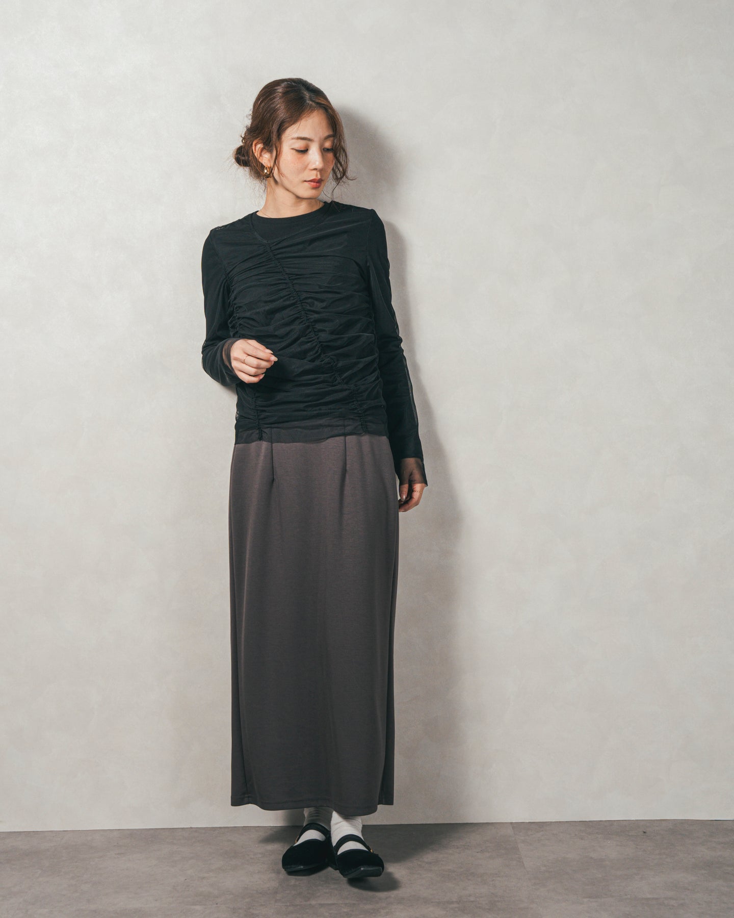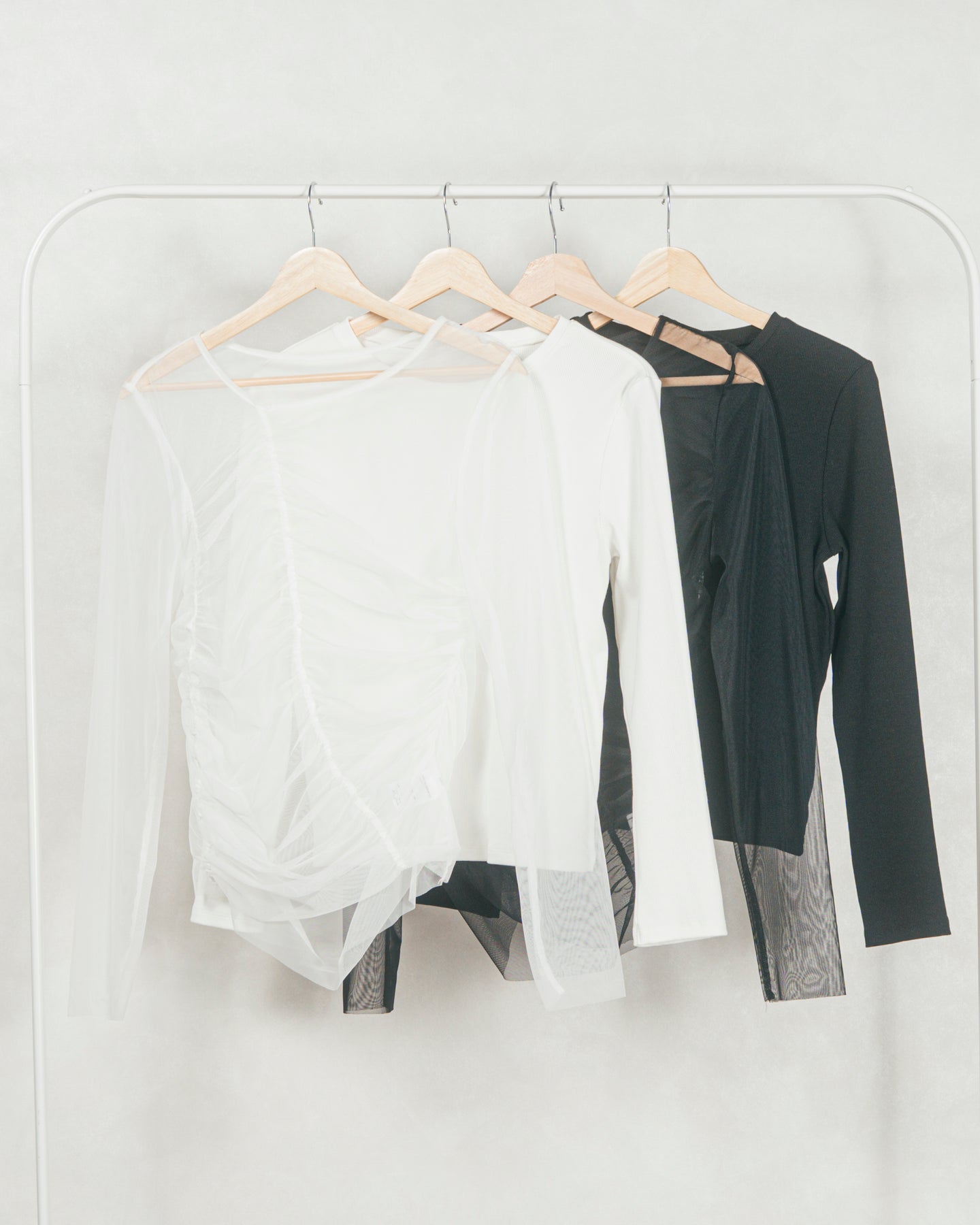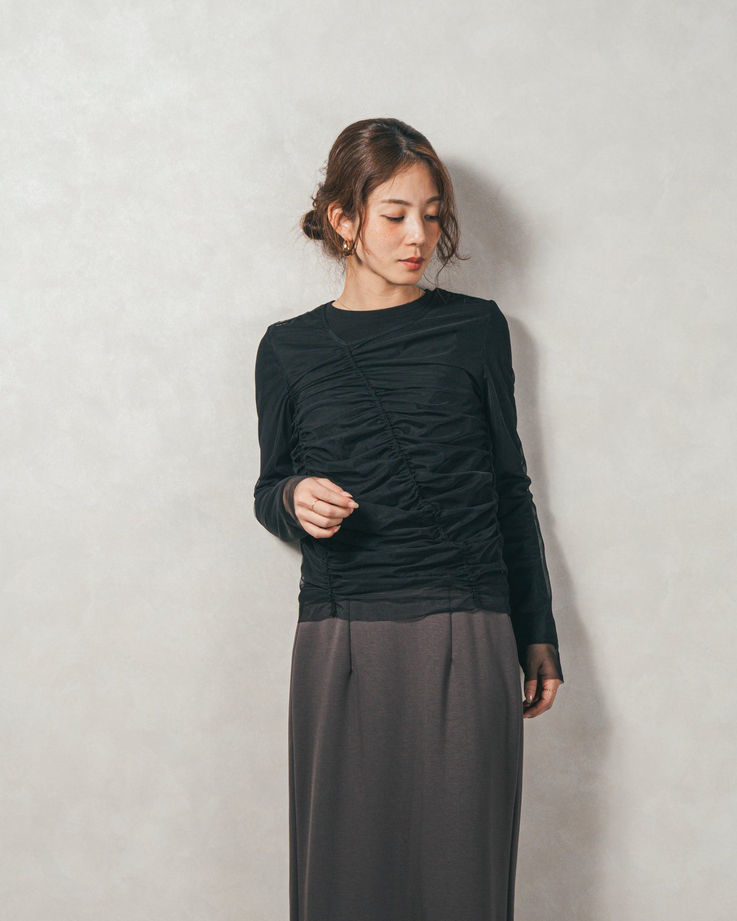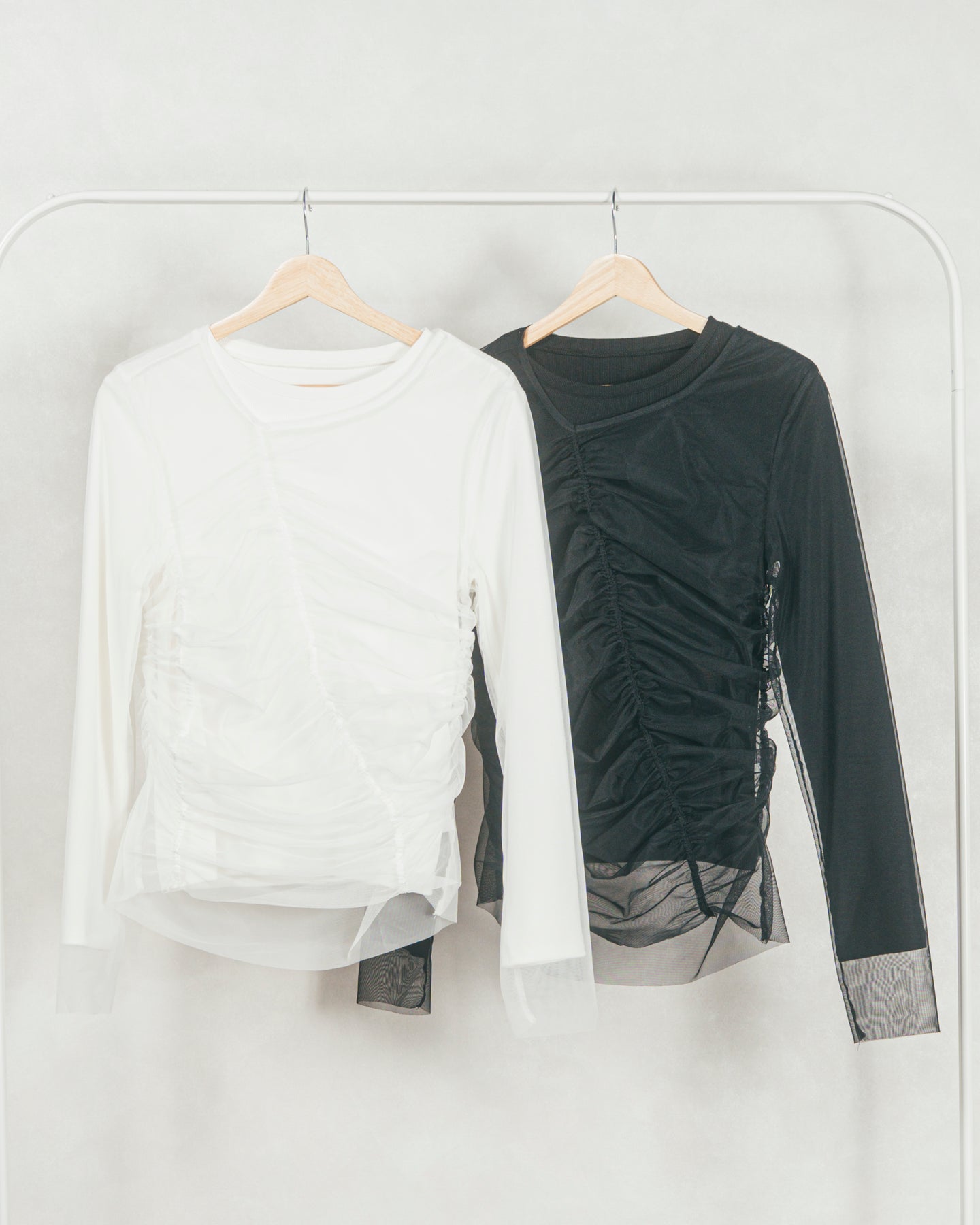チュールトップスのシャーリングは くしゅっと寄せたギャザーが立体的。シンプルなアイテムに重ねるだけでこなれた雰囲気に。それぞれが独立して使えるセットアイテムなので、気分で自由に使い分けられるのが嬉しいポイント◎