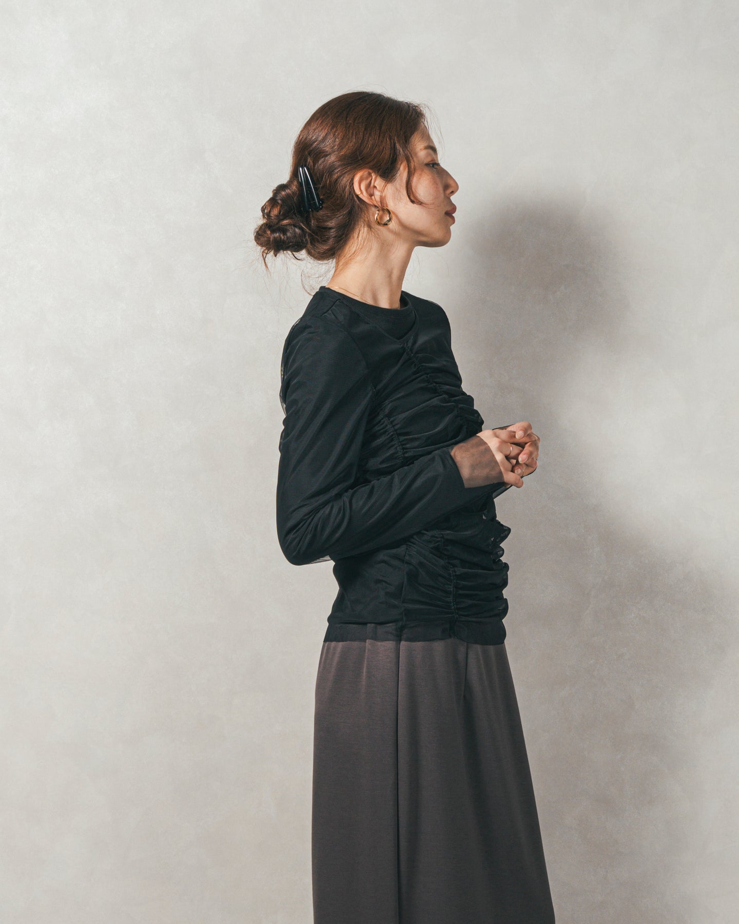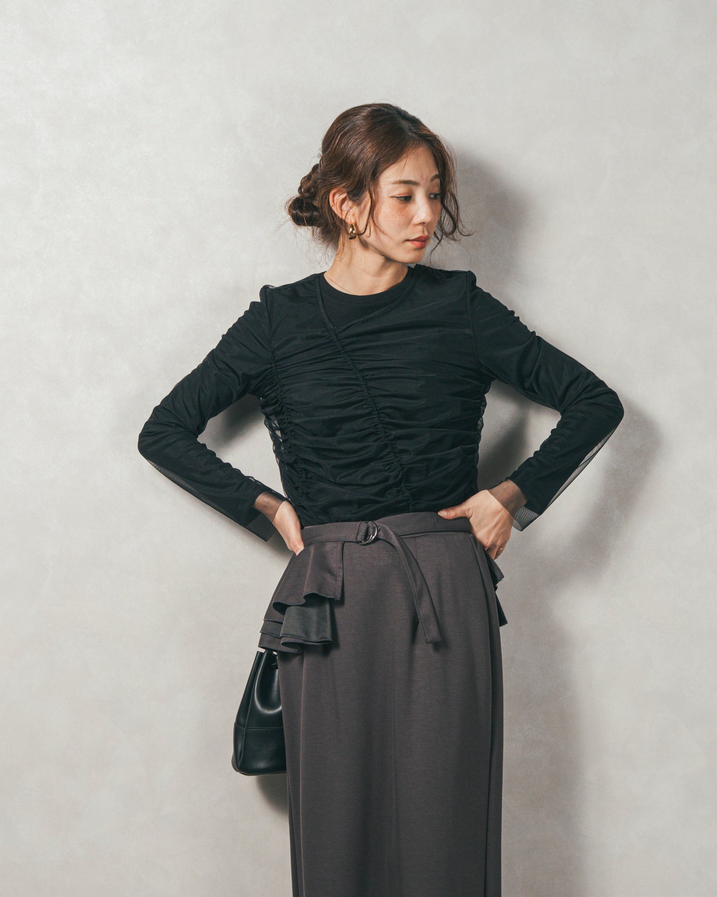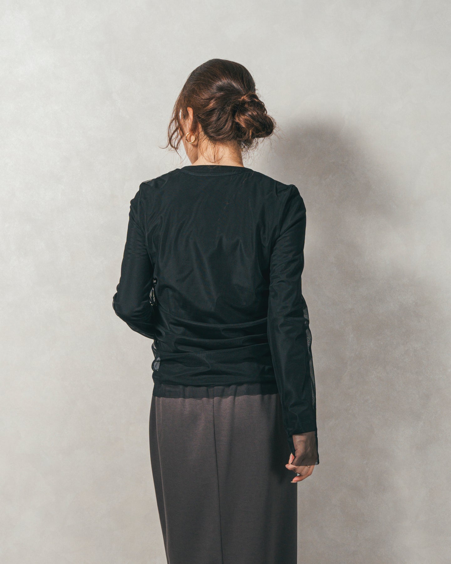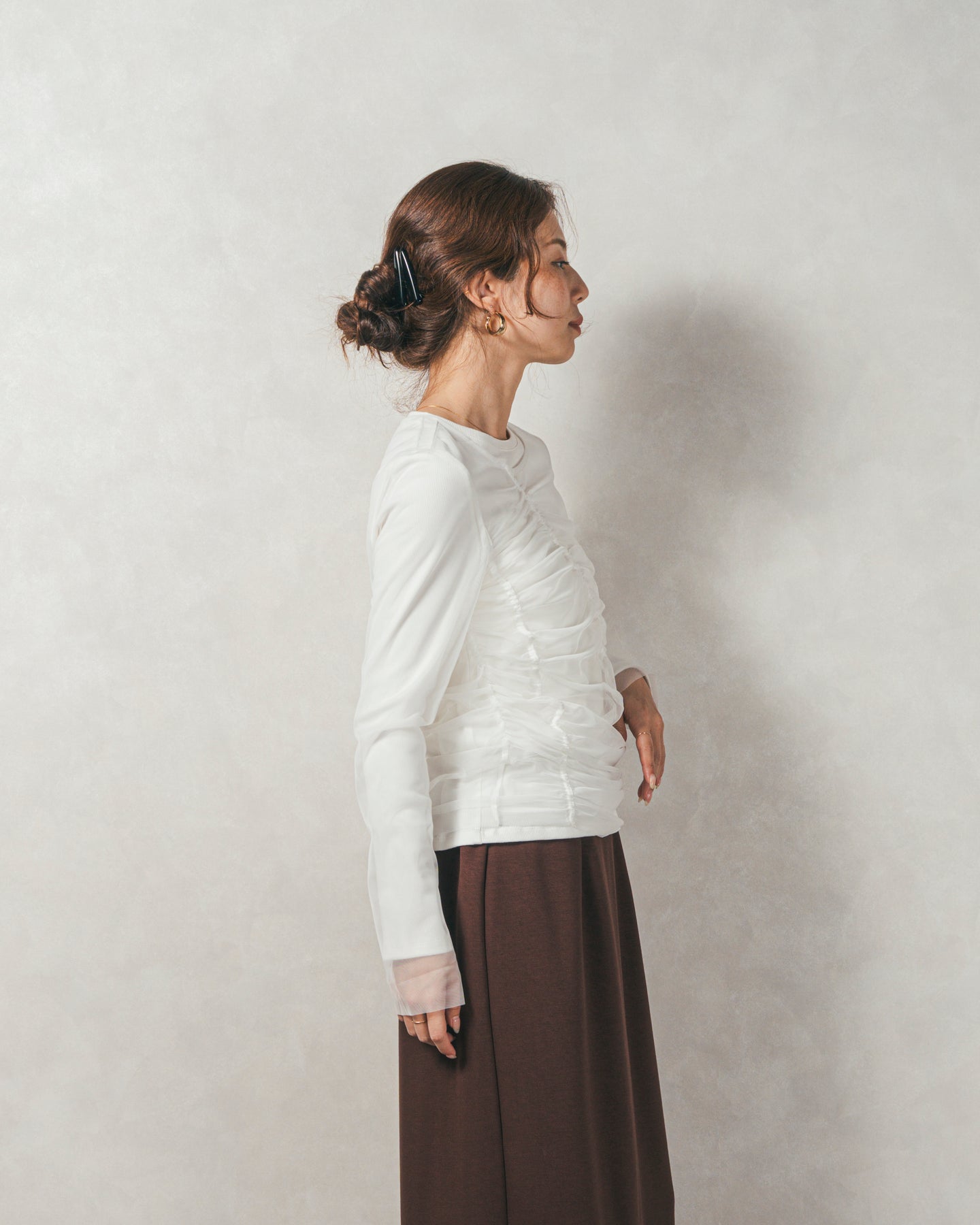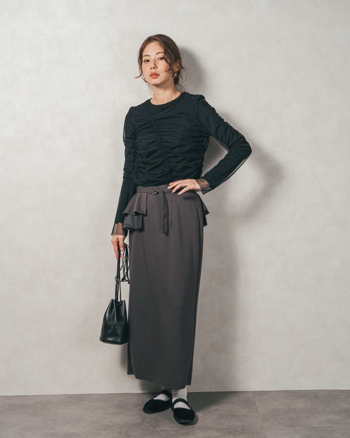 チュールトップスのシャーリングは くしゅっと寄せたギャザーが立体的。シンプルなアイテムに重ねるだけでこなれた雰囲気に。それぞれが独立して使えるセットアイテムなので、気分で自由に使い分けられるのが嬉しいポイント◎