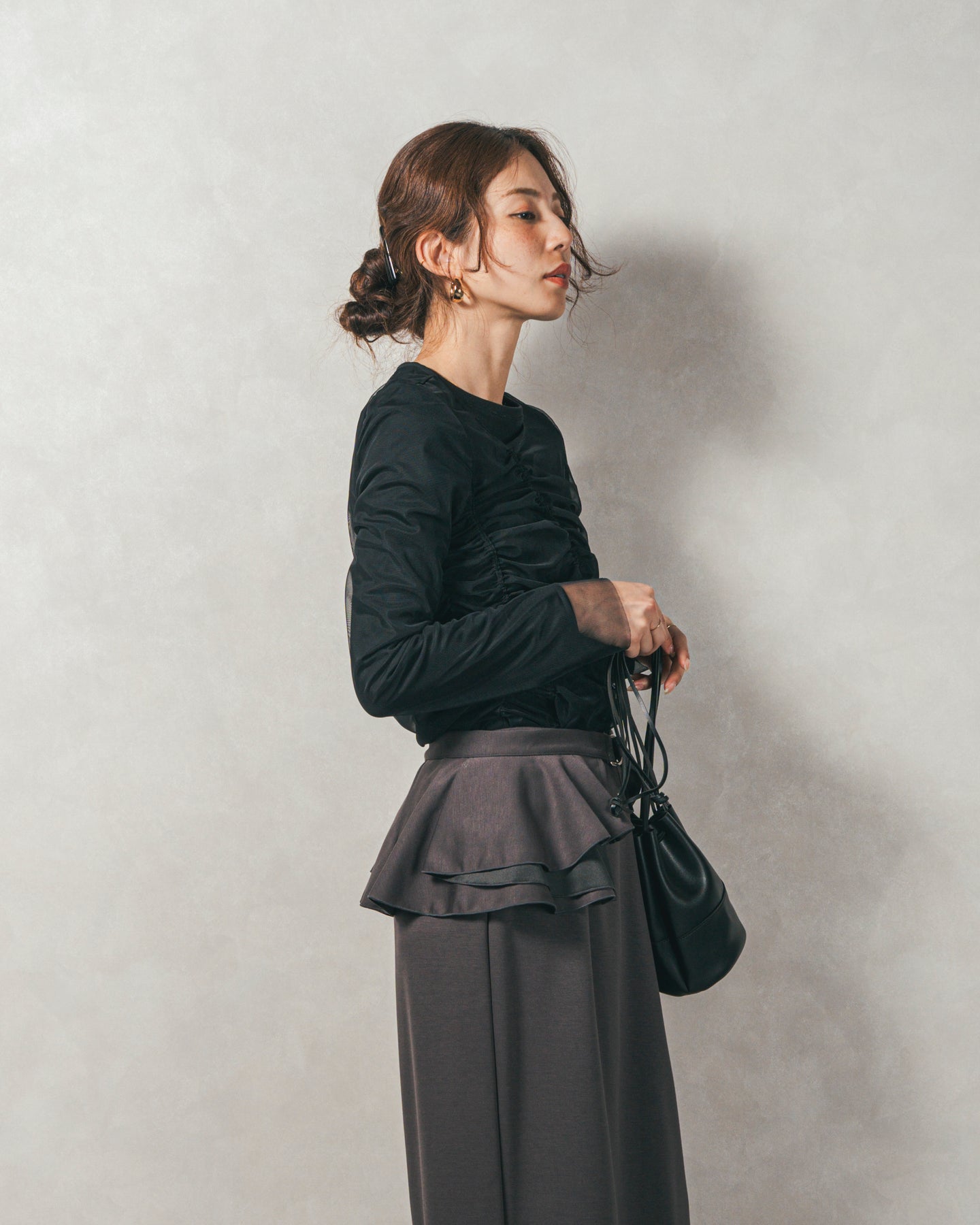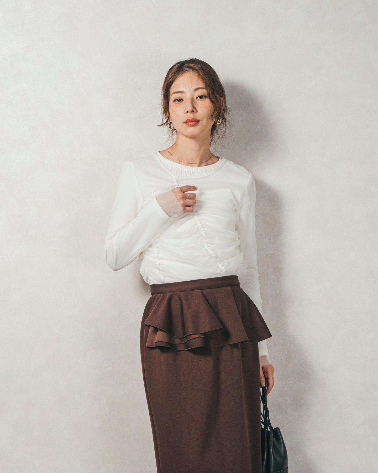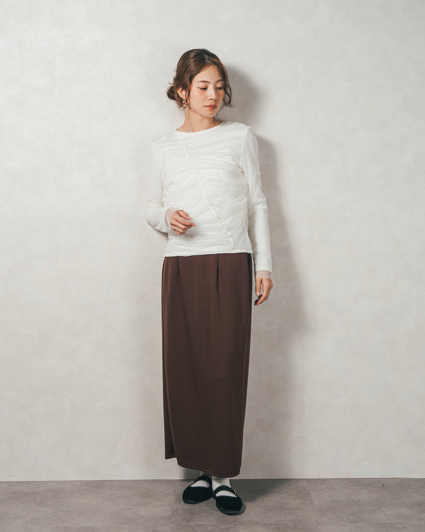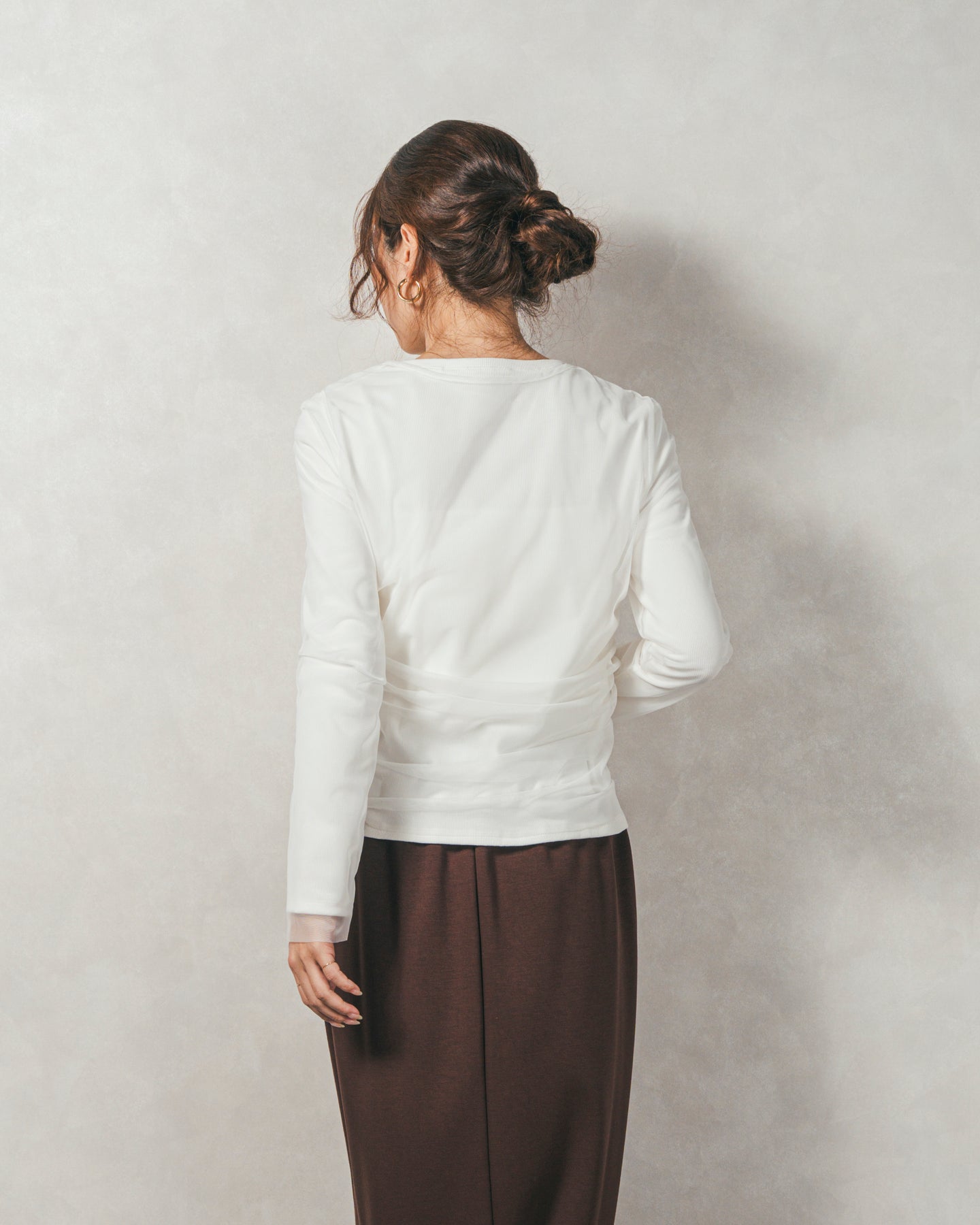 チュールトップスのシャーリングは くしゅっと寄せたギャザーが立体的。シンプルなアイテムに重ねるだけでこなれた雰囲気に。それぞれが独立して使えるセットアイテムなので、気分で自由に使い分けられるのが嬉しいポイント◎