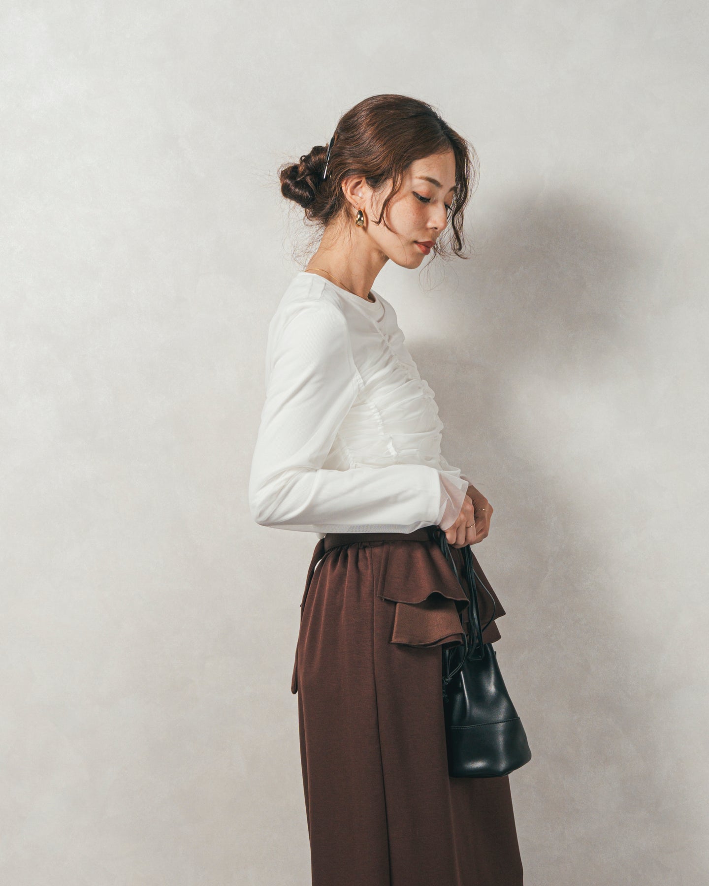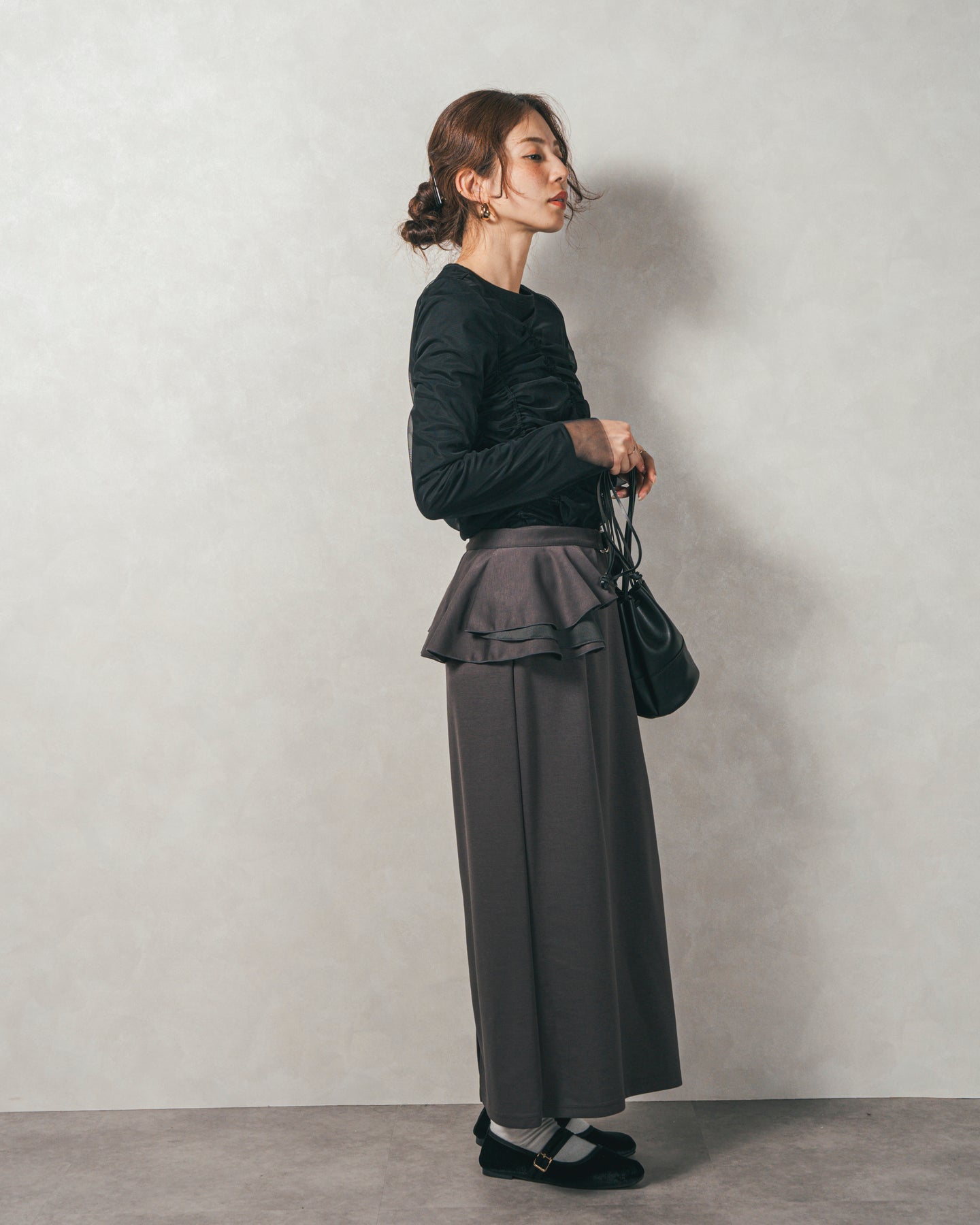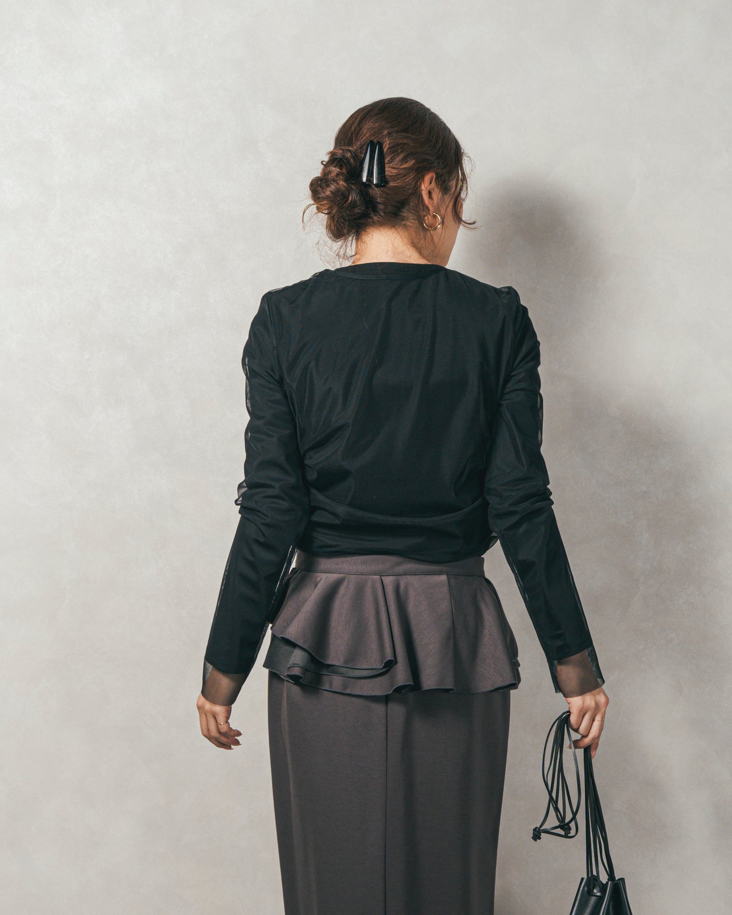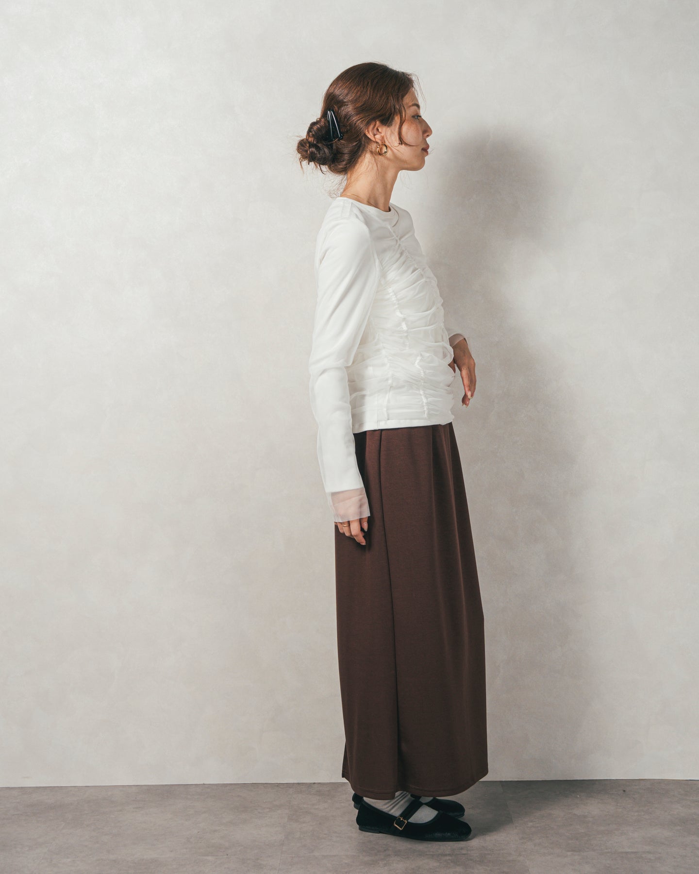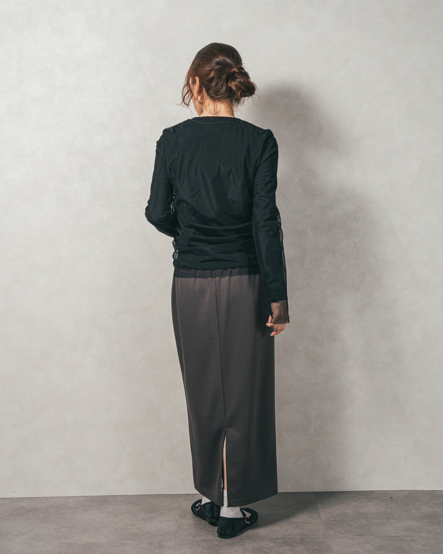 チュールトップスのシャーリングは くしゅっと寄せたギャザーが立体的。シンプルなアイテムに重ねるだけでこなれた雰囲気に。それぞれが独立して使えるセットアイテムなので、気分で自由に使い分けられるのが嬉しいポイント◎