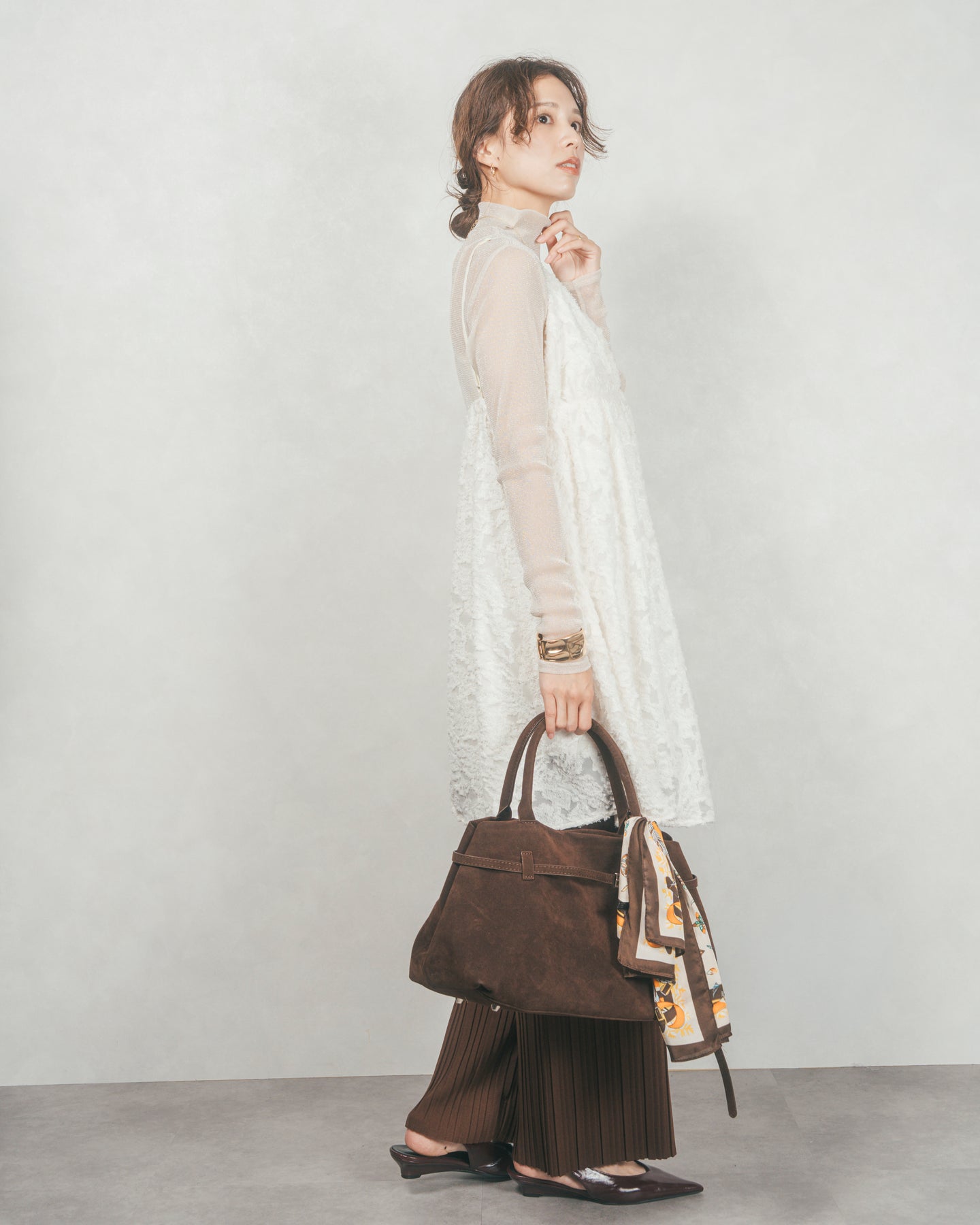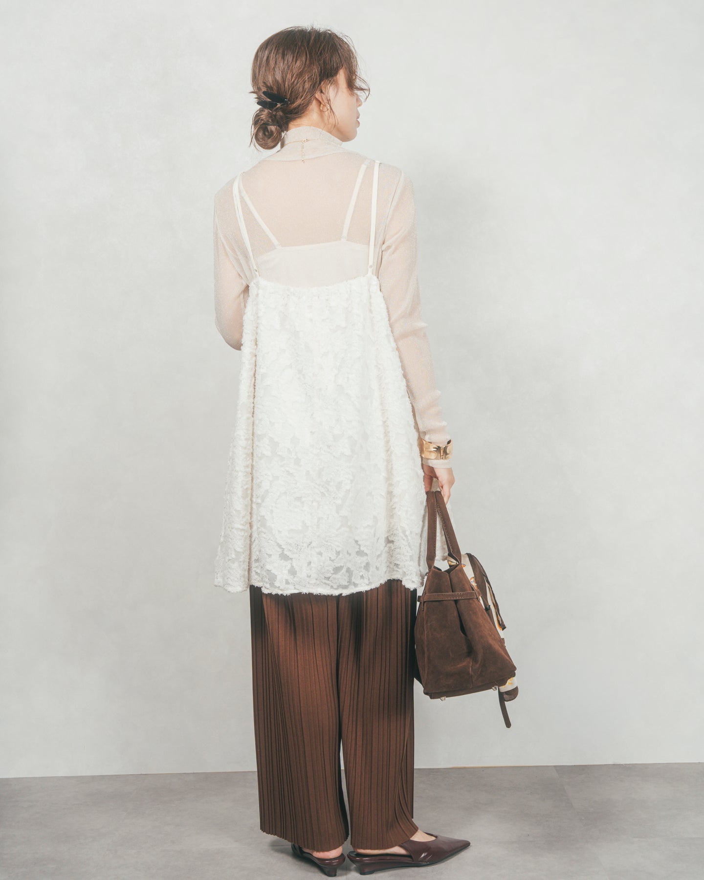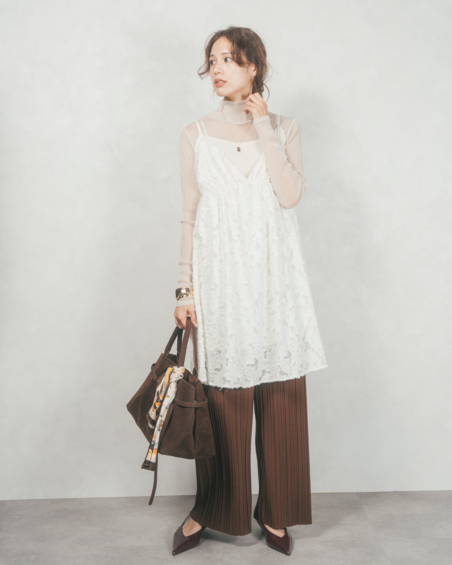 落ち感のあるしなやかな生地が脚のラインをまっすぐに整え、動くたびに揺れるプリーツが上品な印象をプラスしてくれます。ワイドすぎない程よいシルエットで、リラックス感がありながらもラフになりすぎない絶妙なバランス。