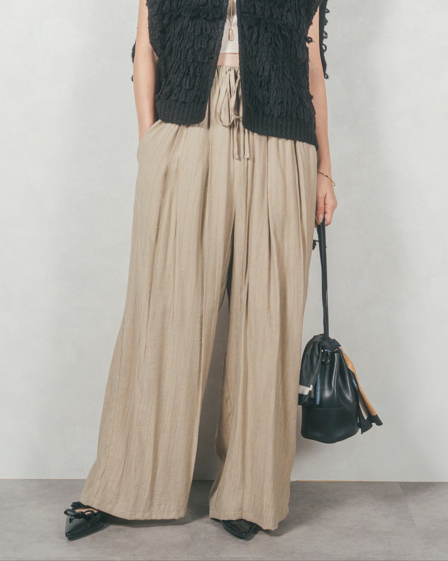 軽やかな落ち感と、ほんのり光沢感のある素材が魅力のワイドパンツ。ウエストはオールゴム仕様+ドロスト付きで、ストレスフリーな穿き心地ながら、シルエットはすっきり。たっぷりとしたギャザーが動くたびに揺れ、暑い季節でも涼やかな印象をキープします。腰まわりや脚のラインを自然にぼかしてくれるので、体型カバーできるのも嬉しいポイント◎