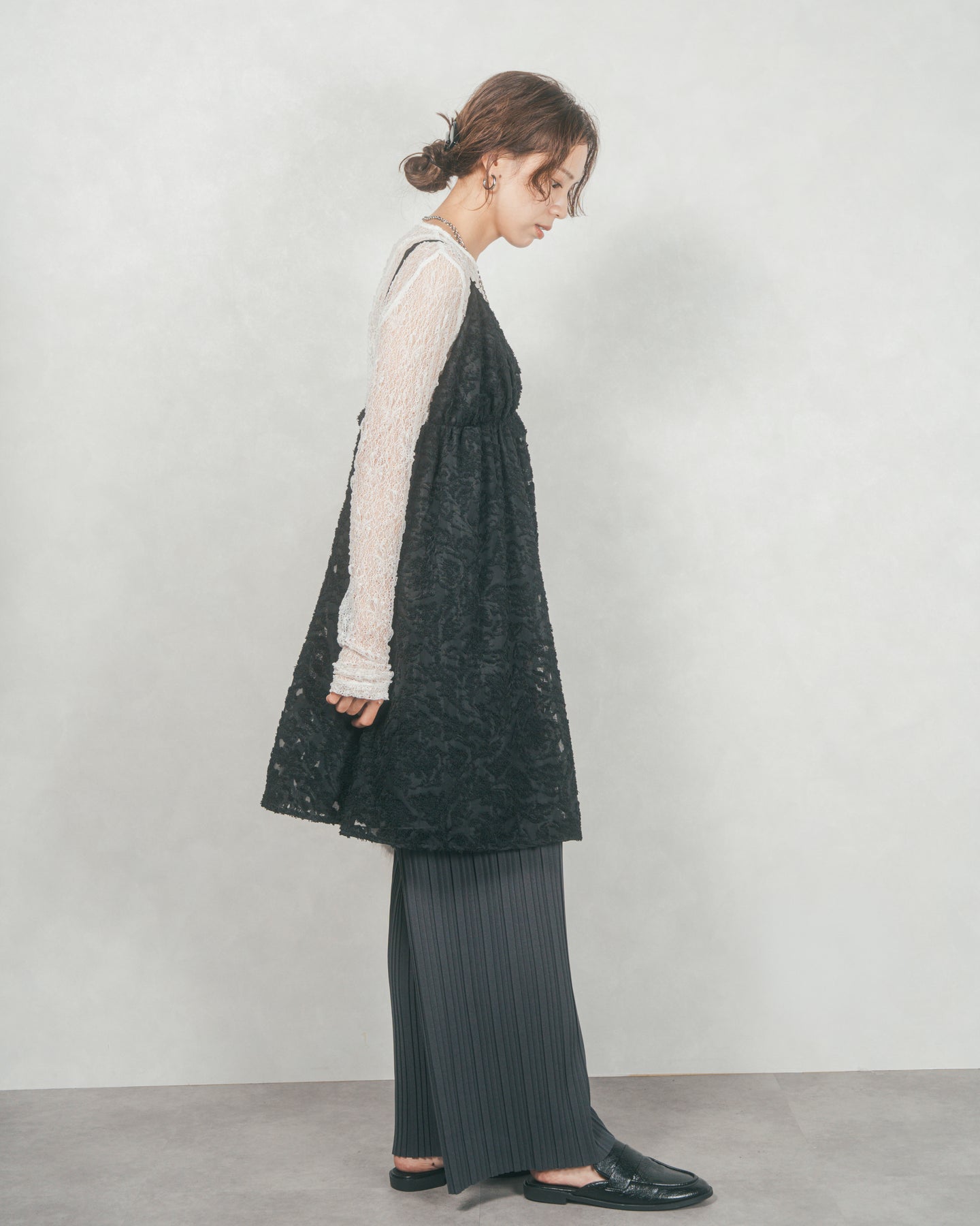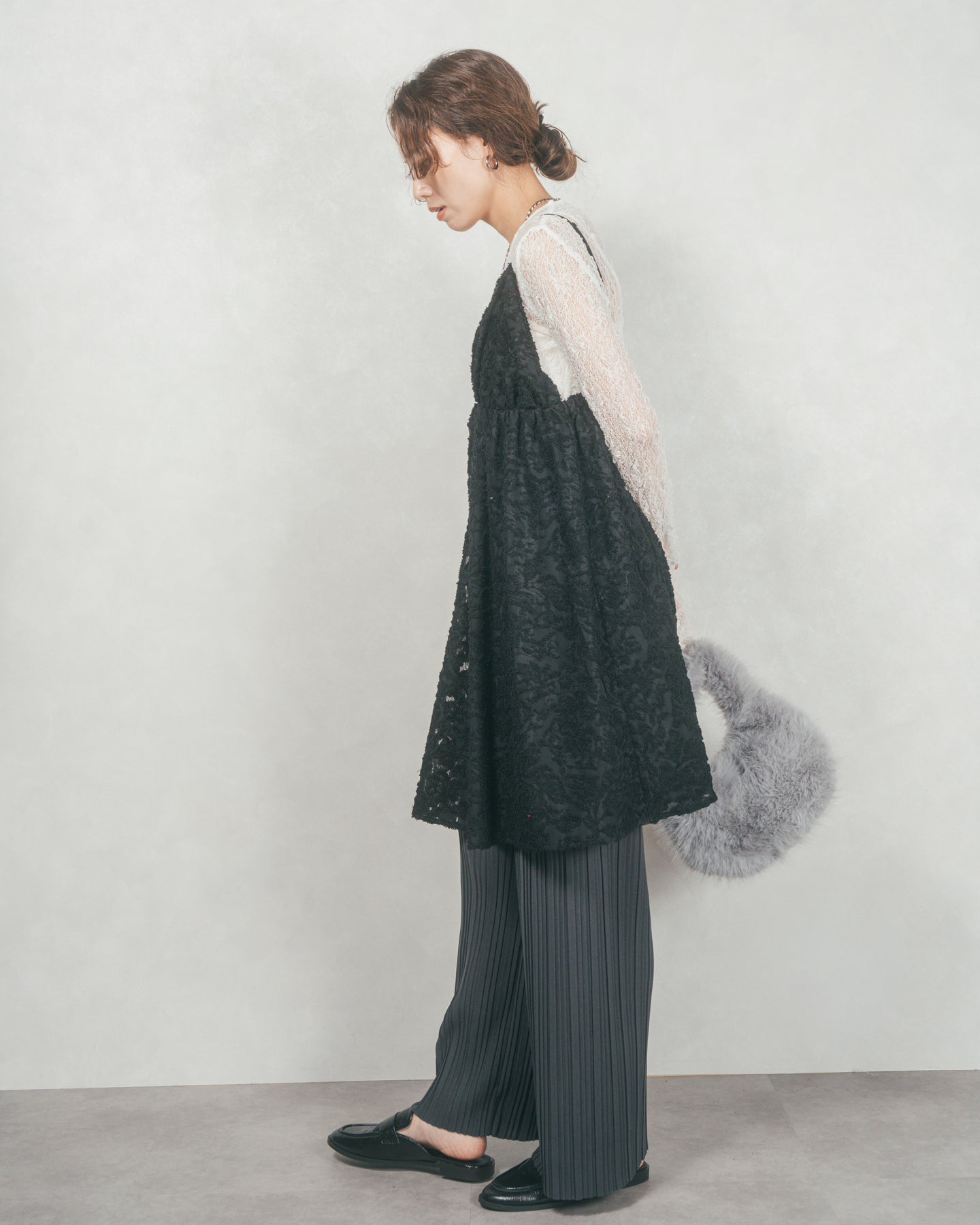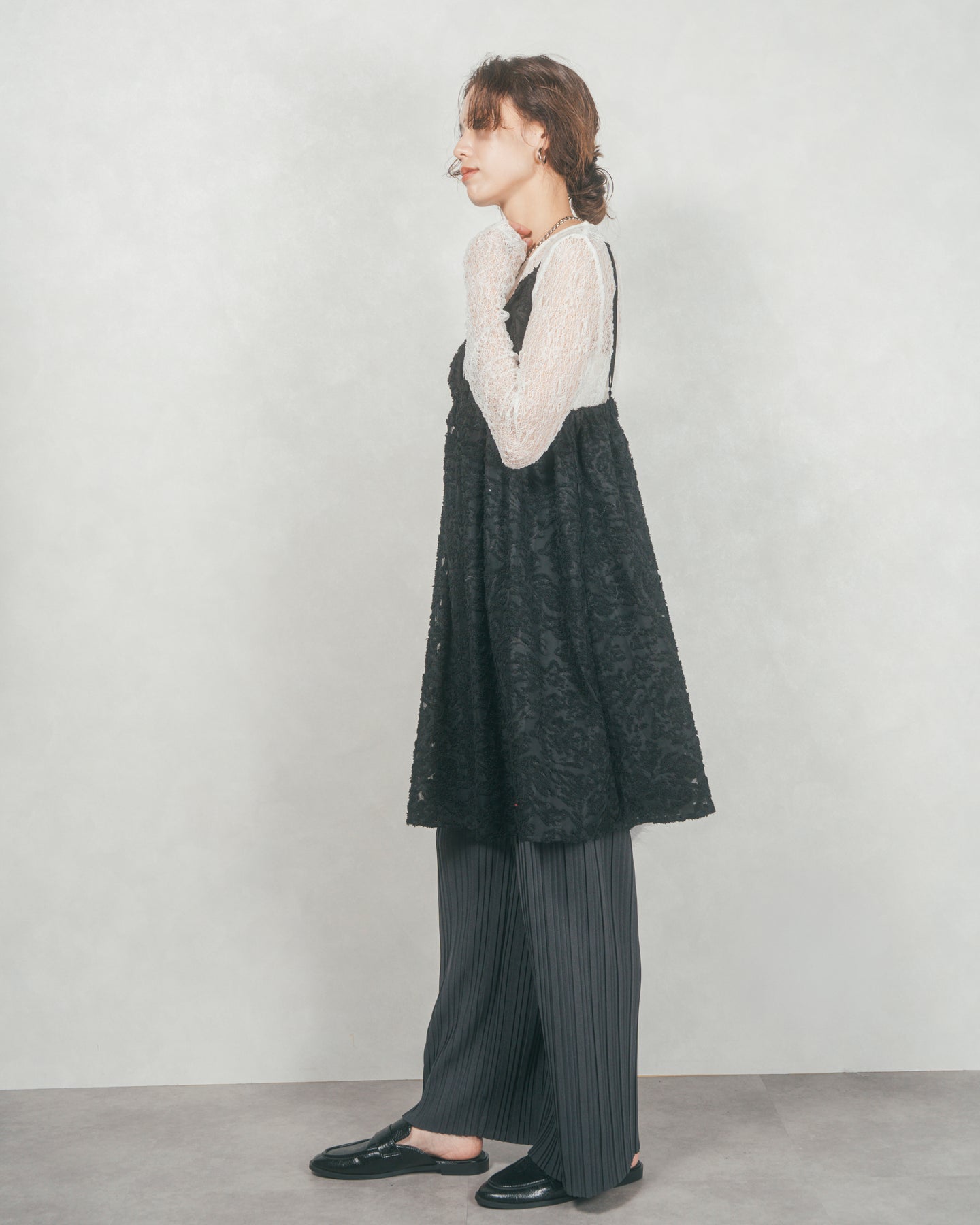 落ち感のあるしなやかな生地が脚のラインをまっすぐに整え、動くたびに揺れるプリーツが上品な印象をプラスしてくれます。ワイドすぎない程よいシルエットで、リラックス感がありながらもラフになりすぎない絶妙なバランス。