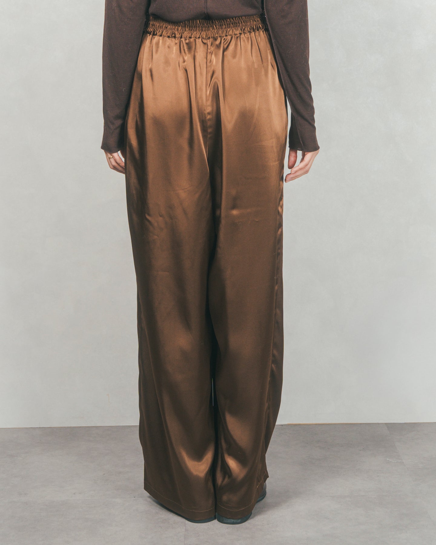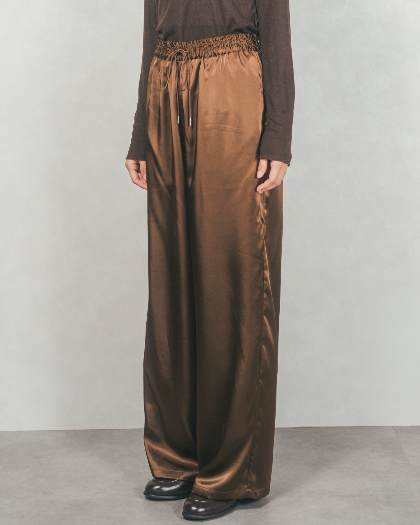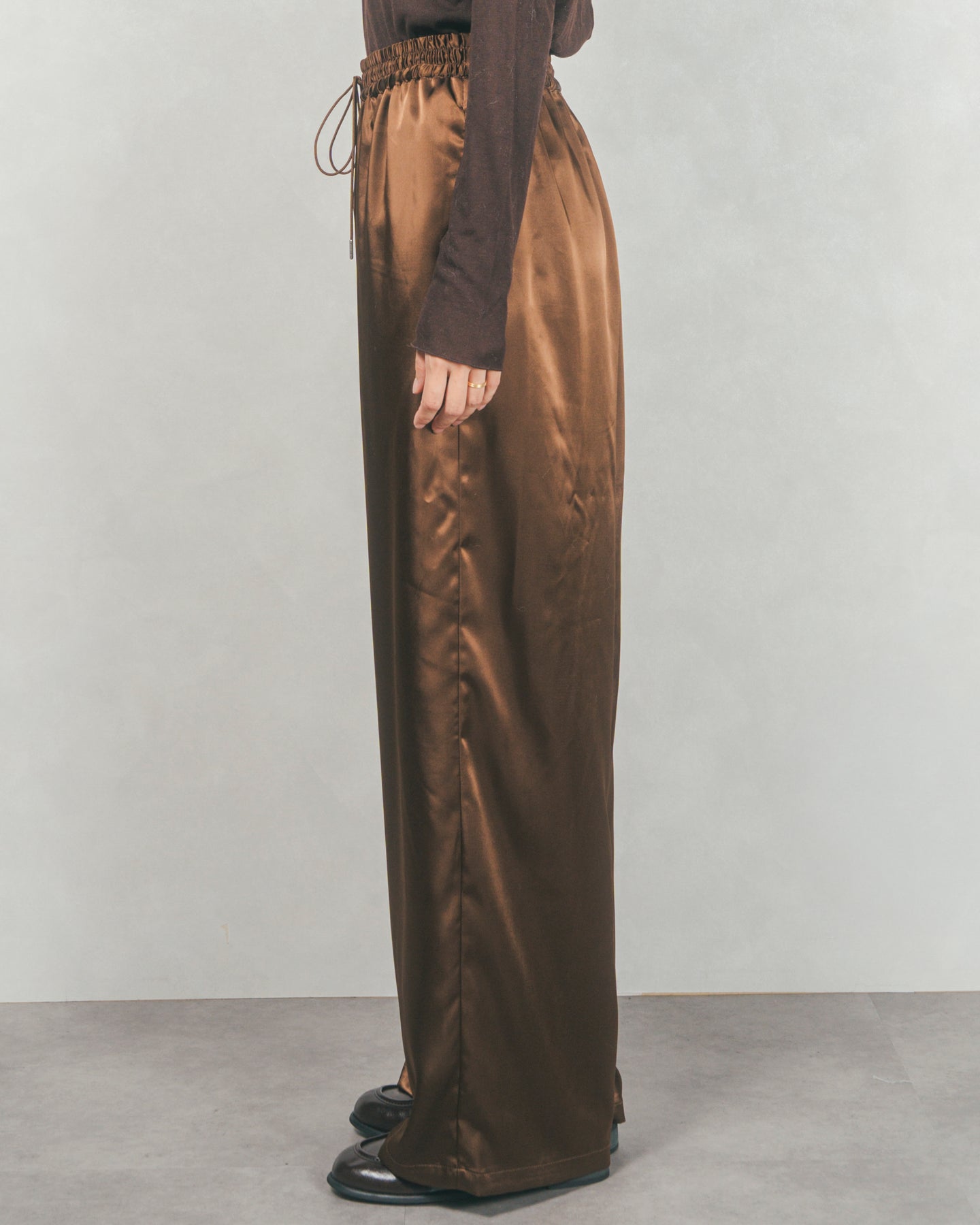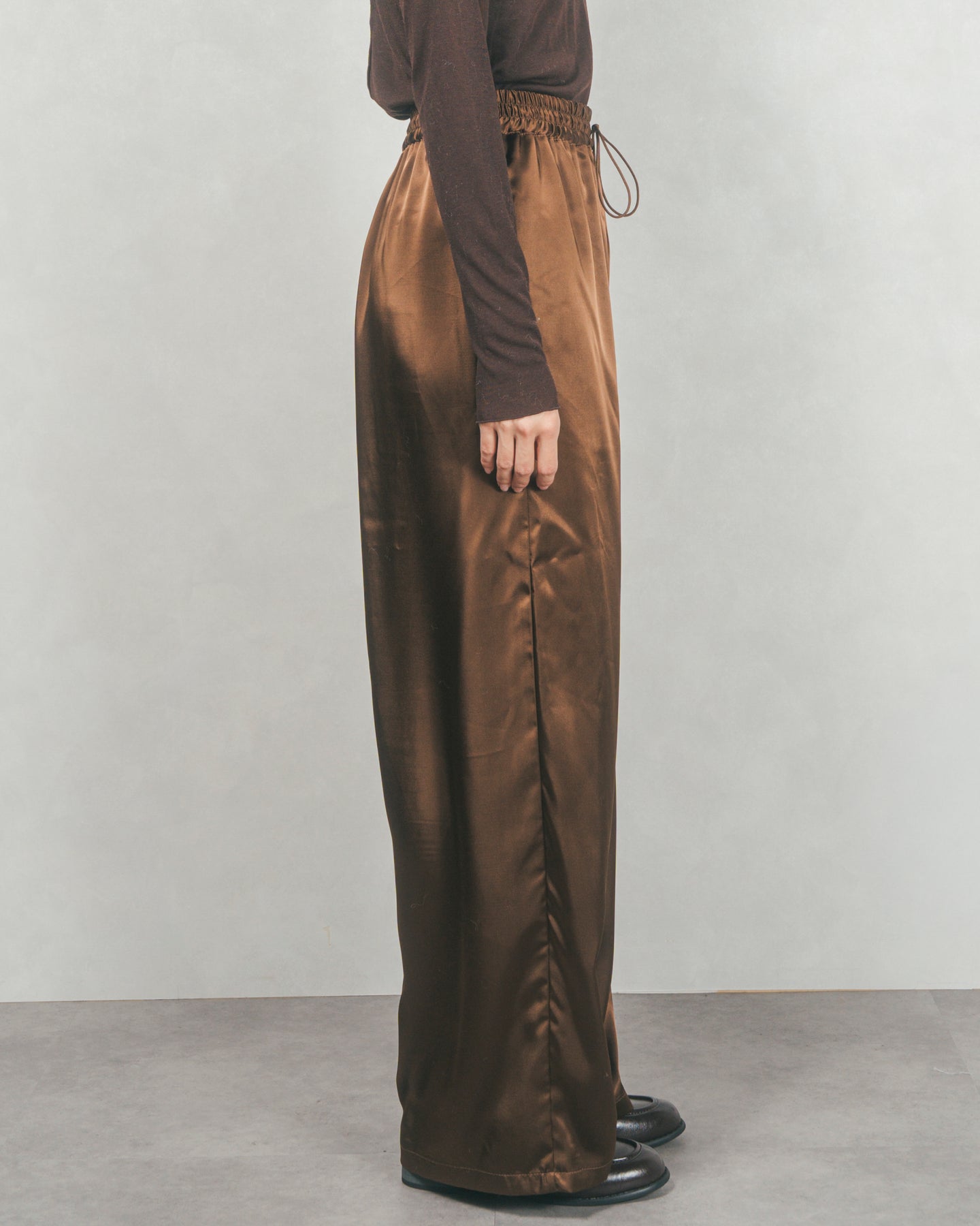 リラックス感のあるウエストゴム仕様に、ほどよくゆとりのあるストレートライン。気負わず着られるのに、どこか品が漂うのはサテンならではの表情豊かな素材感のおかげ。