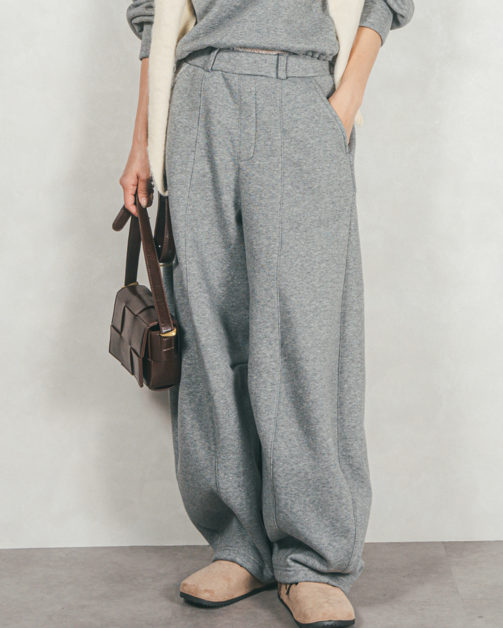 ボリューム感やシルエットの新鮮さで注目を集めている、カーブシルエットのスウェットパンツ。ゆったりとした分量感が脚のライン拾わず、体型カバーがあるのも嬉しい◎ ウエストゴムの仕様で、リラックスムードたっぷりなアイテムです。