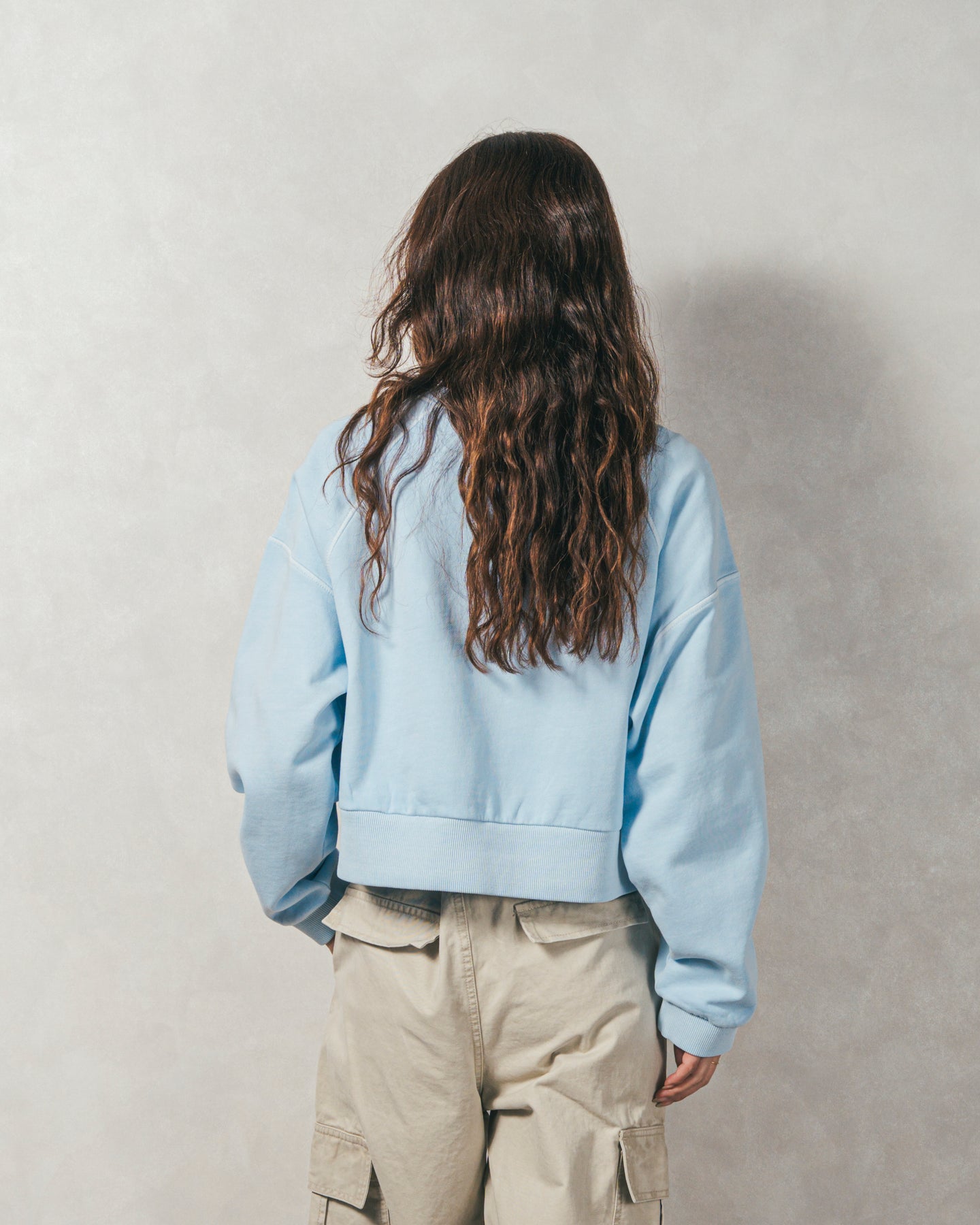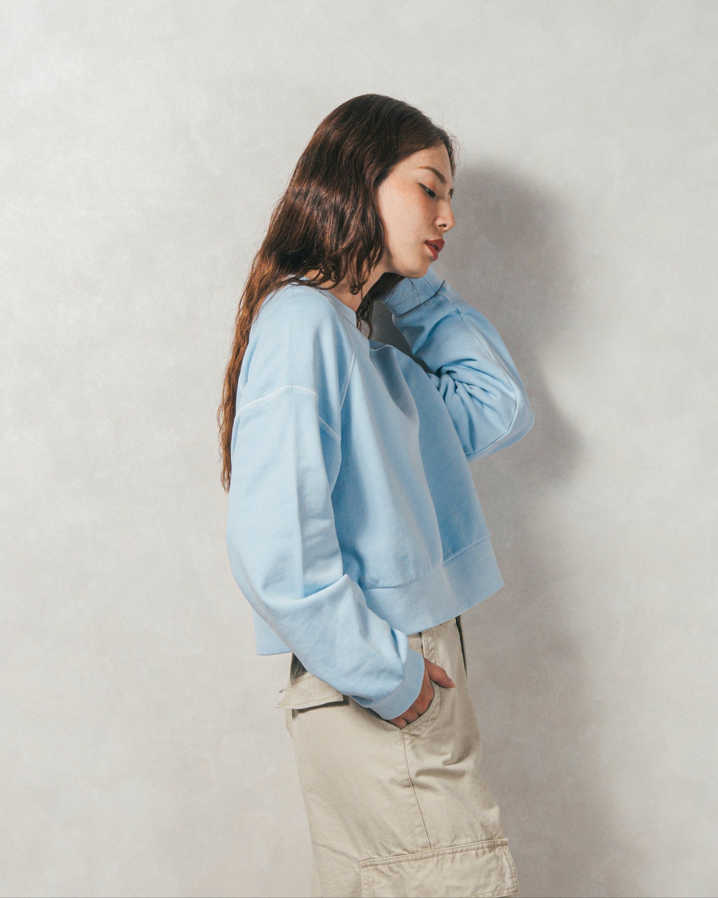 【Fabric】 素肌に触れても気持ちいい、コットン100%素材。 表面の毛羽立ちを抑えているため、手触りがなめらか。程よい厚みでスウェット特有のカジュアルさは残しつつもラフになりすぎない、きれいめ質感です。