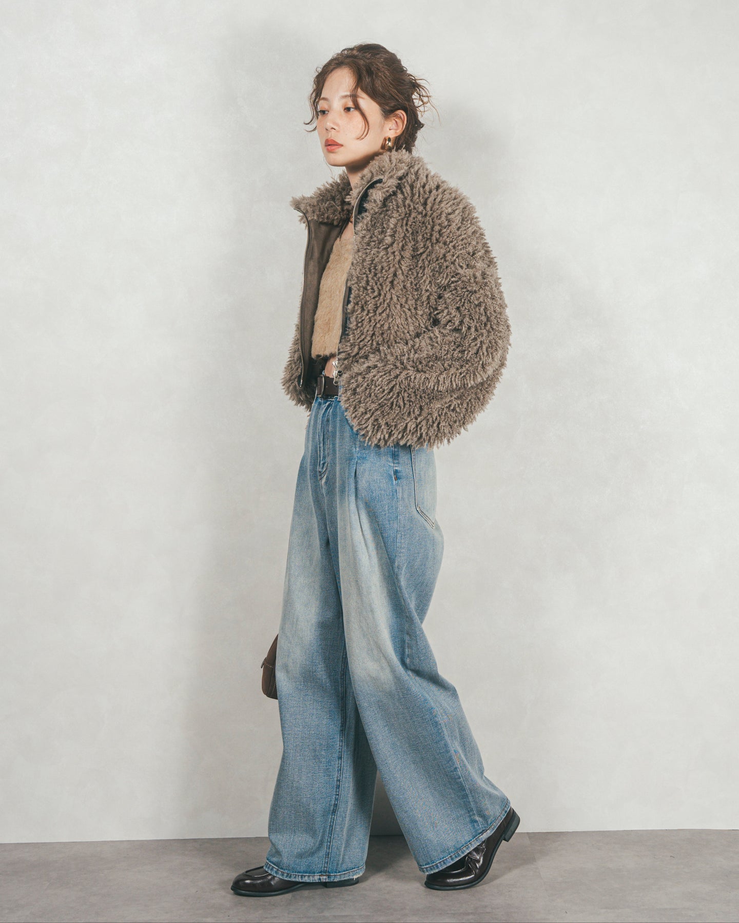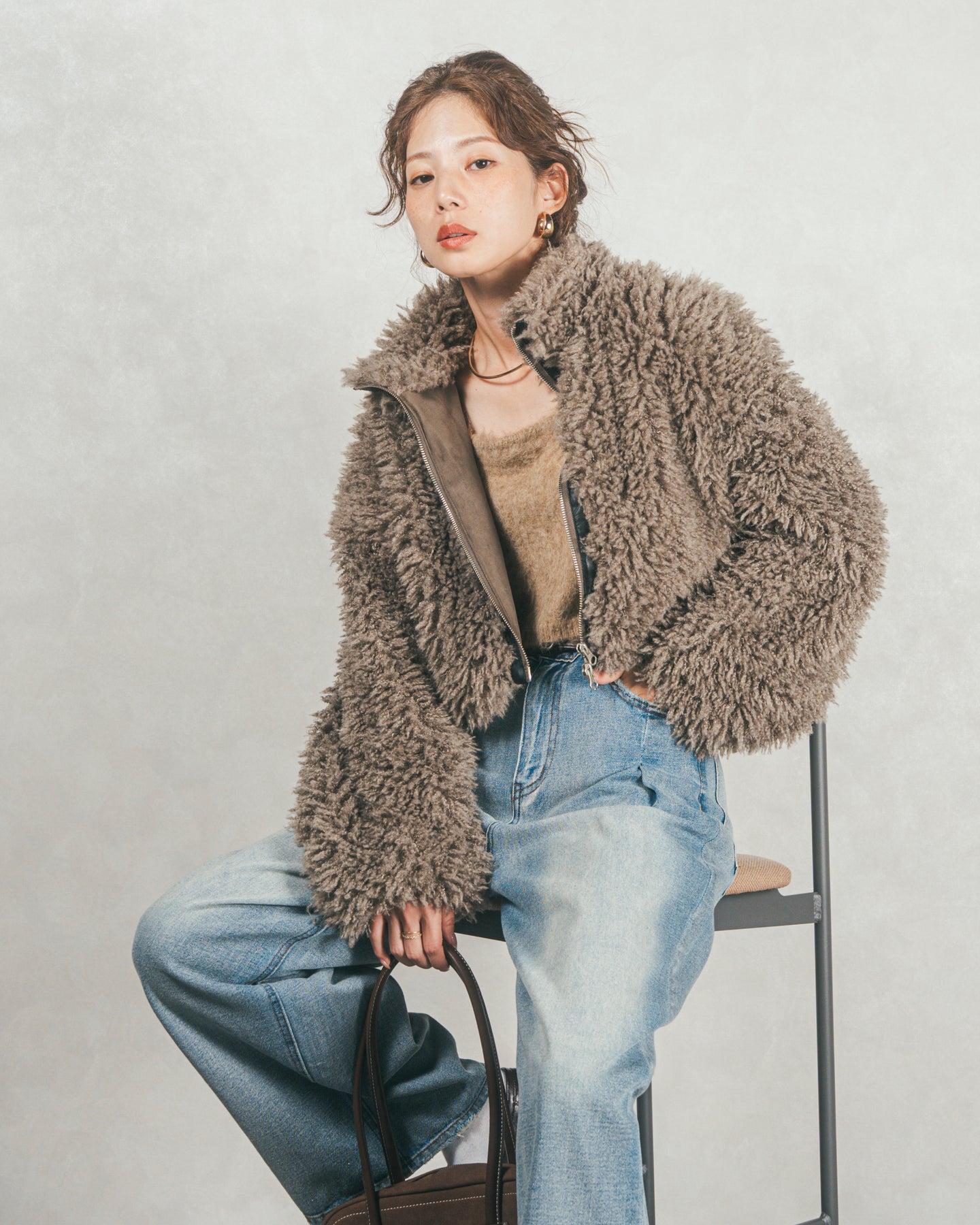 着丈は短めのクロップド丈。ダブルジップなので、もこもこなのにすっきり見えるシルエットがこだわりのポイント。さらに首元までしっかりカバーしてくれるスタンドネックにすればマフラーいらずで着られます◎