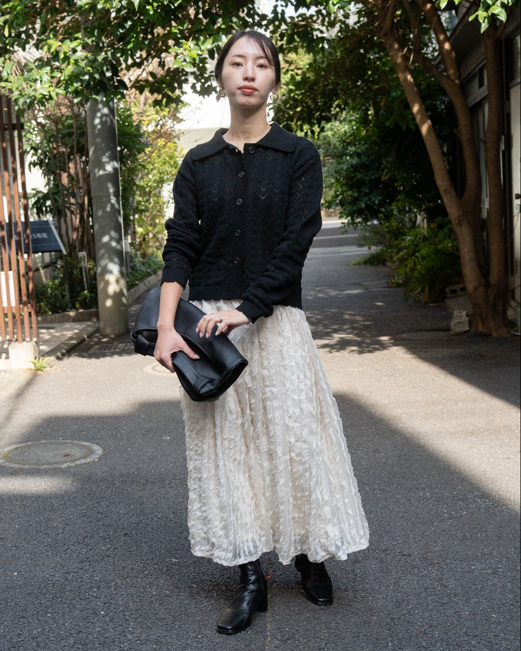 きちんと感のある「襟付き」デザインがポイント。袖口や裾が波型のデザインになっており、細部までかわいく仕上がっています。コンパクトすぎず緩すぎない絶妙なサイズ感で、ボトムスを選ばずバランスよく着こなせます。