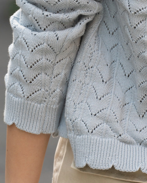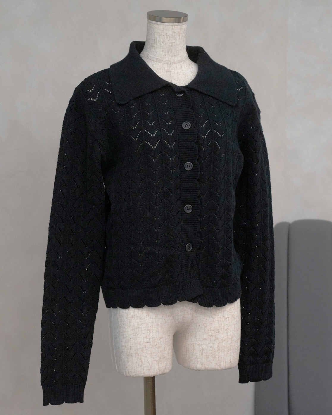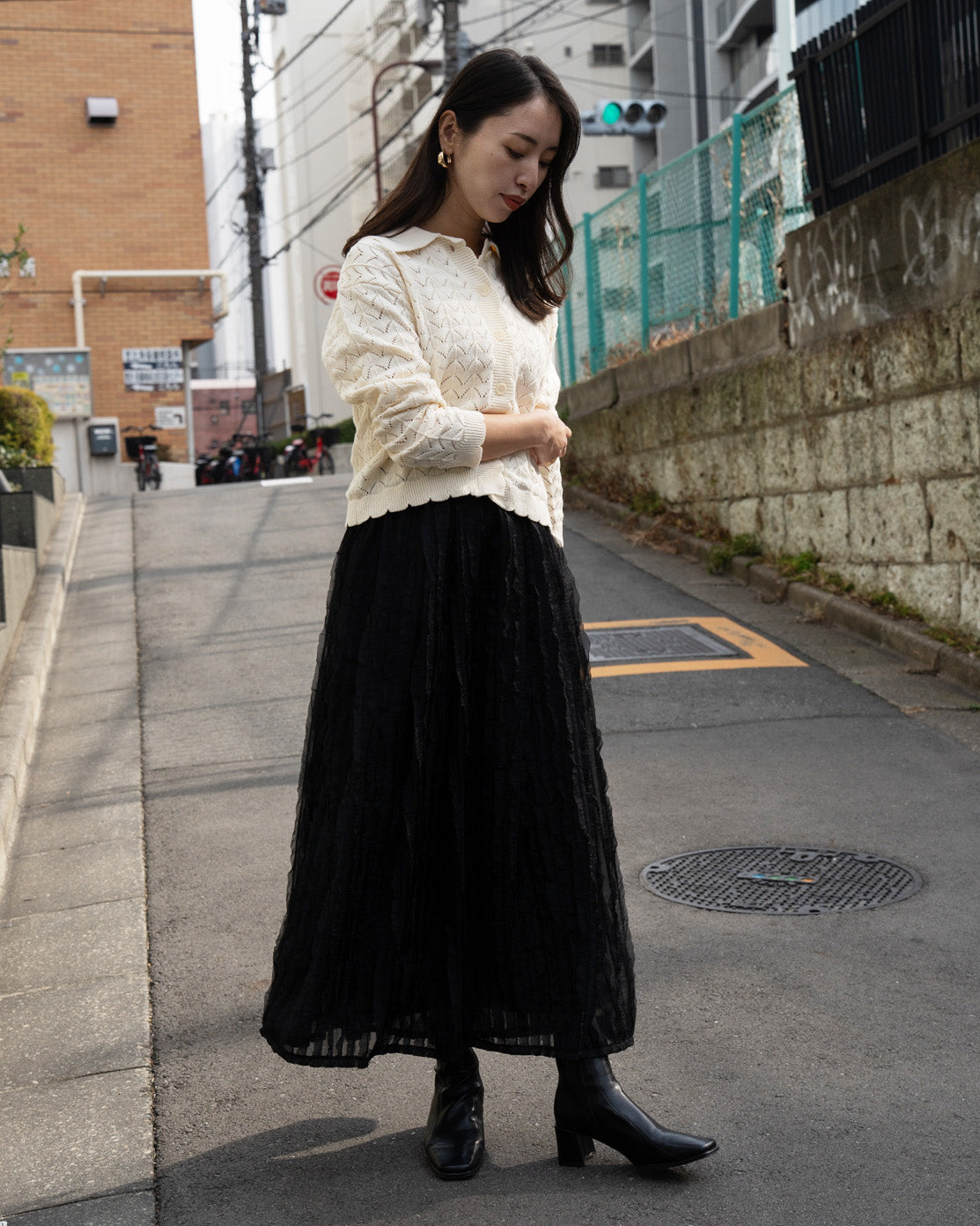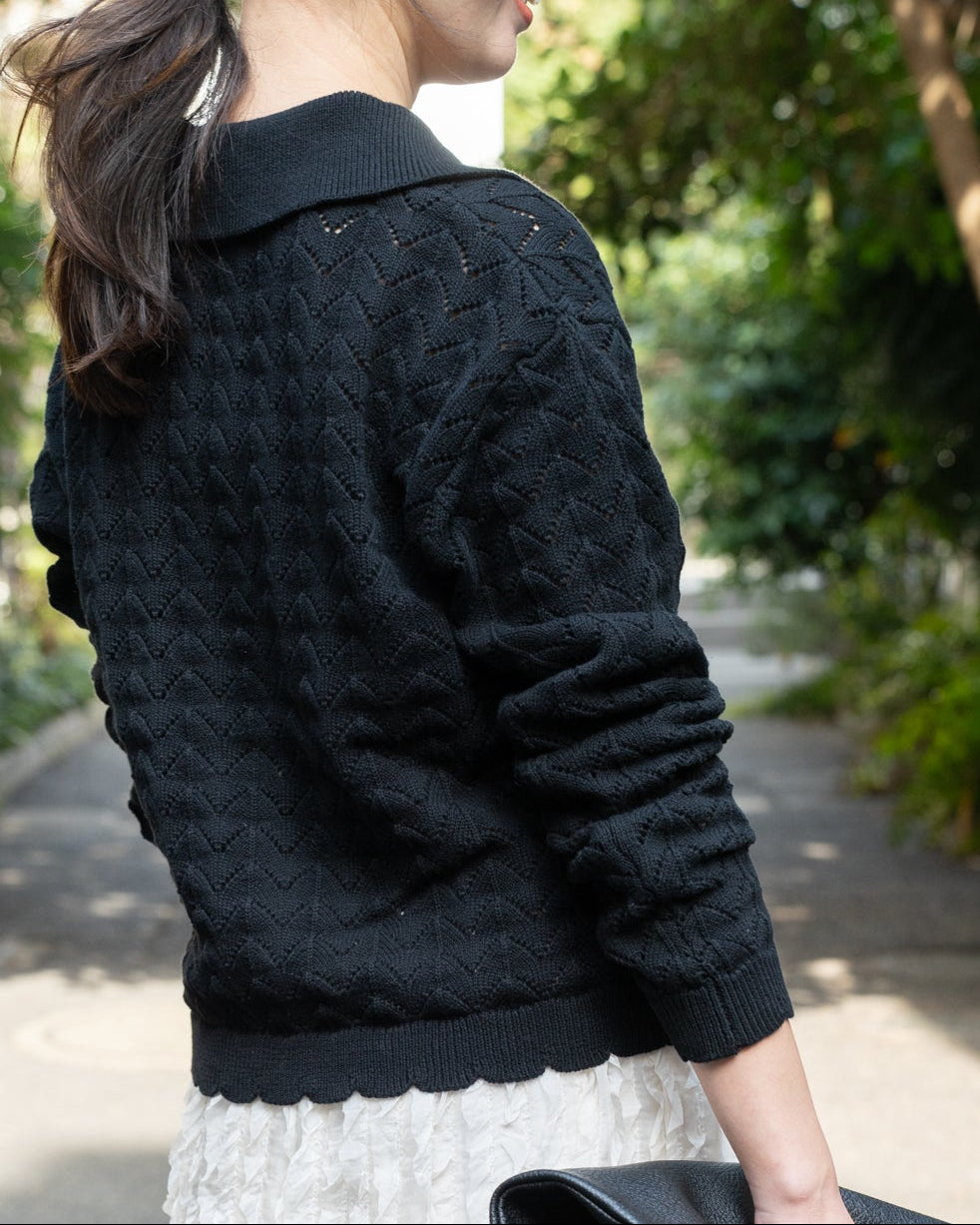 全体に施された透かし編みデザインが、軽やな素材感。 程よい透け感で、春先から秋口までロングシーズン着られます。