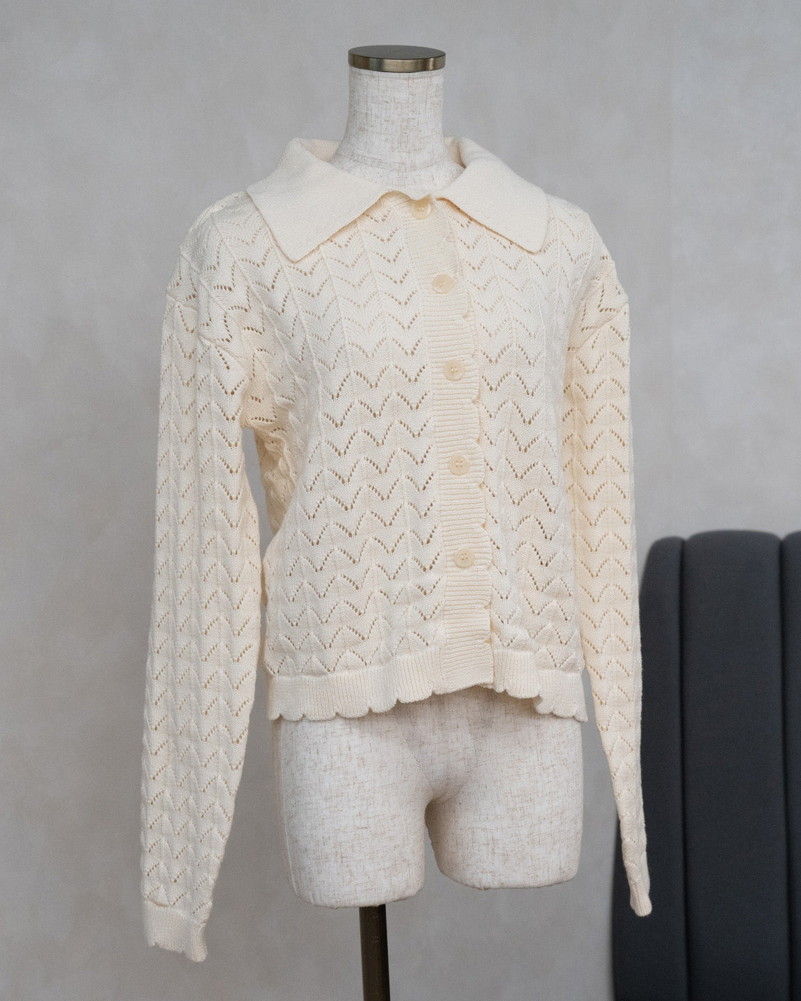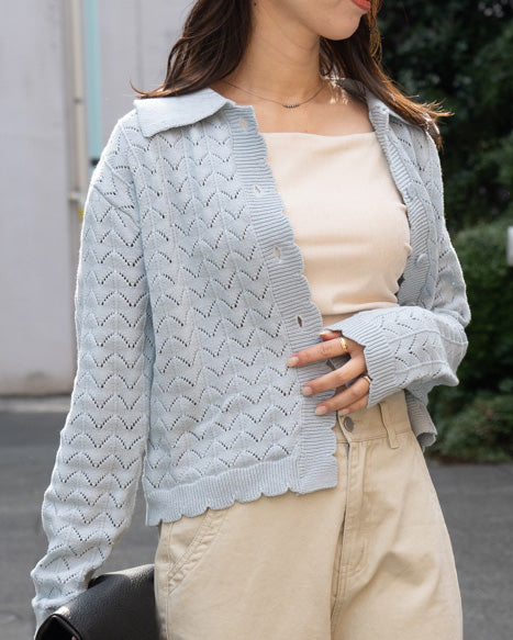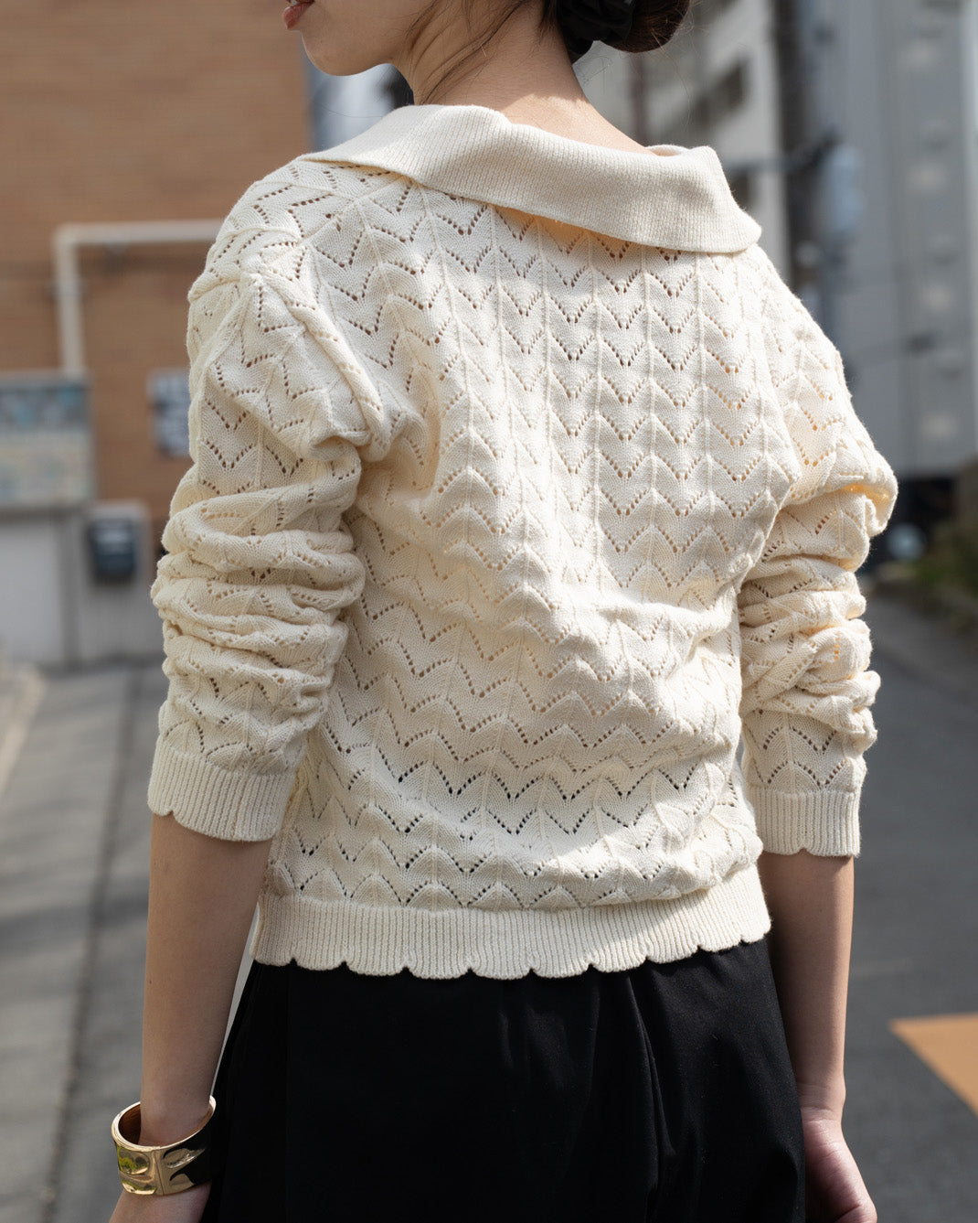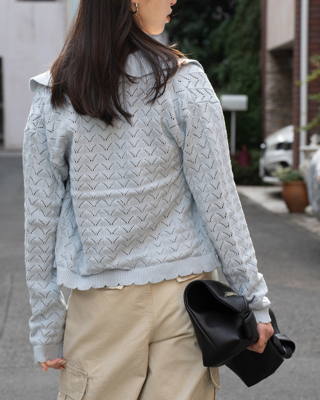 春のムードを盛り上げる、ナチュラルな雰囲気の透かし編みカーデ。