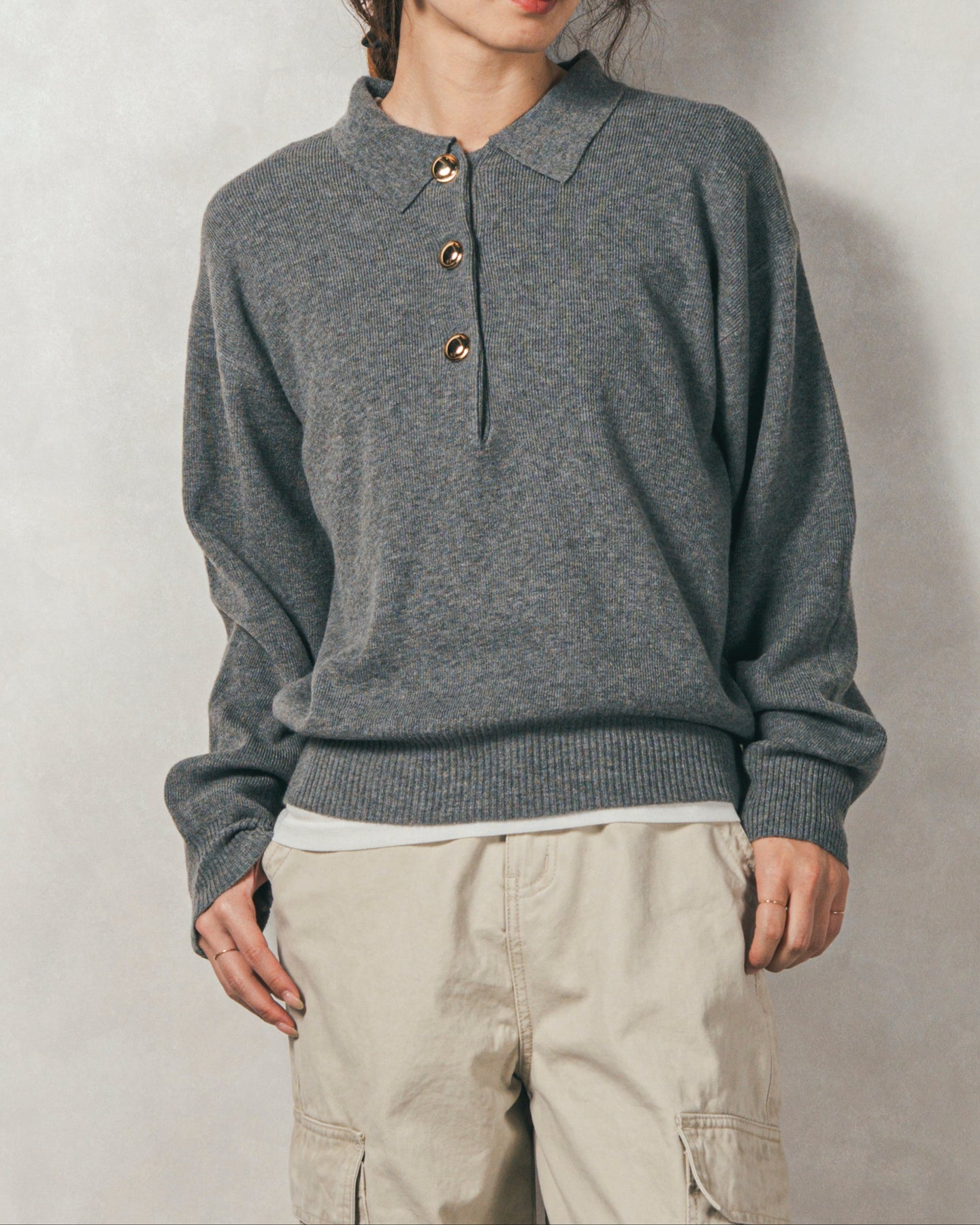大きな金ボタンがアクセサリーのような存在感。クラシカルカジュアルなポロニット