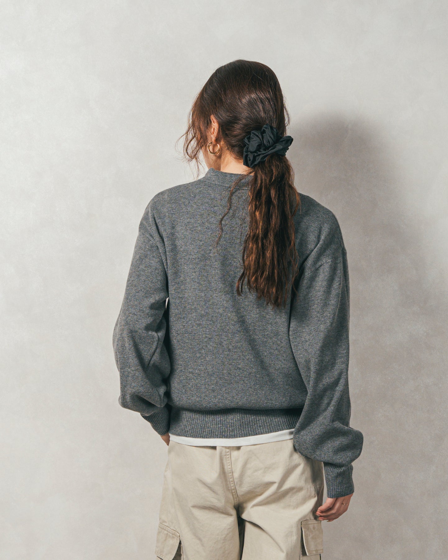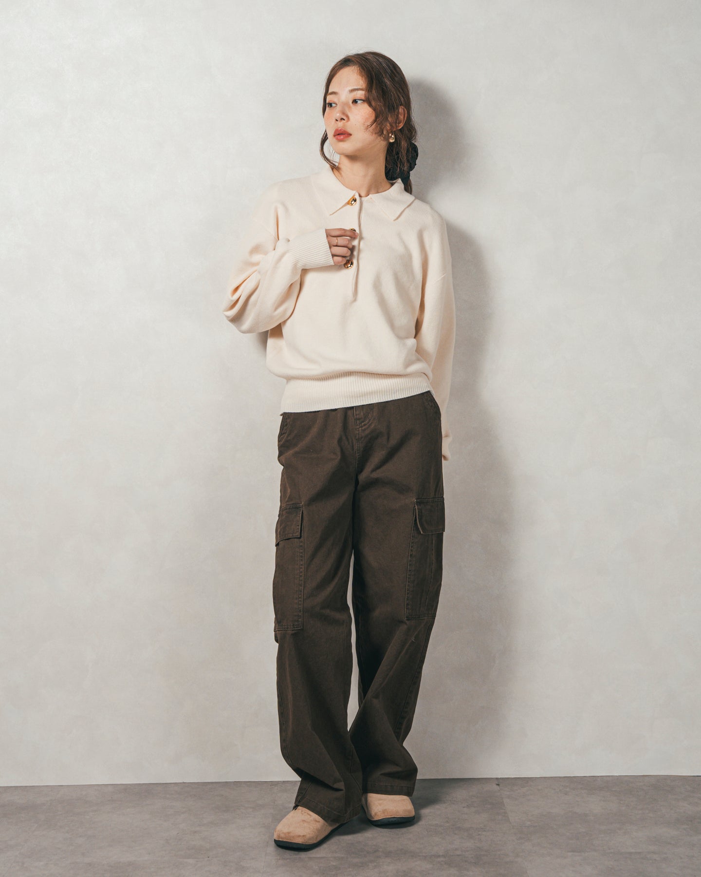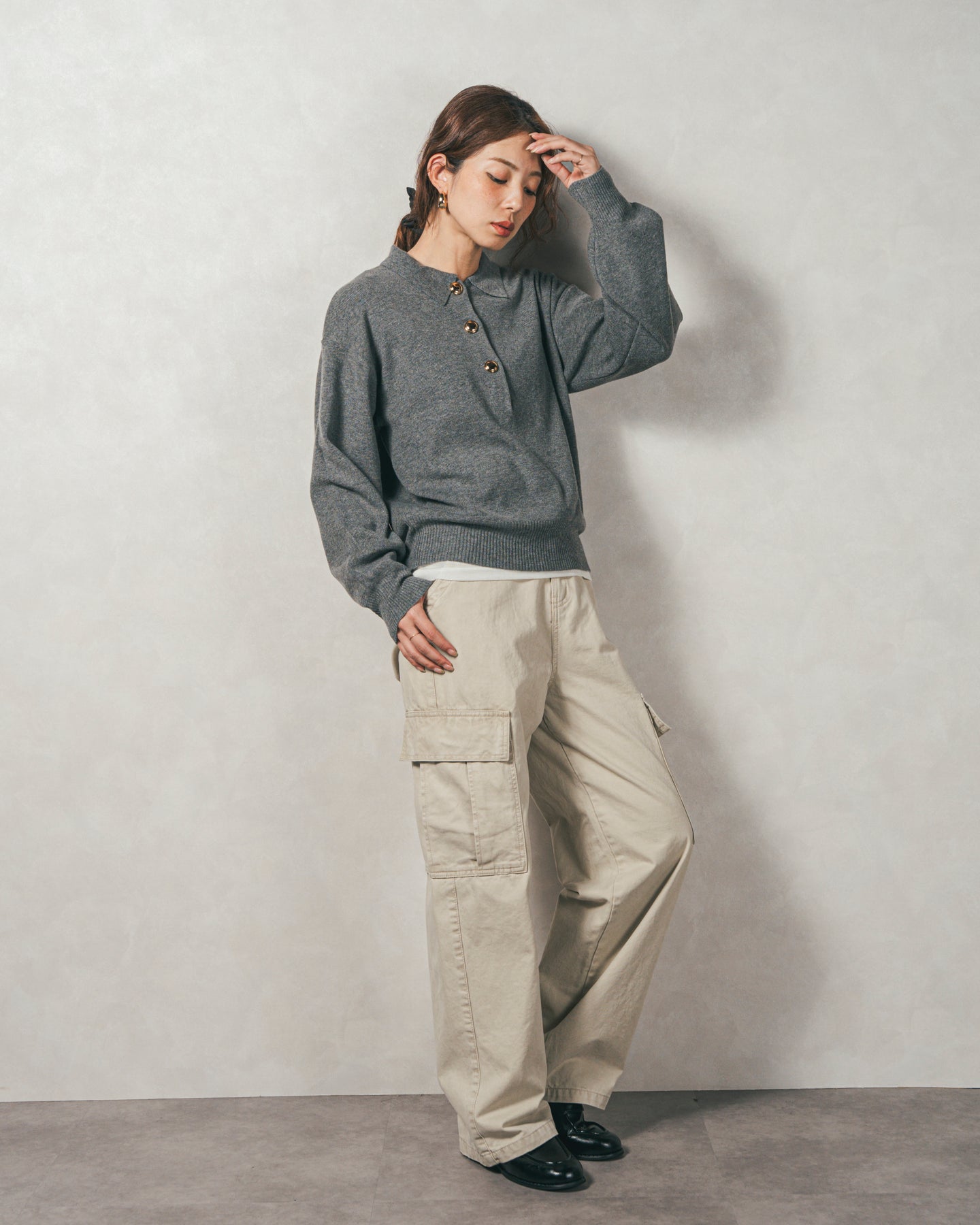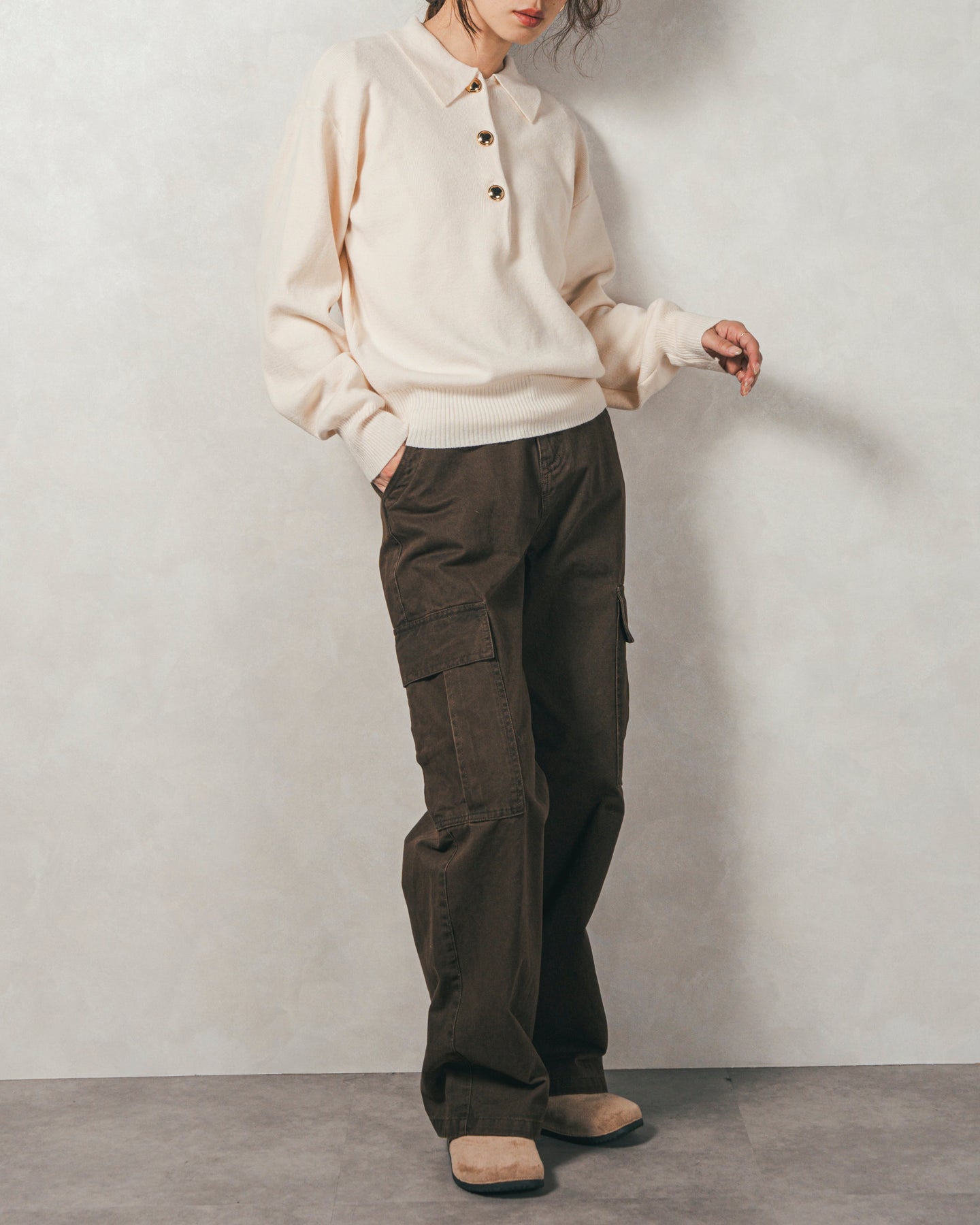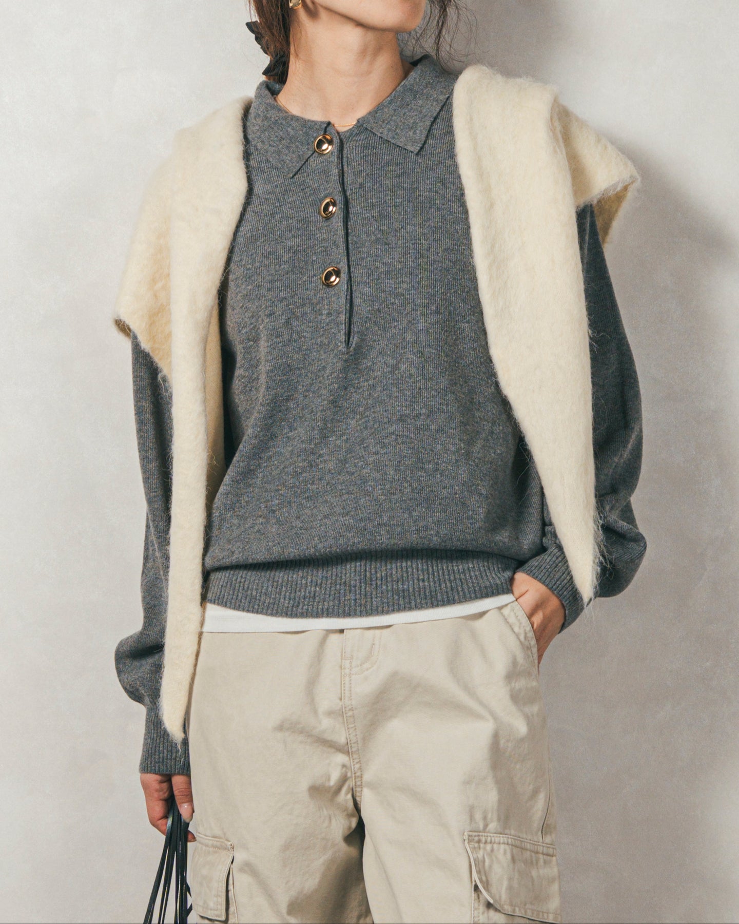 【Design】 スポーティーになりがちなポロニットですが、存在感のある金ボタンでクラシカルなカジュアルさに。袖口はリブで引き締め、袖はぽわんとしたボリュームスリーブにすることで、手元にニュアンス感をプラス。シンプルなのにボタンがアクセ代わりで地味にならない、技ありニットです。