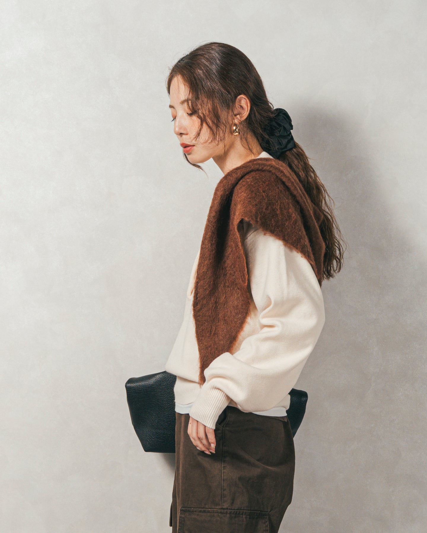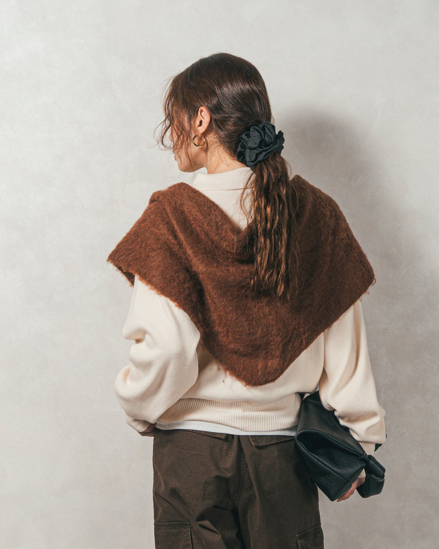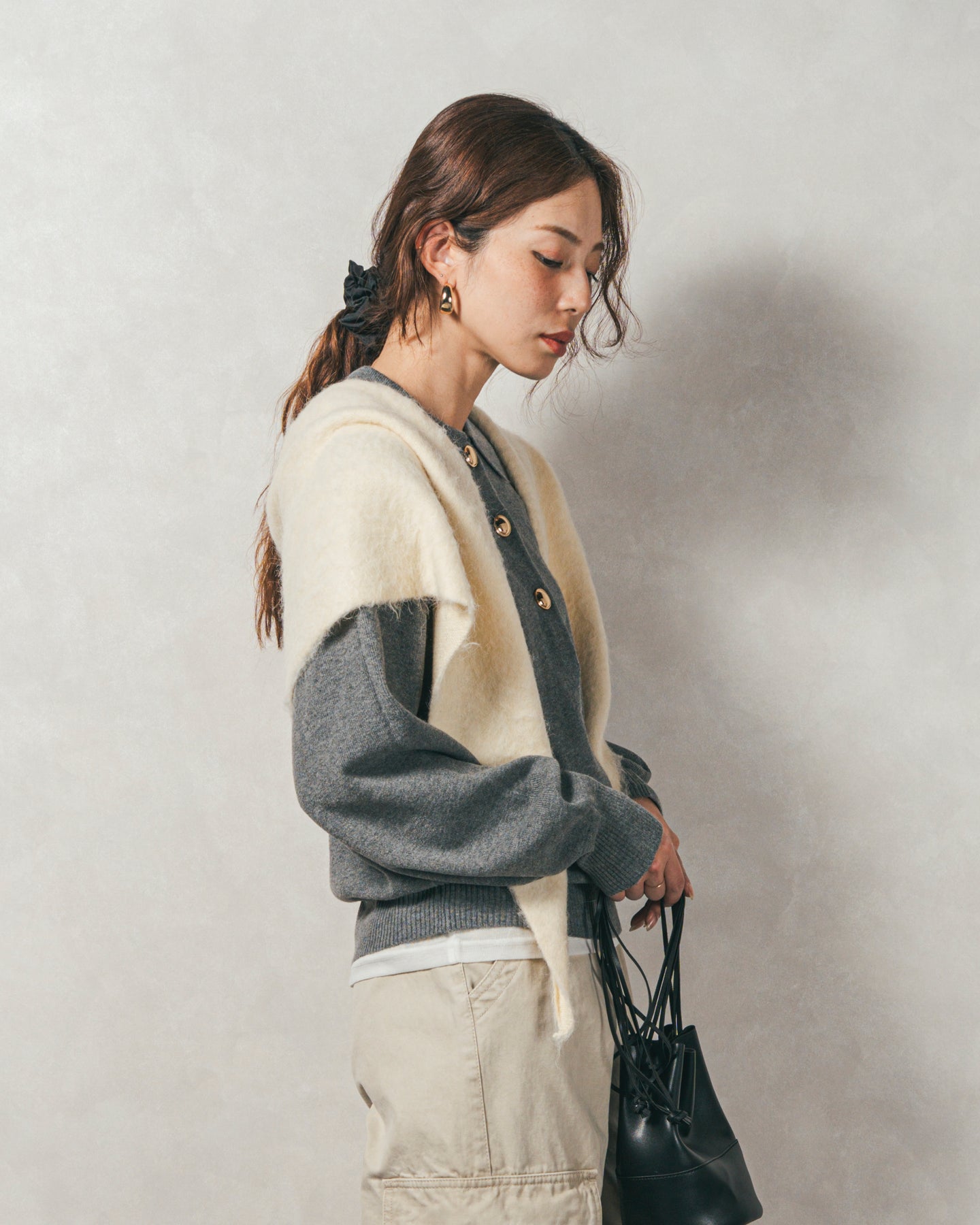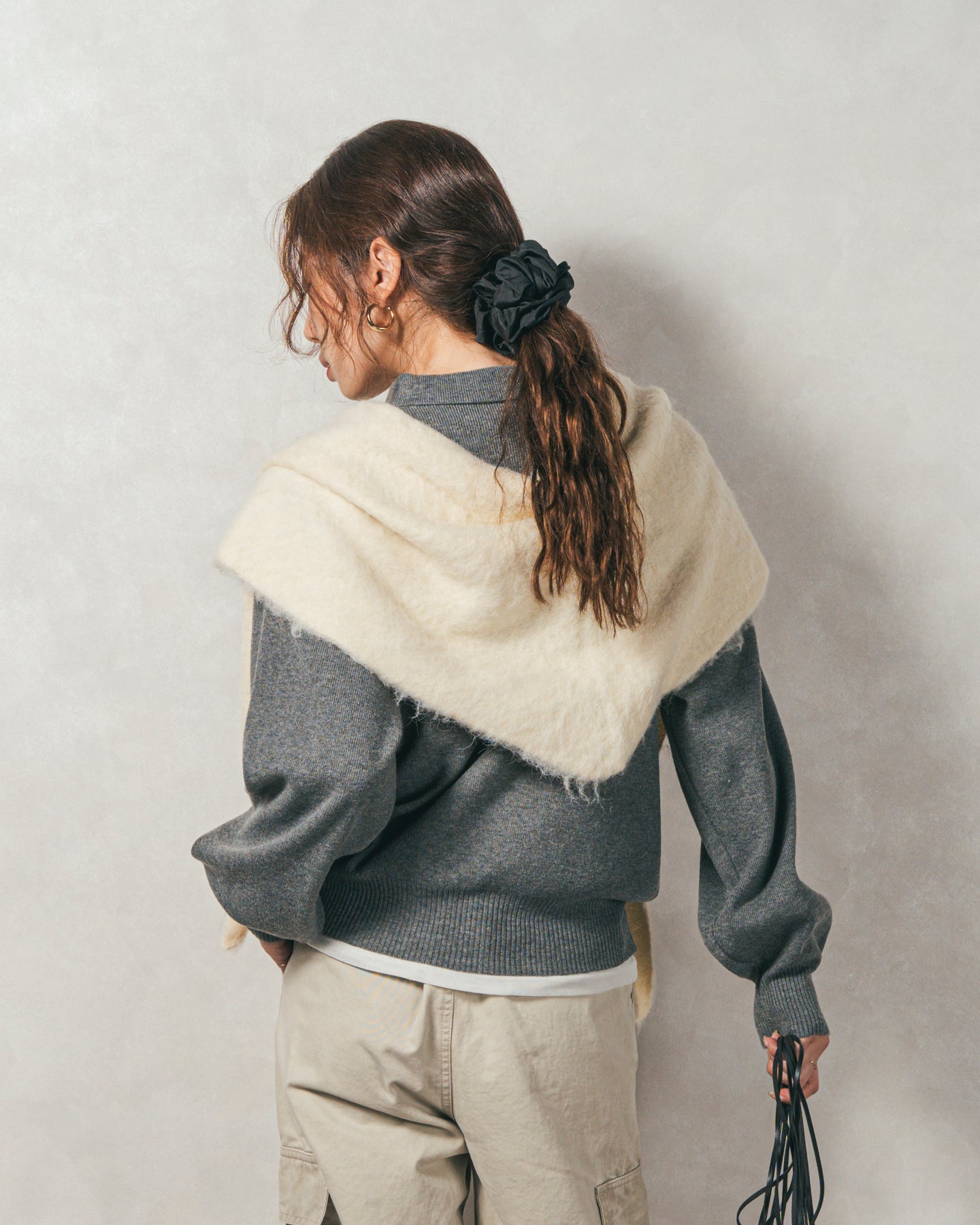 【Fabric】 ふんわりと包み込まれるような柔らかさのニット素材。 程よい厚みがありながらも着膨れせず、すっきりとしたシルエットを保ちます。チクチクしにくい滑らかな質感で、素肌に触れてもストレスフリーです。