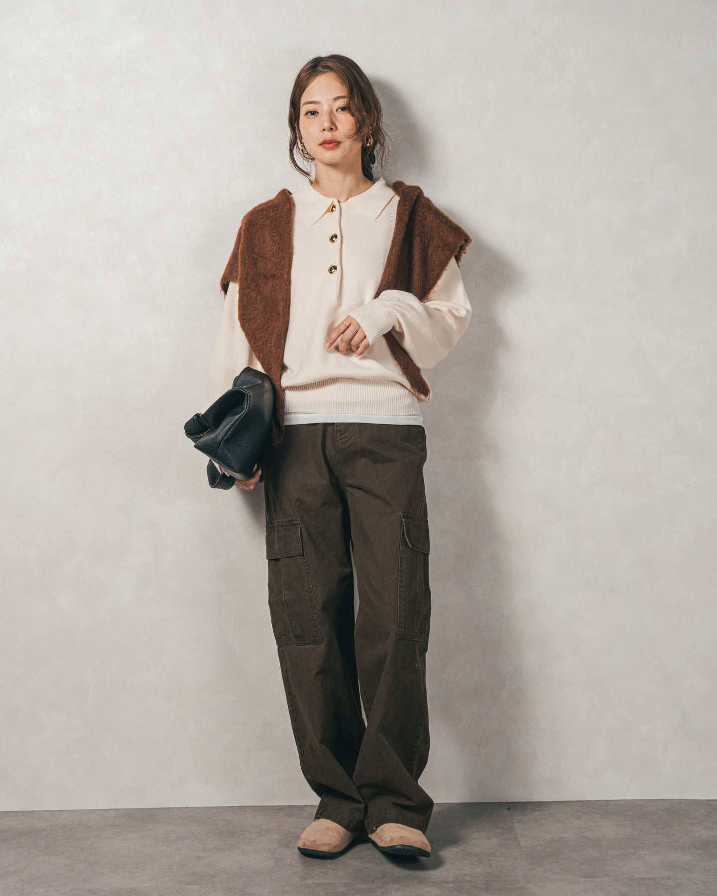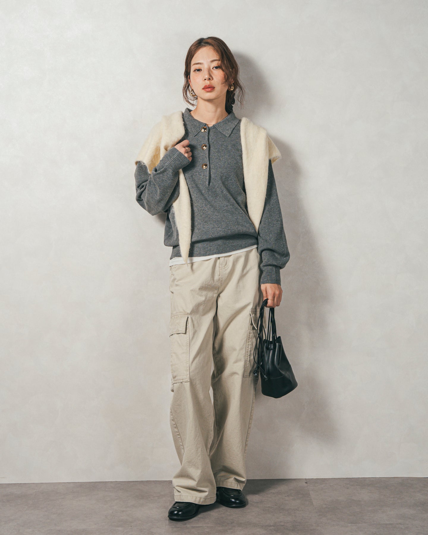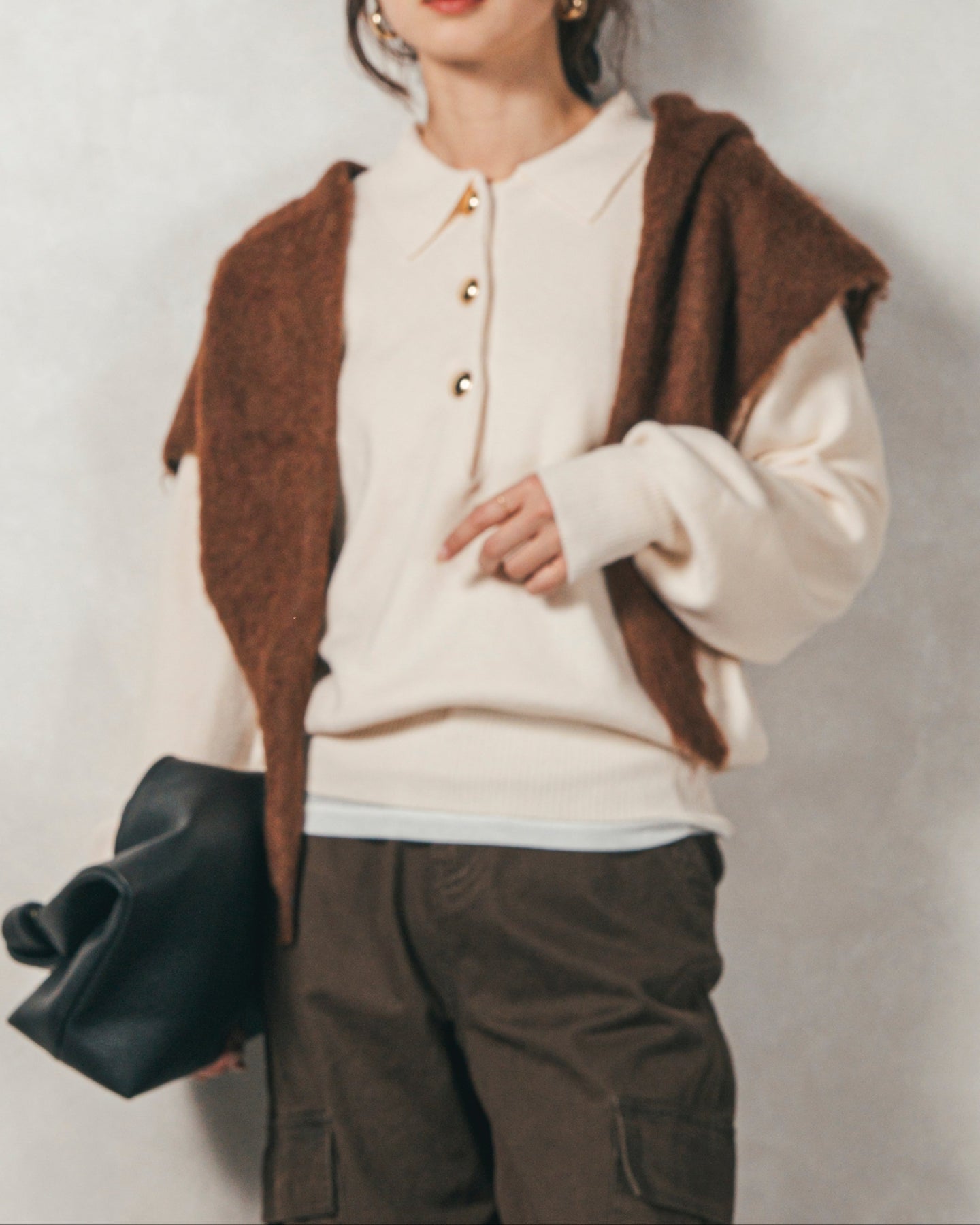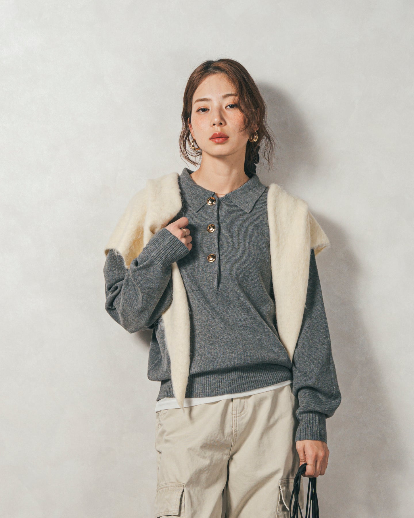 【Styling】 ボタンを全て留めてGood Girl風に着こなすのはもちろん、1〜2個開けてVネック風にすれば、抜け感のあるスキッパー襟としても楽しめます。