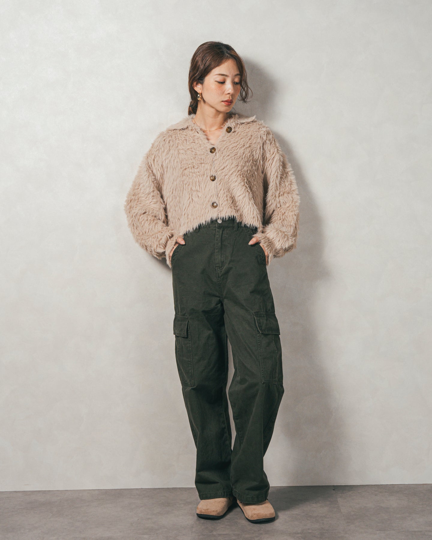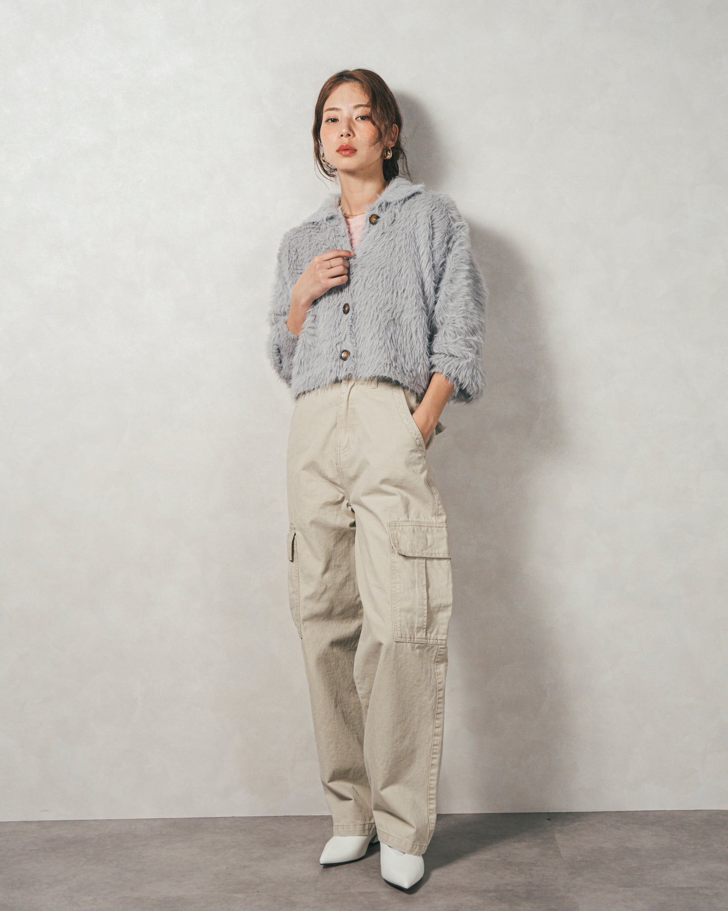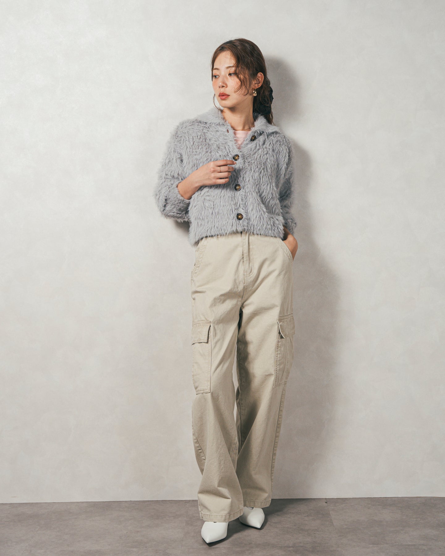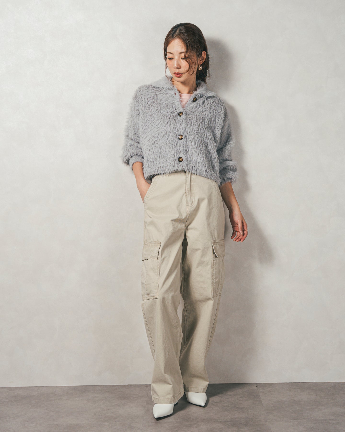 [SET]フェザーヤーン 衿付きカーディガン+ピグメントツイルカーゴパンツ(2SET)