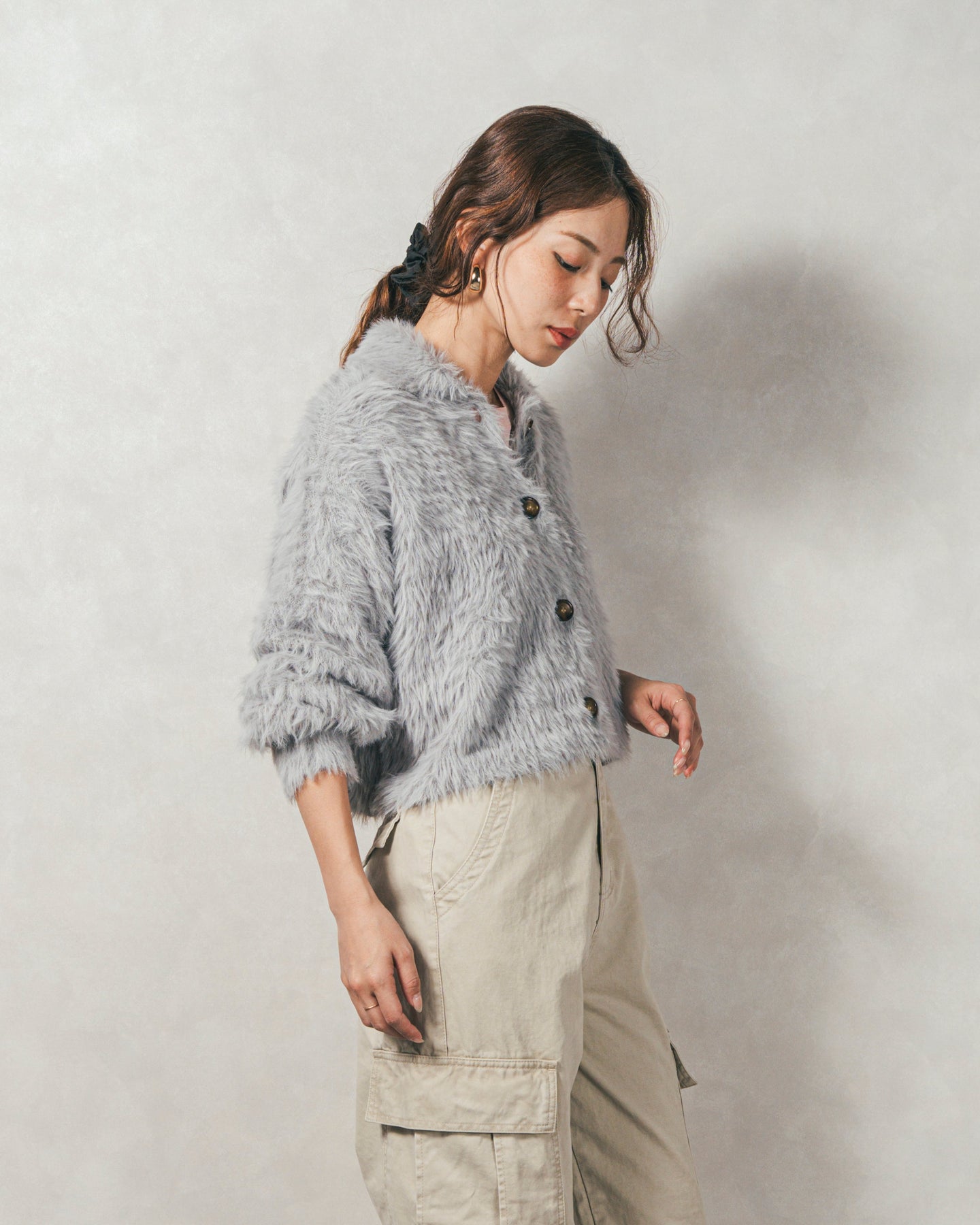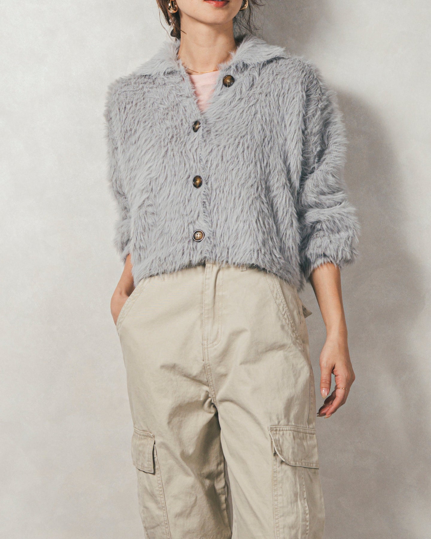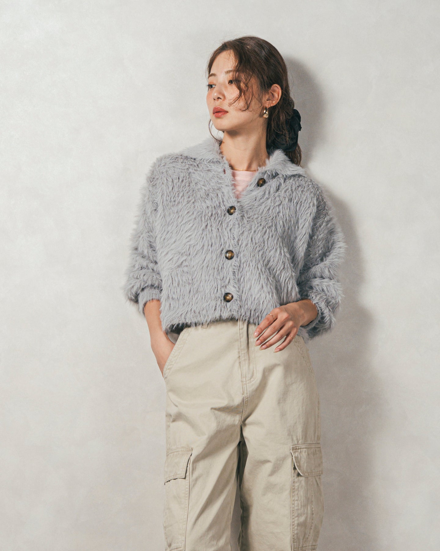 ボリューミーになりすぎない、ふわふわフェザーのトレンドカーデ