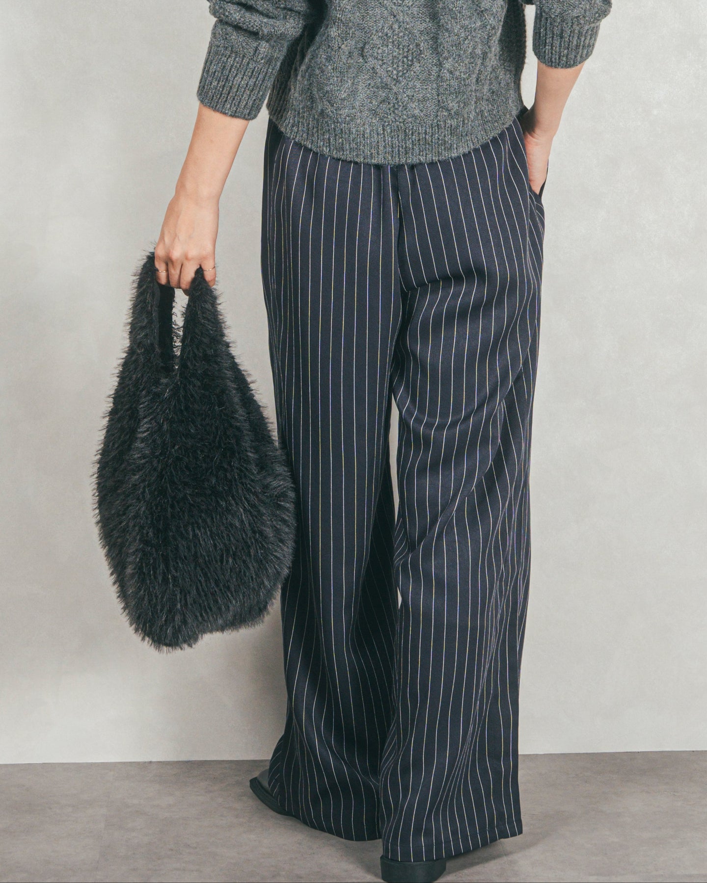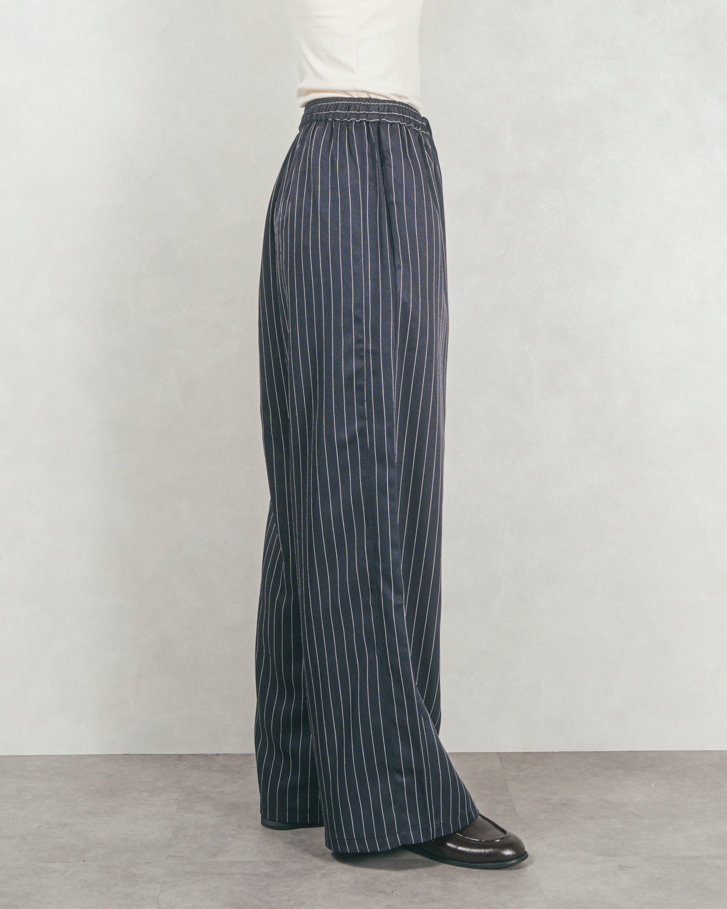 ワイドストレートのシルエットでリラックス感がありつつ、ストライプ柄できちんと感をプラス。ピンストライプの柄は脚長効果も◎