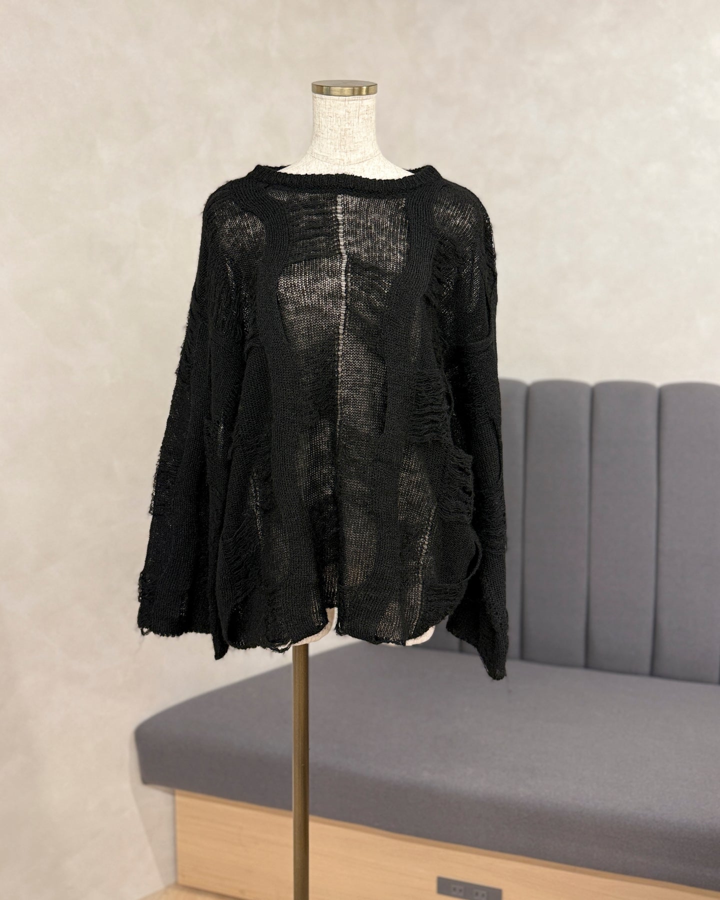 柔らかなモヘア混素材を贅沢に使用したローゲージニットプルオーバーが登場。存在感のあるパターン編みが温かみを感じさせ、秋冬のスタイリングに自然なアクセントをプラスします。