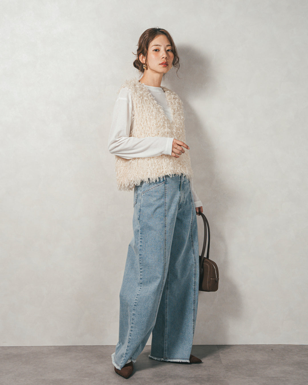 [SET]2-Way フリンジベスト+スラブシアークルーネックT+センターシーム リラックスカラーデニム(3SET)