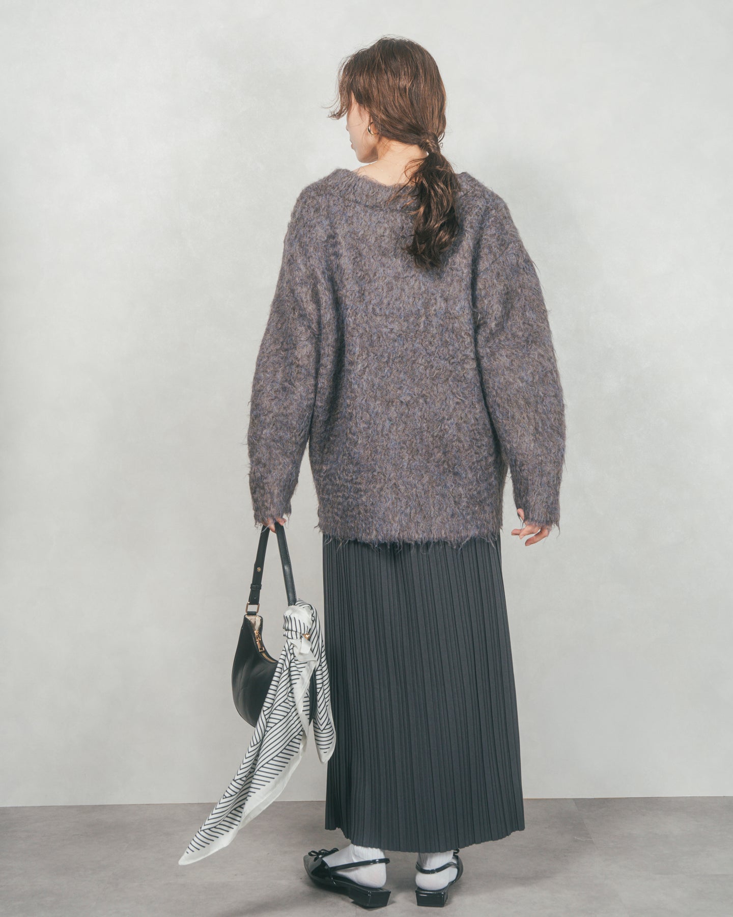 パーツの状態で特殊起毛と水洗いを施してからリンキングするという、丁寧な工程で仕立てられた一枚は、ふわっと空気を含んだようなやさしい肌触りと、しっかりとした存在感が魅力。ウール混のミックス糸は、単色ながらも奥行きがあり、見る角度によって微妙に表情を変えてくれます。