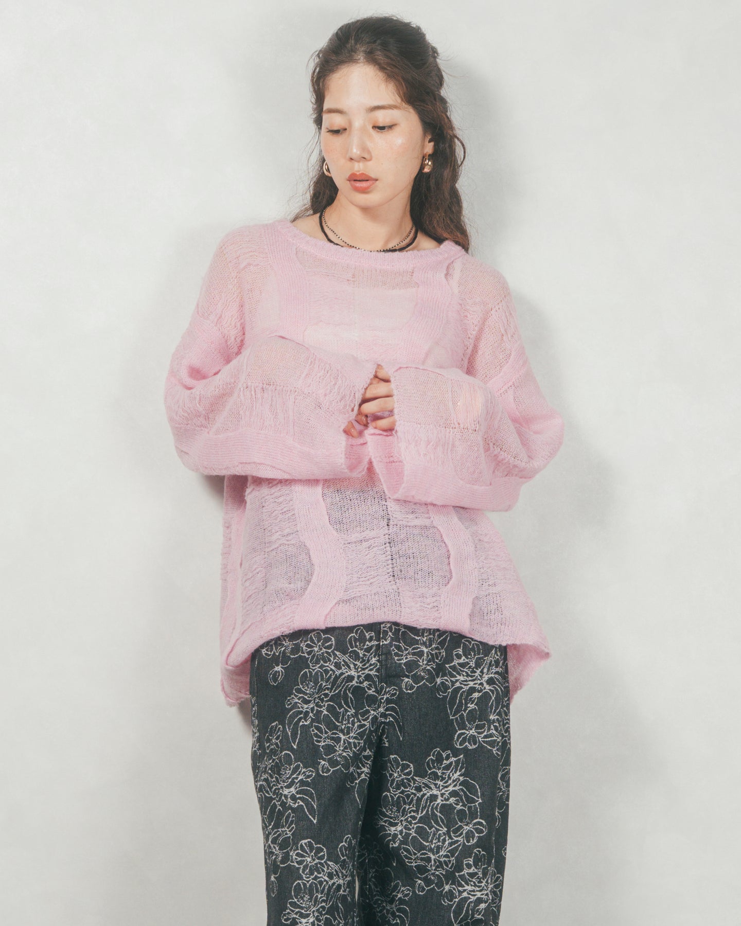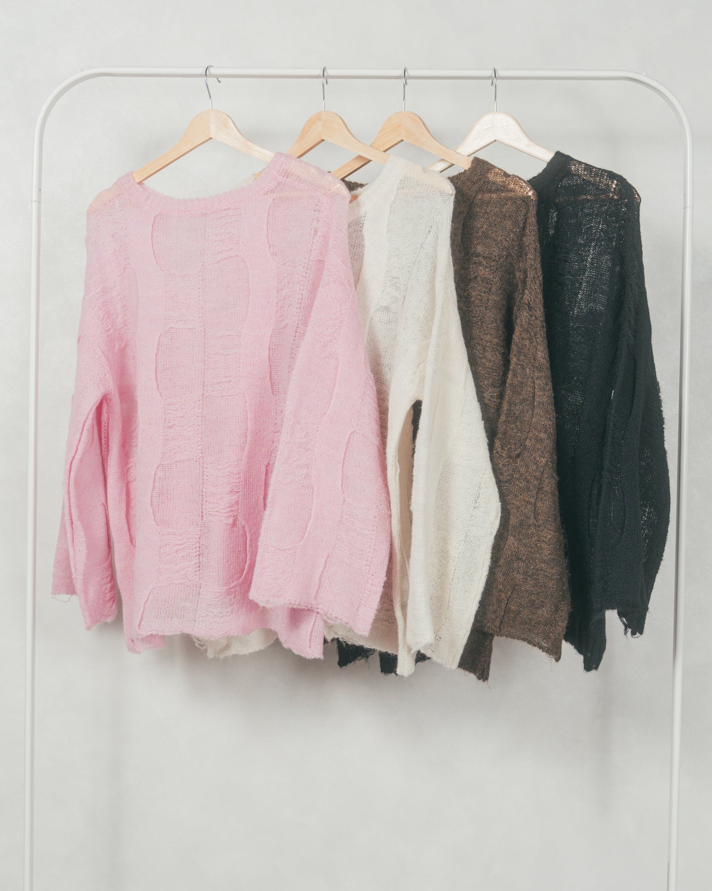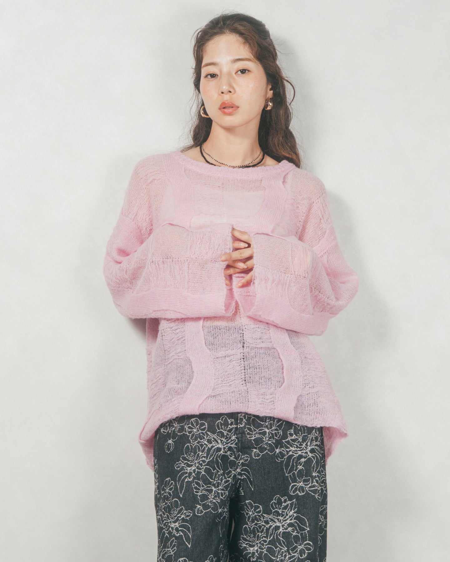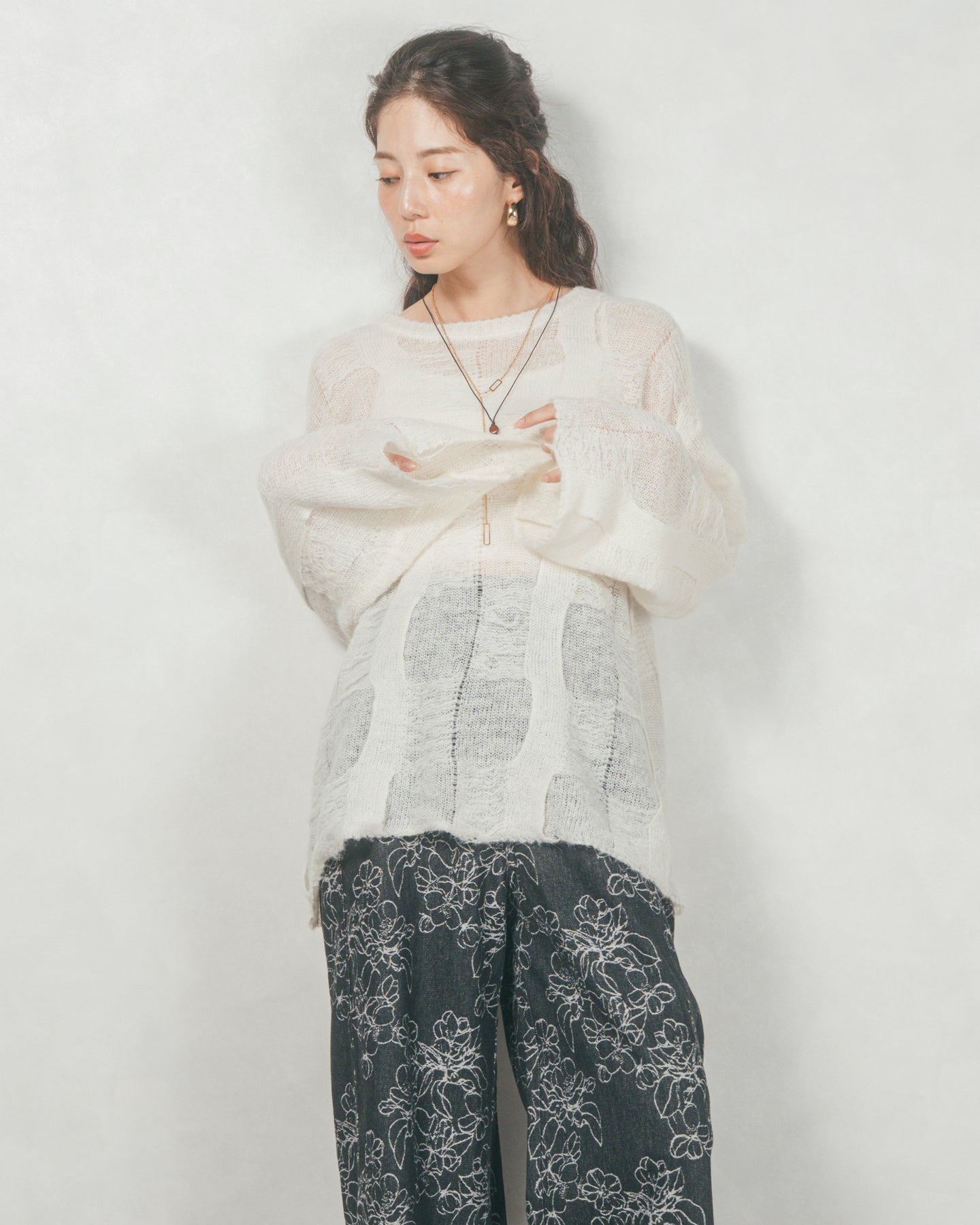 柔らかなモヘア混素材を贅沢に使用したローゲージニットプルオーバーが登場。存在感のあるパターン編みが温かみを感じさせ、秋冬のスタイリングに自然なアクセントをプラスします。リラックス感のあるゆったりシルエットは、抜け感を演出しつつも女性らしい柔らかなラインをキープ。デイリーユースにぴったりで、休日のリラックスタイムはデニムやワイドパンツと合わせてラフに、またちょっとしたお出かけにはスカートやレザーアイテムとコーディネートしても◎秋冬のワードローブに欠かせない一着です。