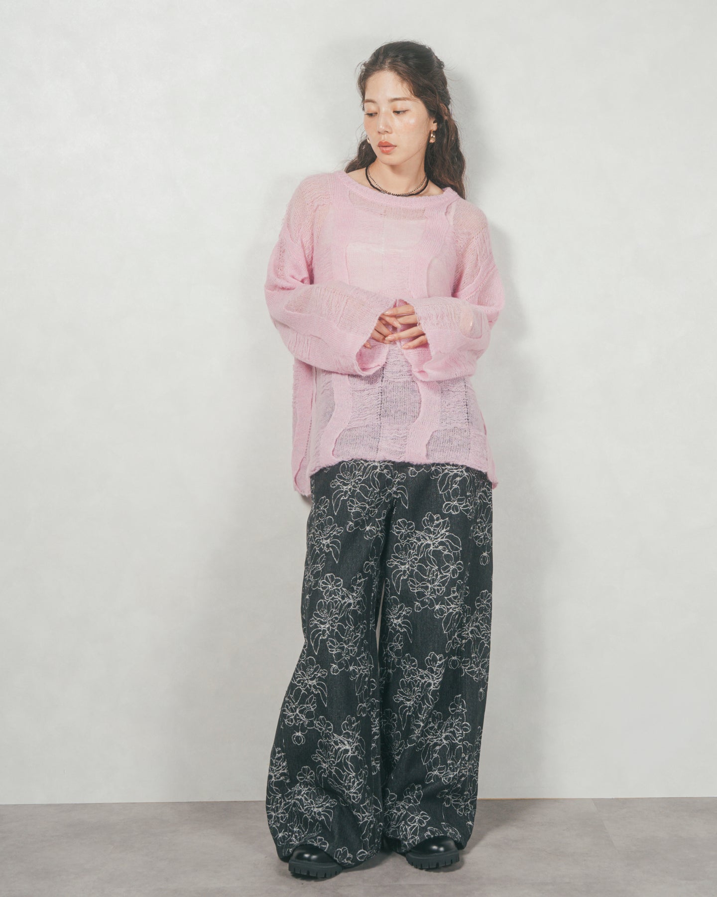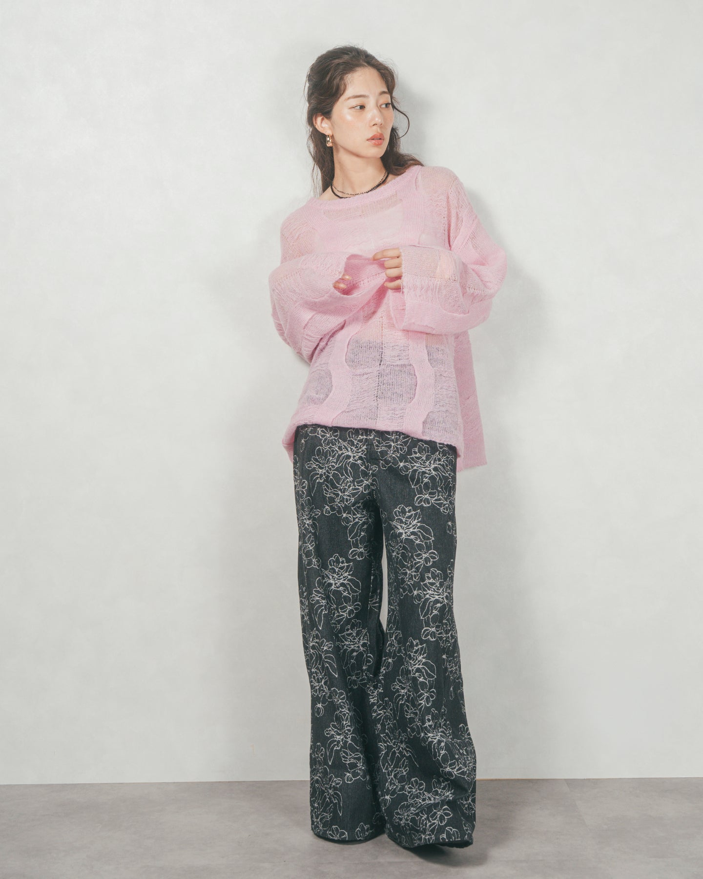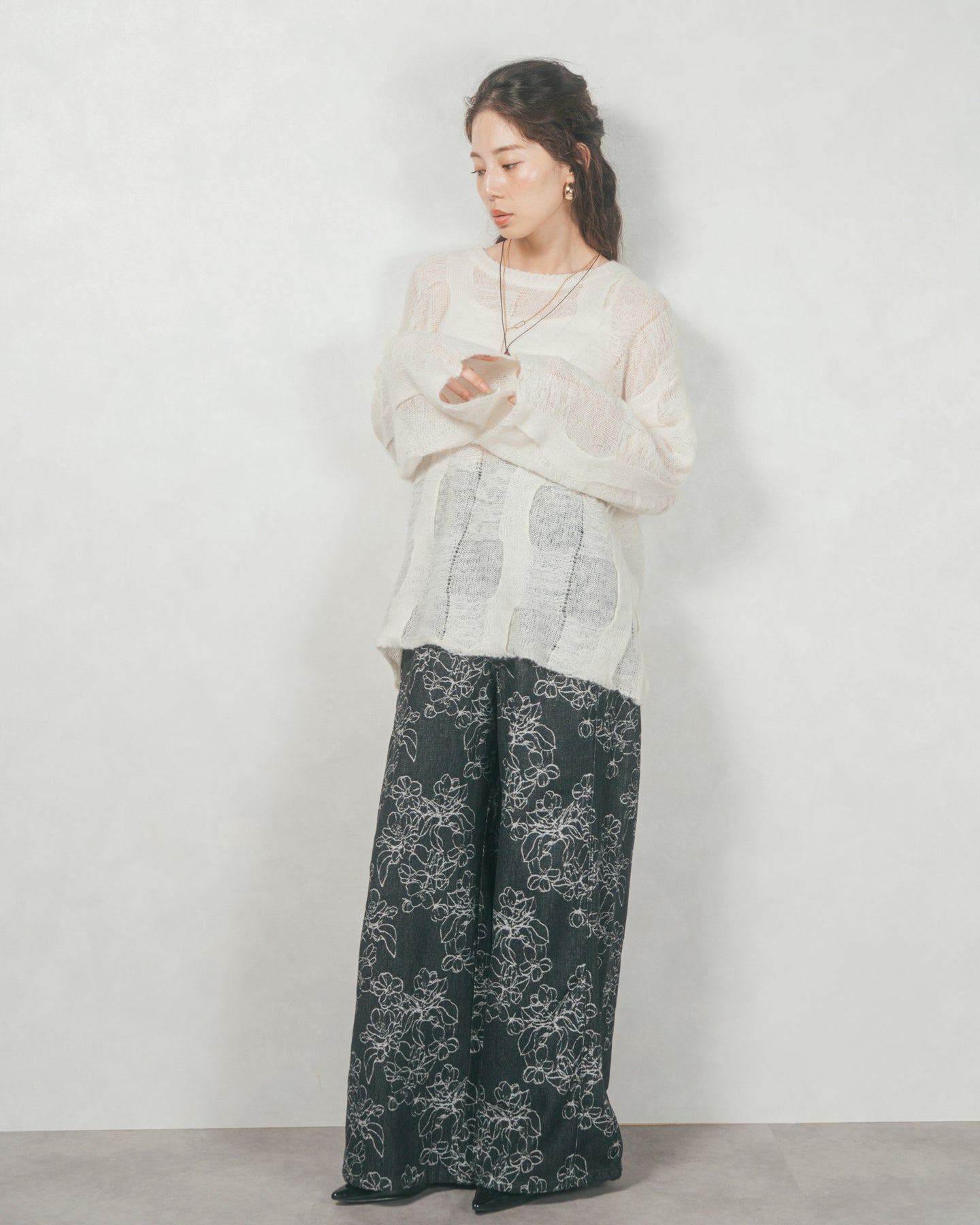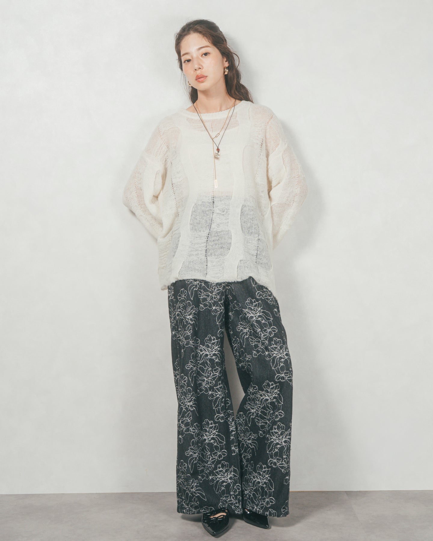 [SET]コージーオーバーサイズニット+フラワージャガードデニム(2SET)