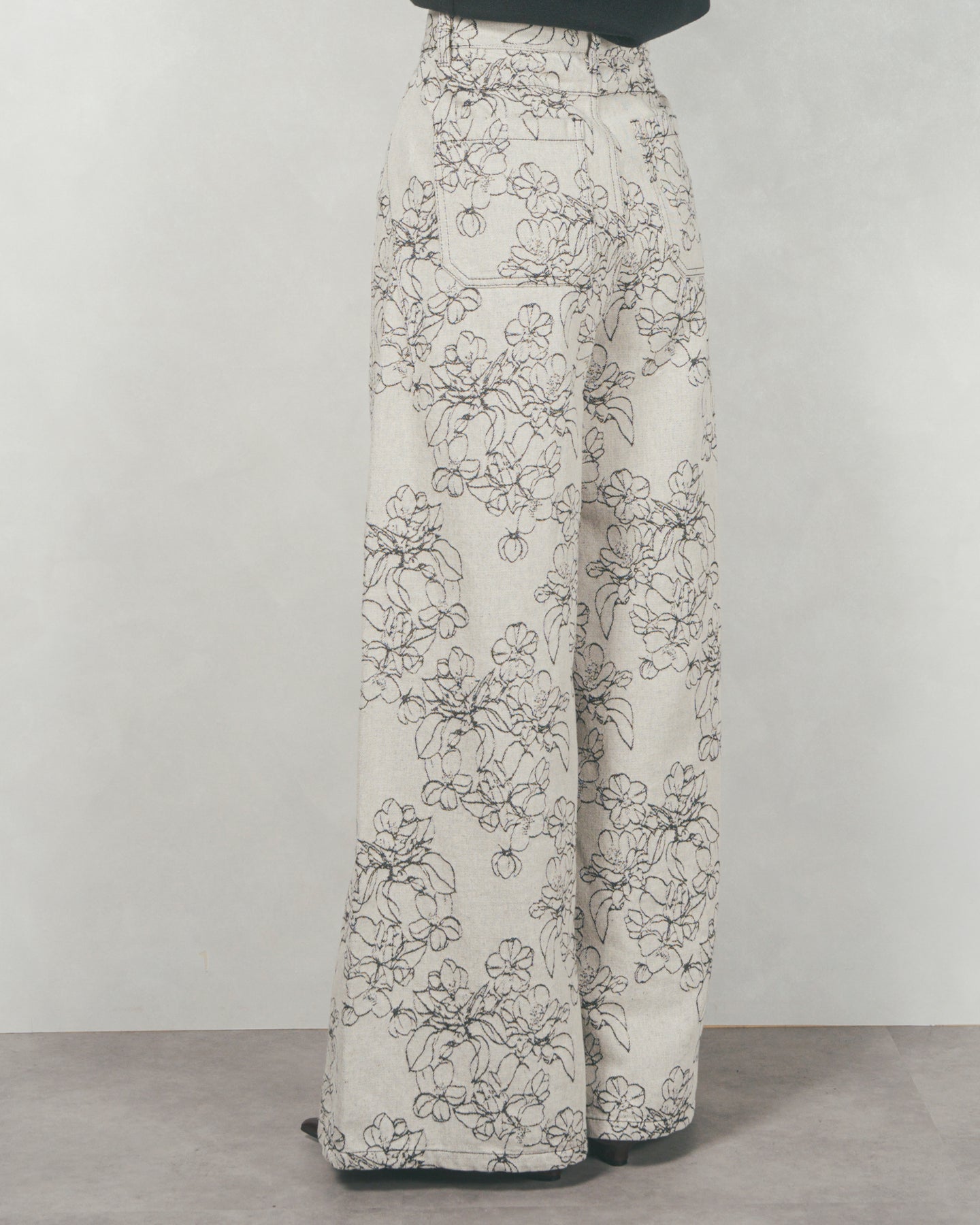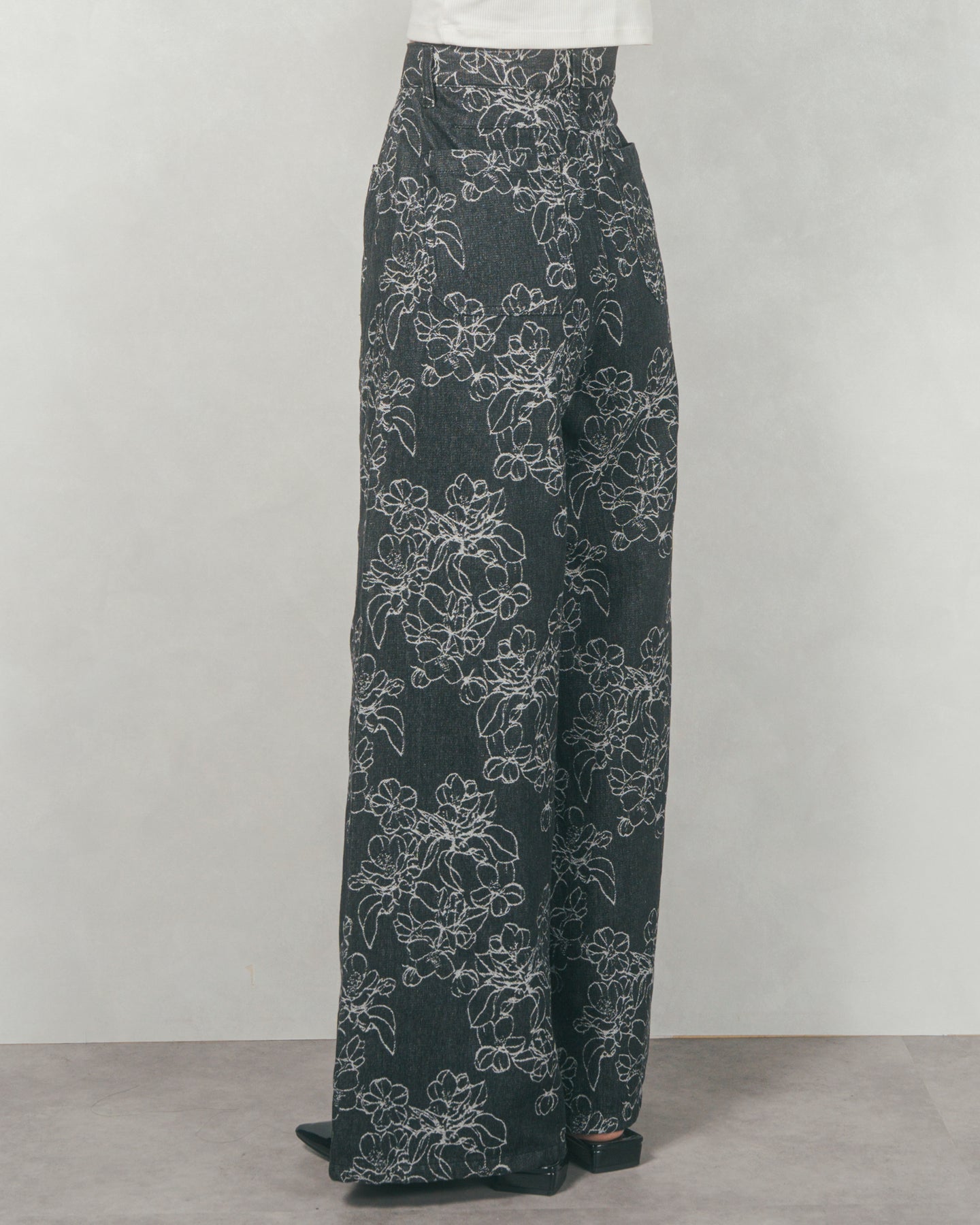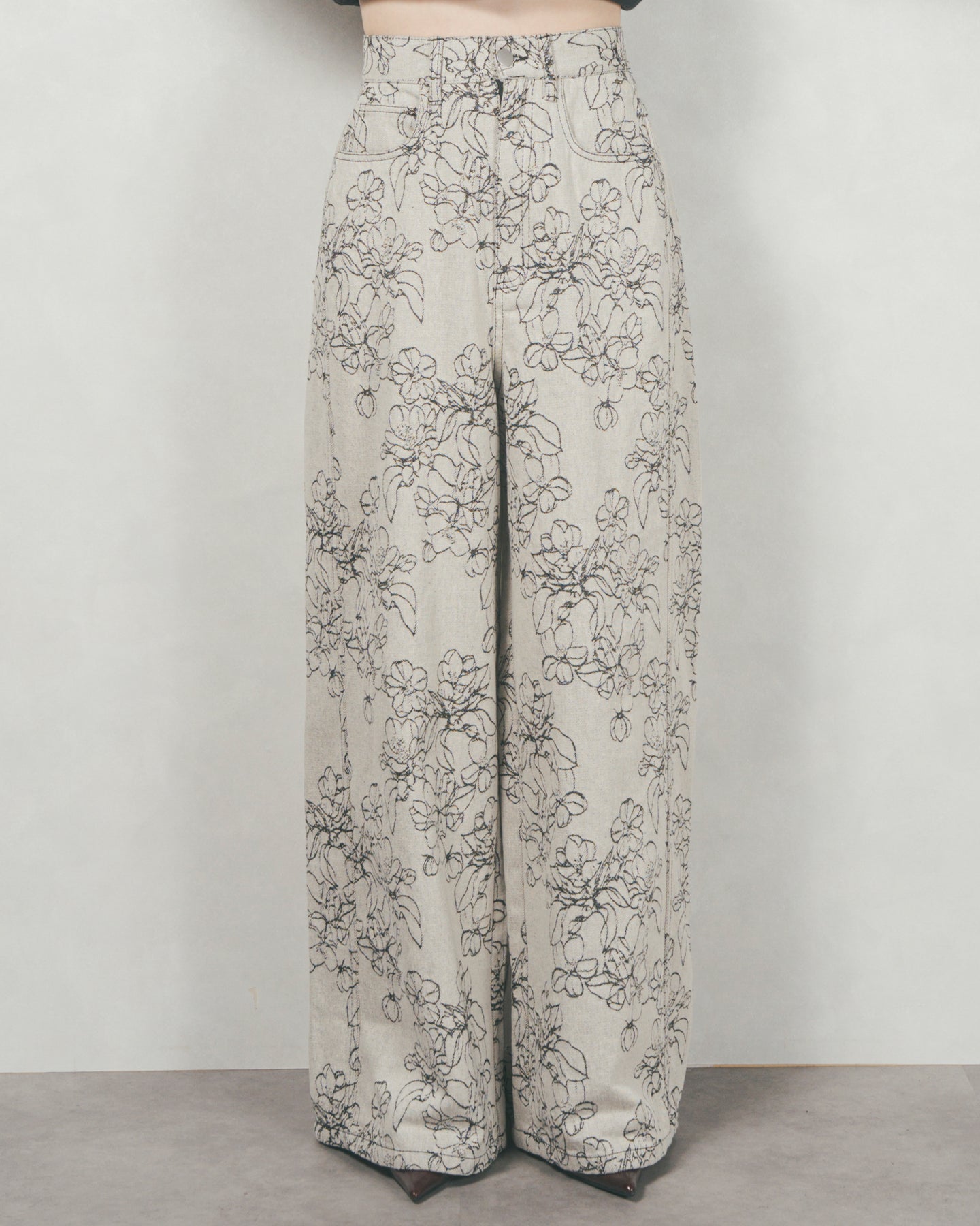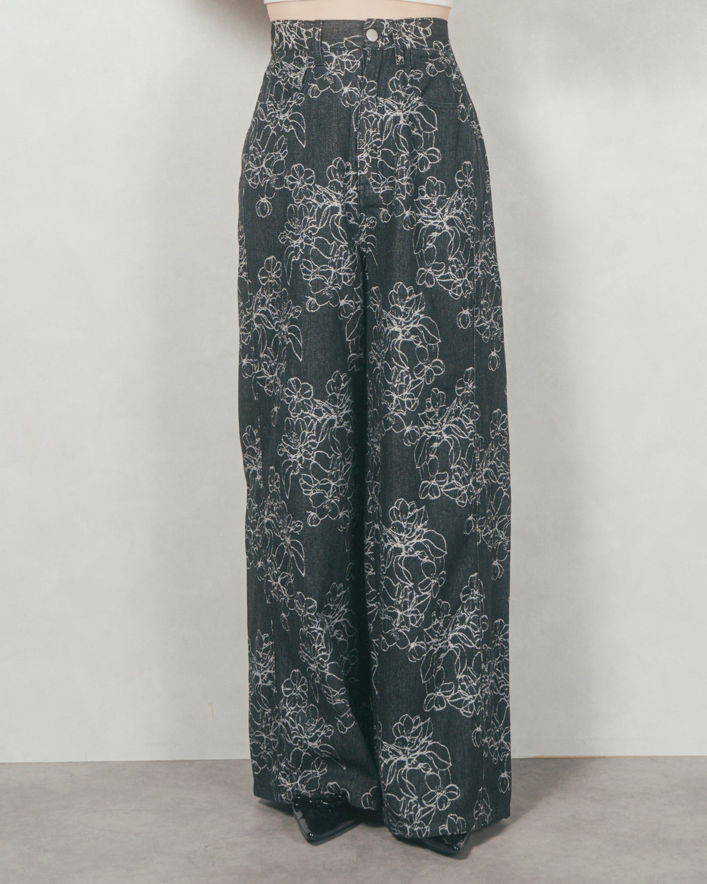 アイボリーとブラックのシックなカラーに繊細な花柄プリントが映えるデニムパンツ。