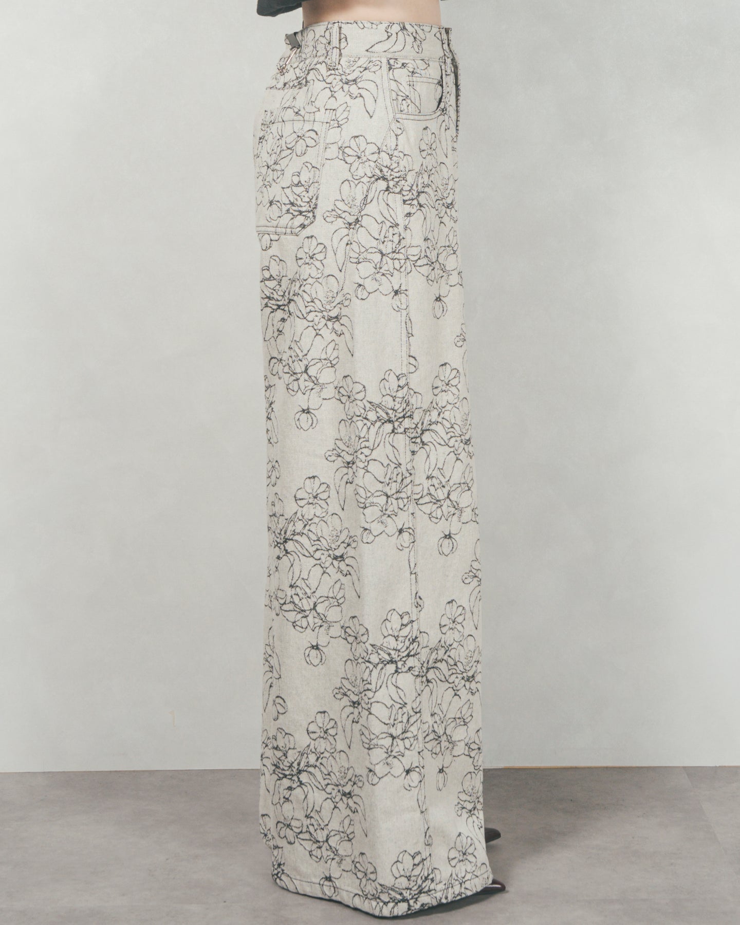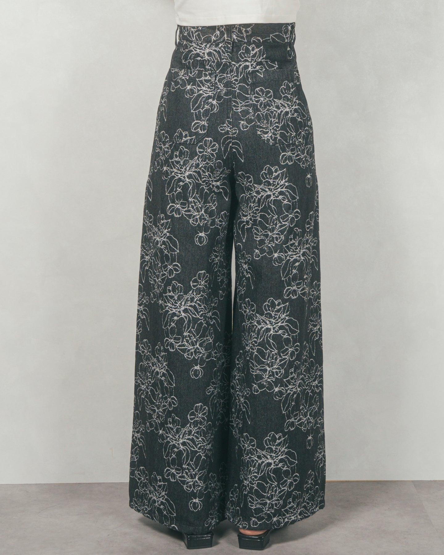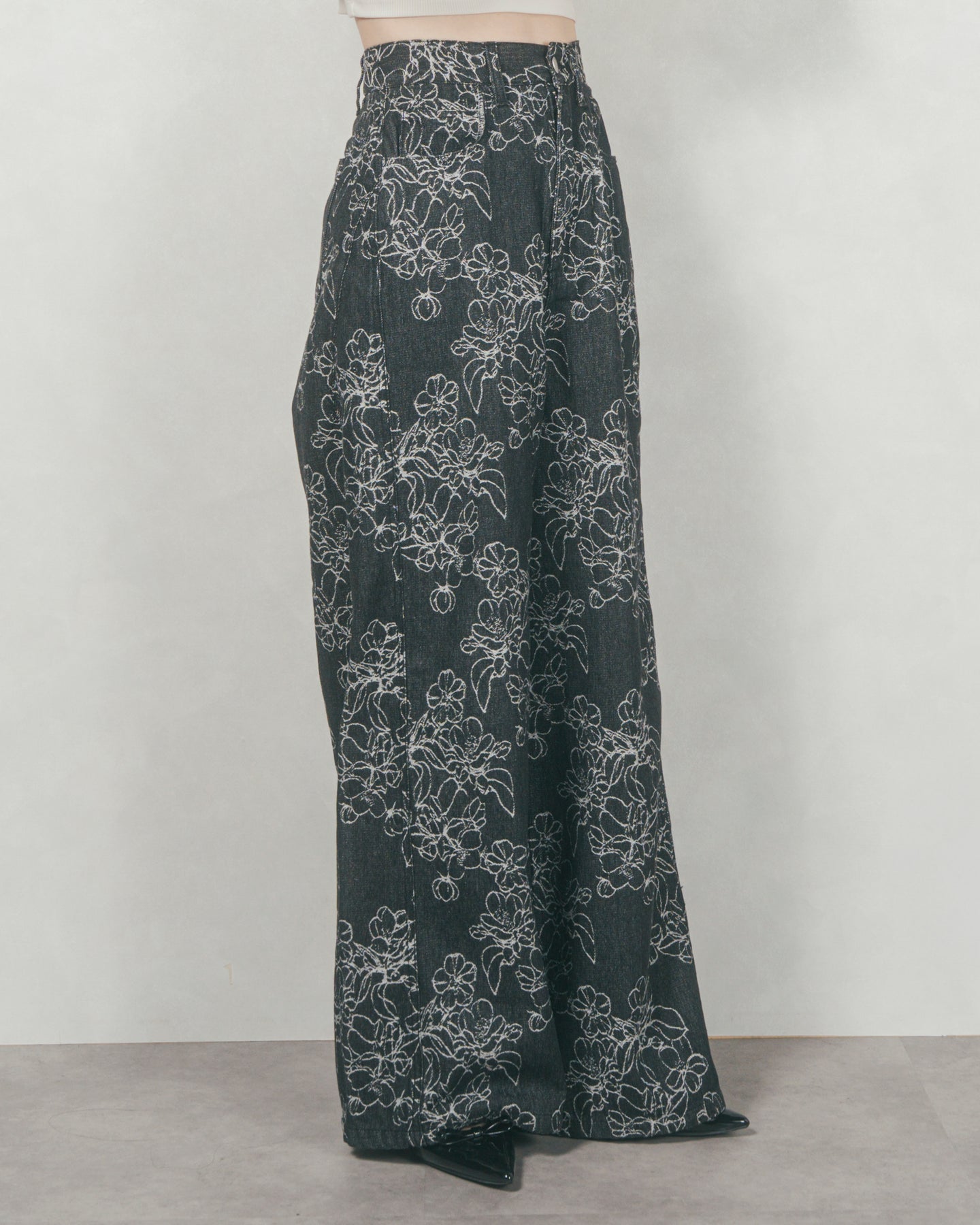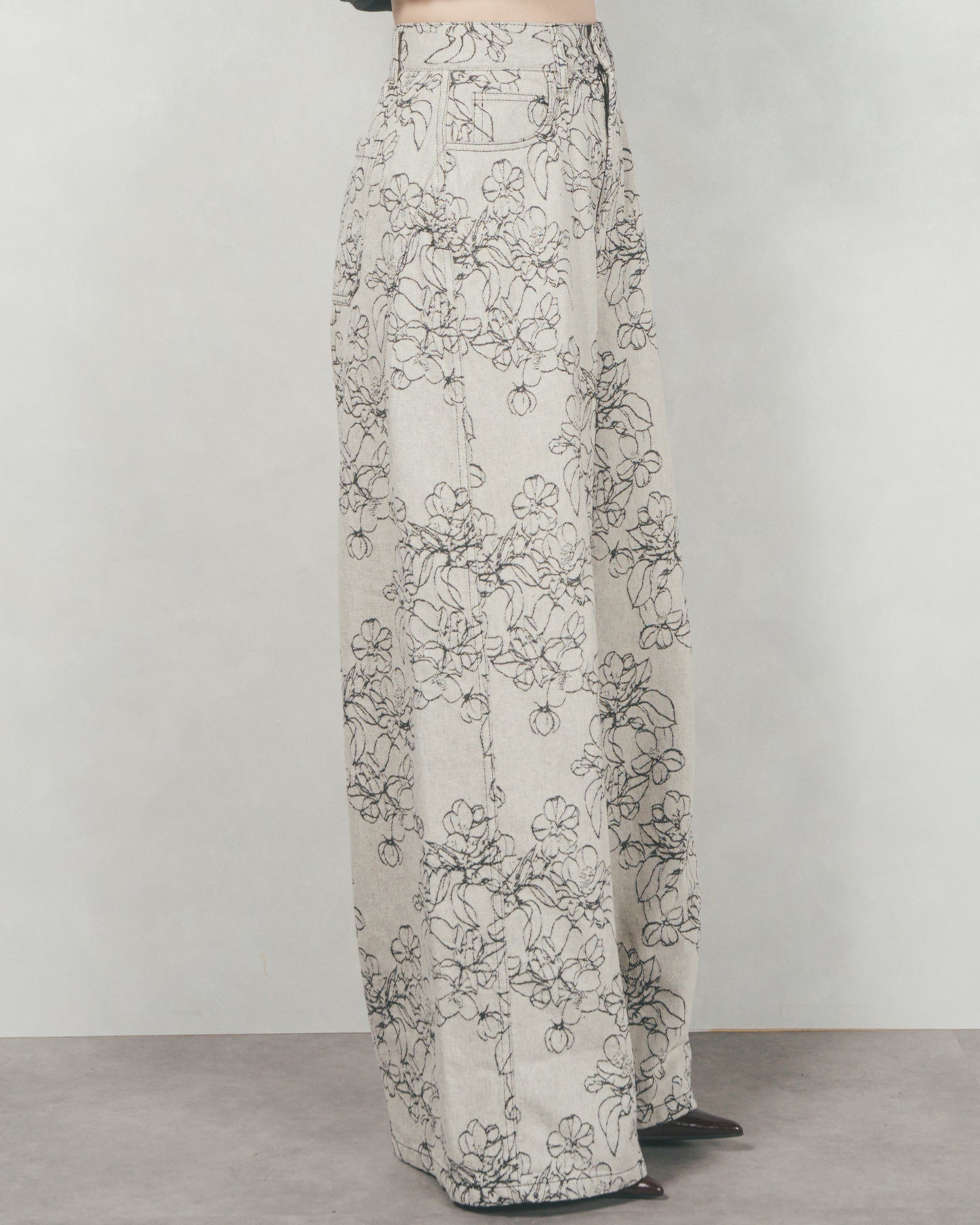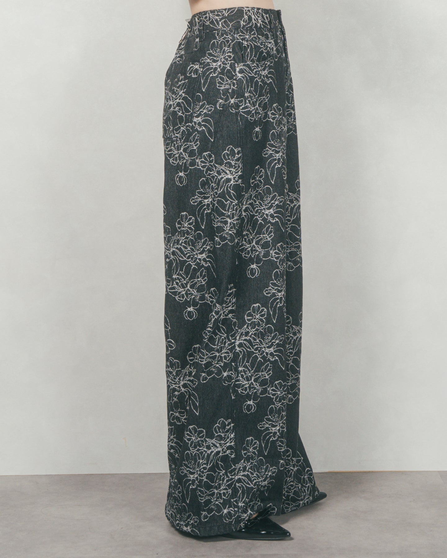 アイボリーとブラックのシックなカラーに繊細な花柄プリントが映えるデニムパンツ。
