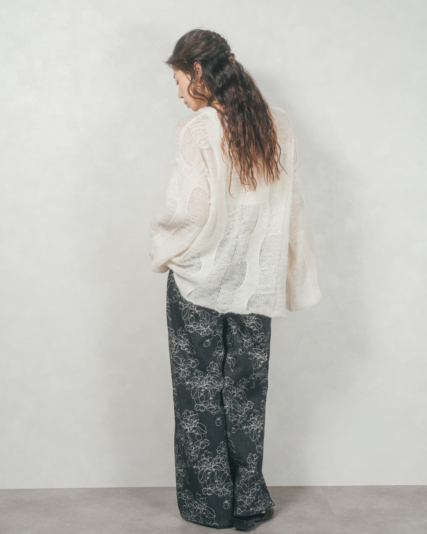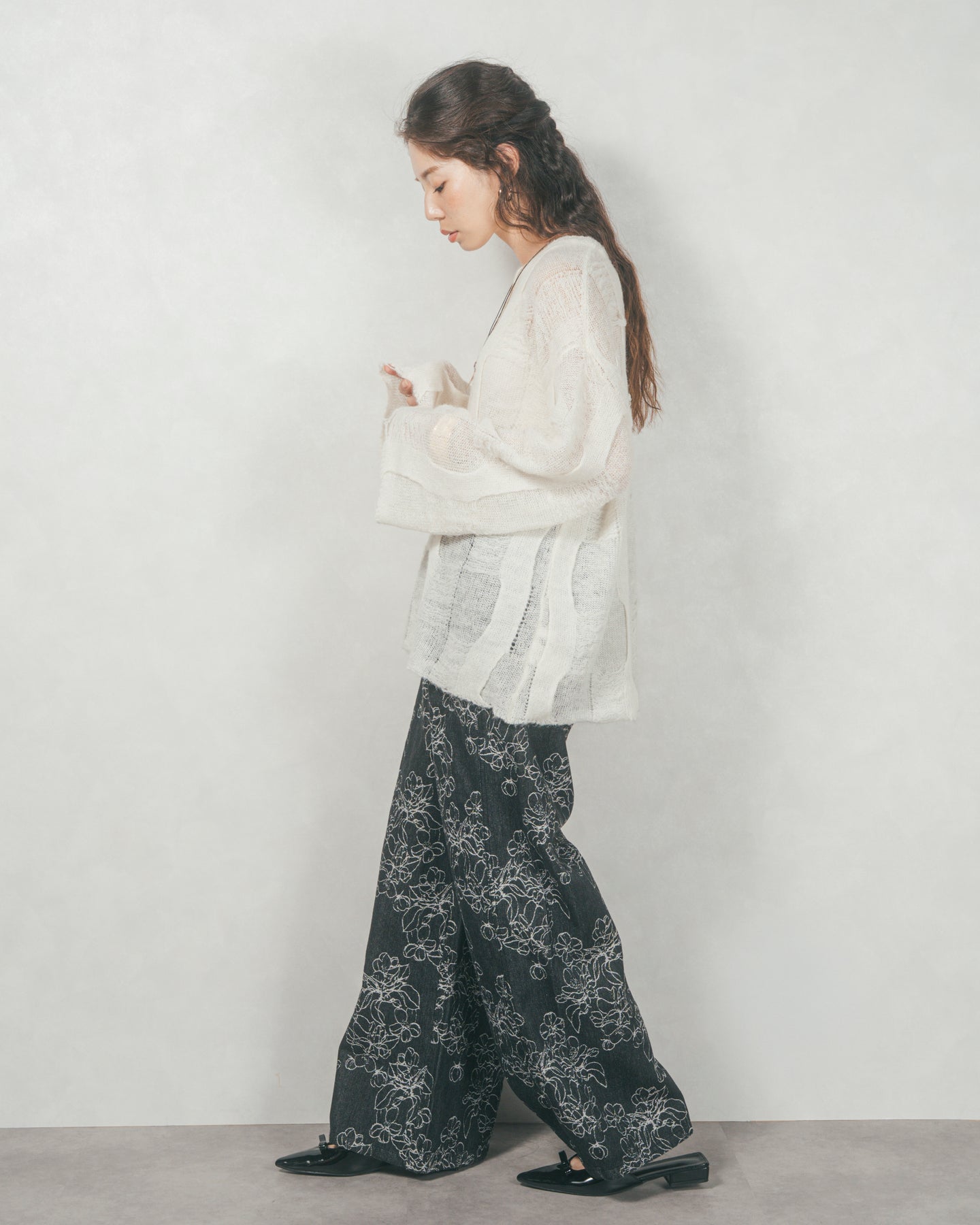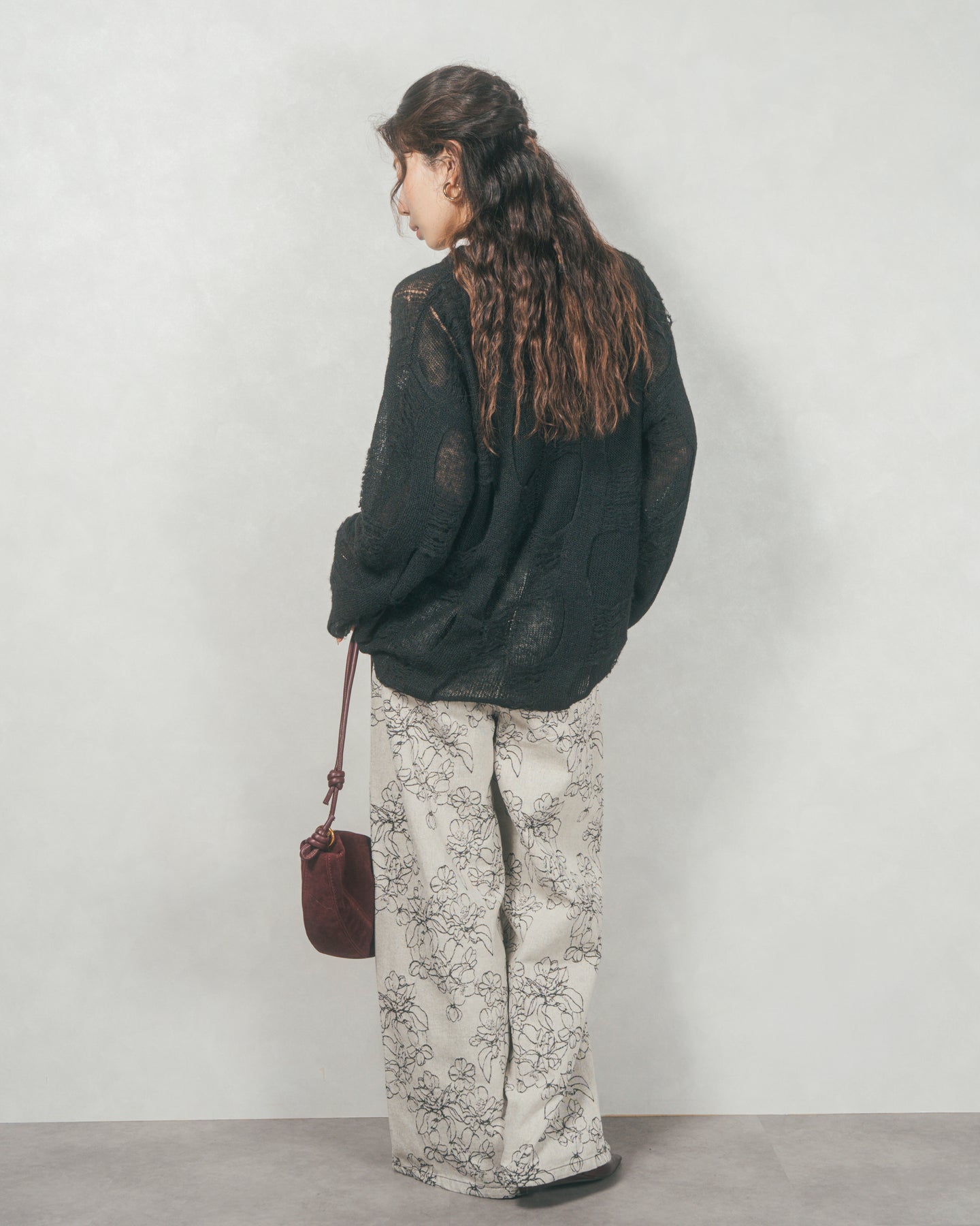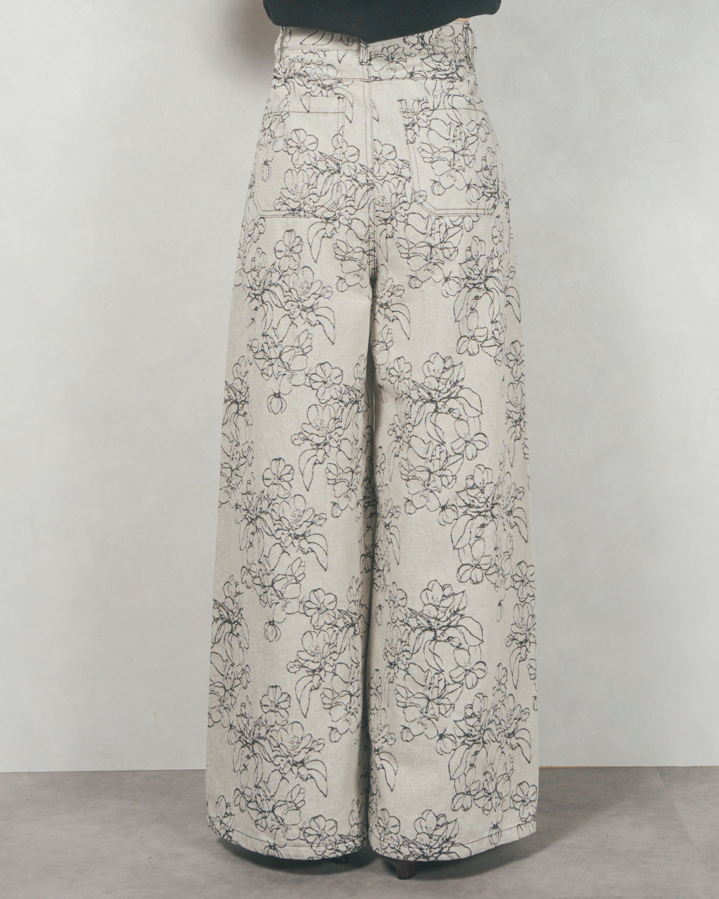 アイボリーとブラックのシックなカラーに繊細な花柄プリントが映えるデニムパンツ。