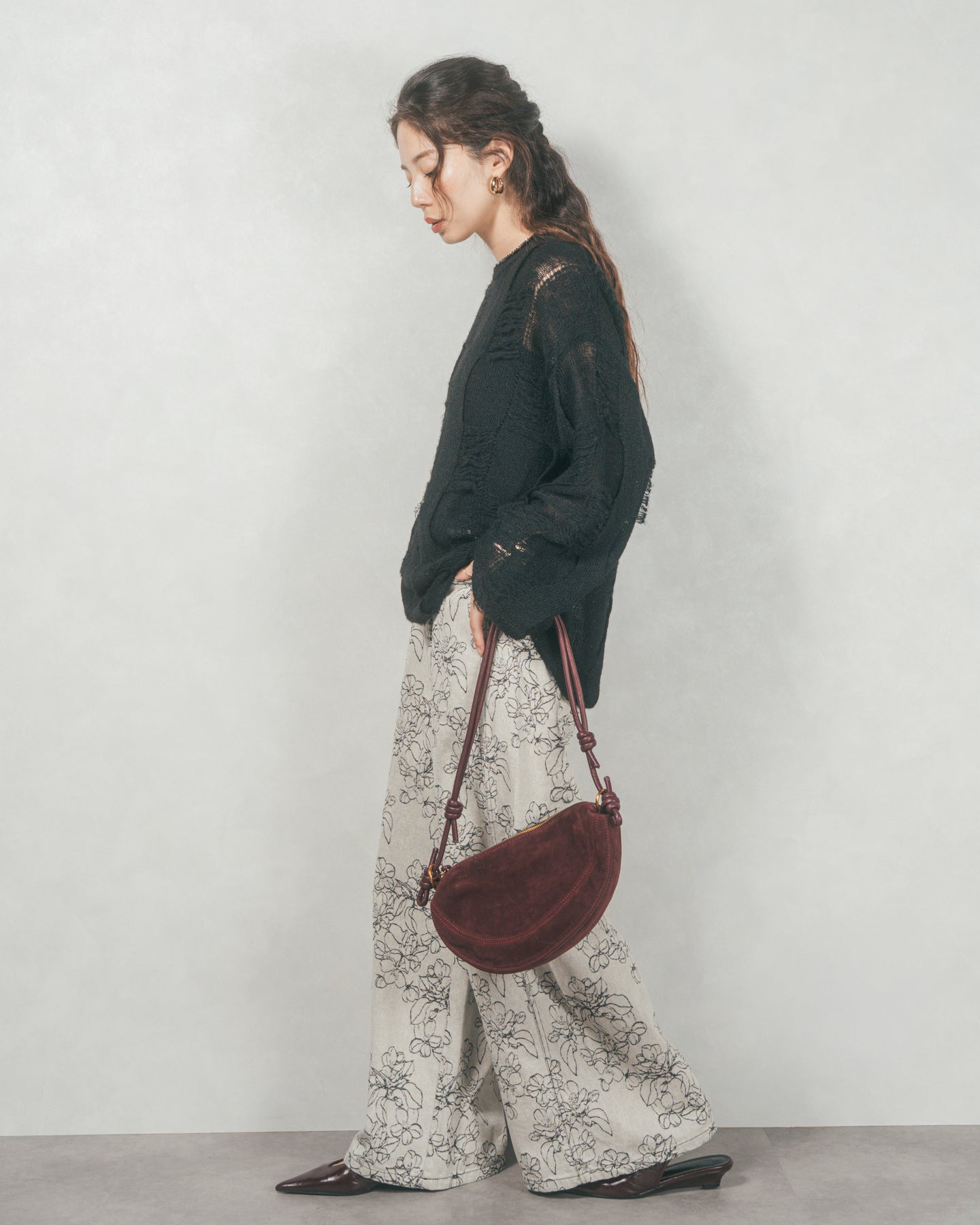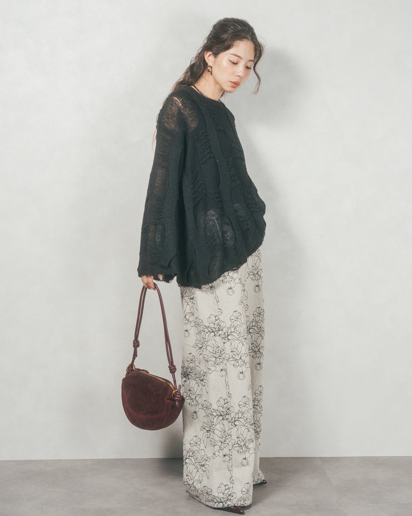 存在感のある刺繍がコーディネートの主役となり、シンプルな装いに華やかさと上品さを添えます。秋冬はベーシックなニットやシャツと合わせてクールで洗練された印象に。春夏は軽やかなブラウスやTシャツと組み合わせて爽やかさをプラス。季節を問わず、シンプルなスタイルをぐっと格上げし、洗練された大人の雰囲気を演出してくれる万能アイテム。普段使いから特別なお出かけまで、多彩なシーンで活躍します。