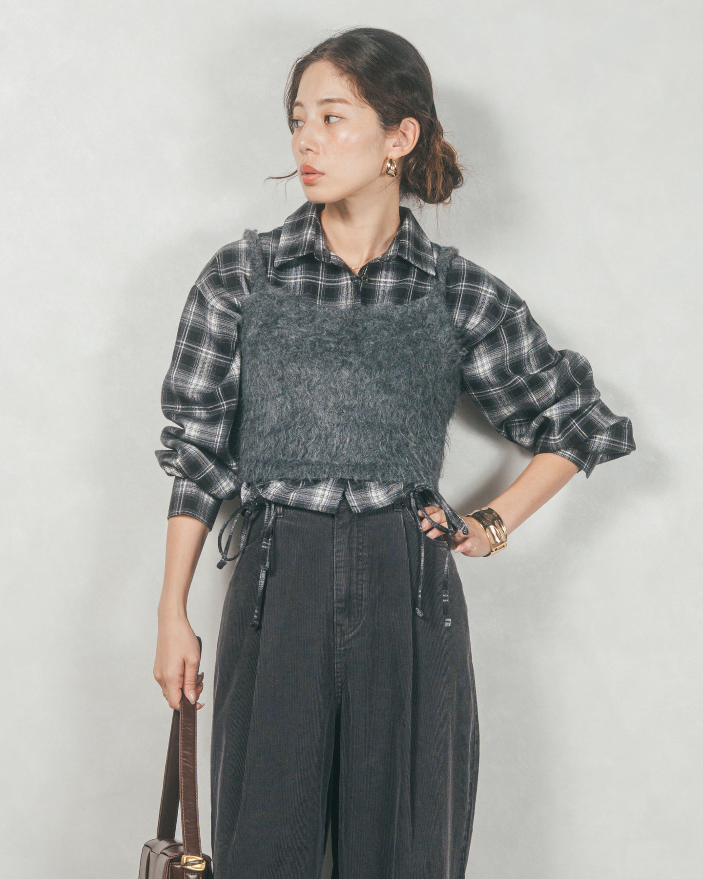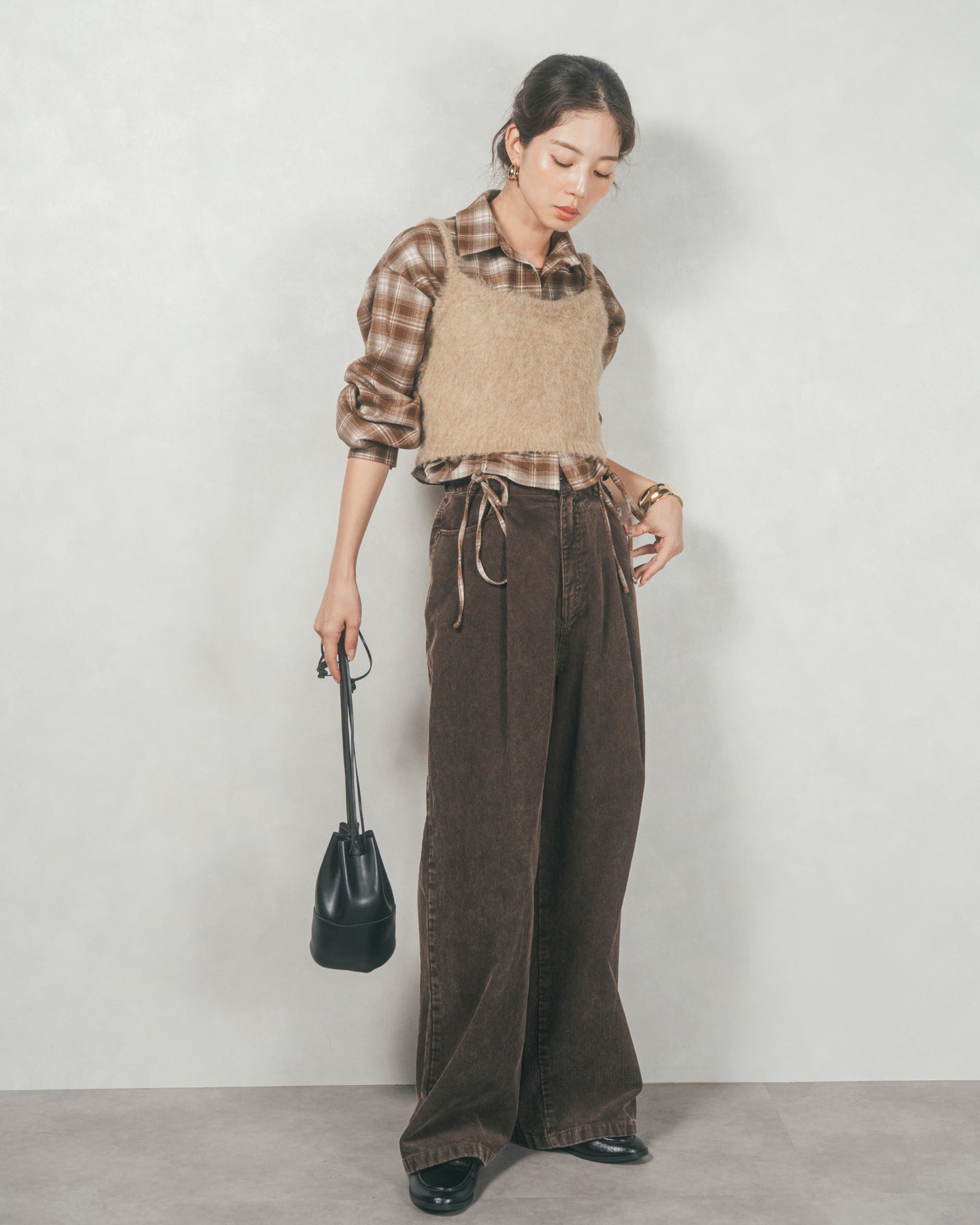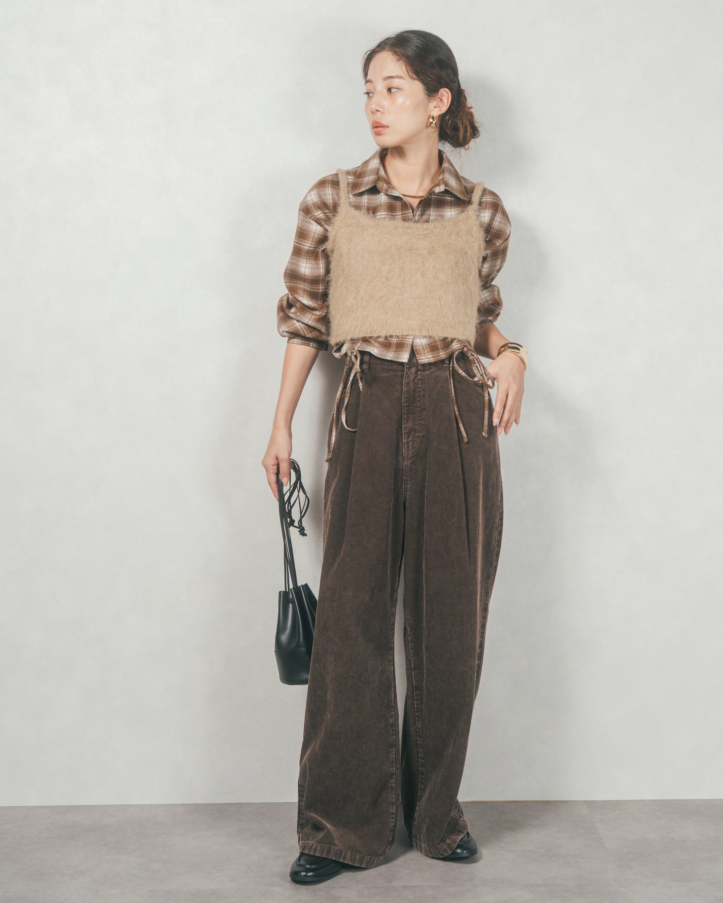 [SET]裾ドロストクロップドチェックシャツ+モヘアタッチKnitビスチェ+コーデュロイWideストレートパンツ(3SET)