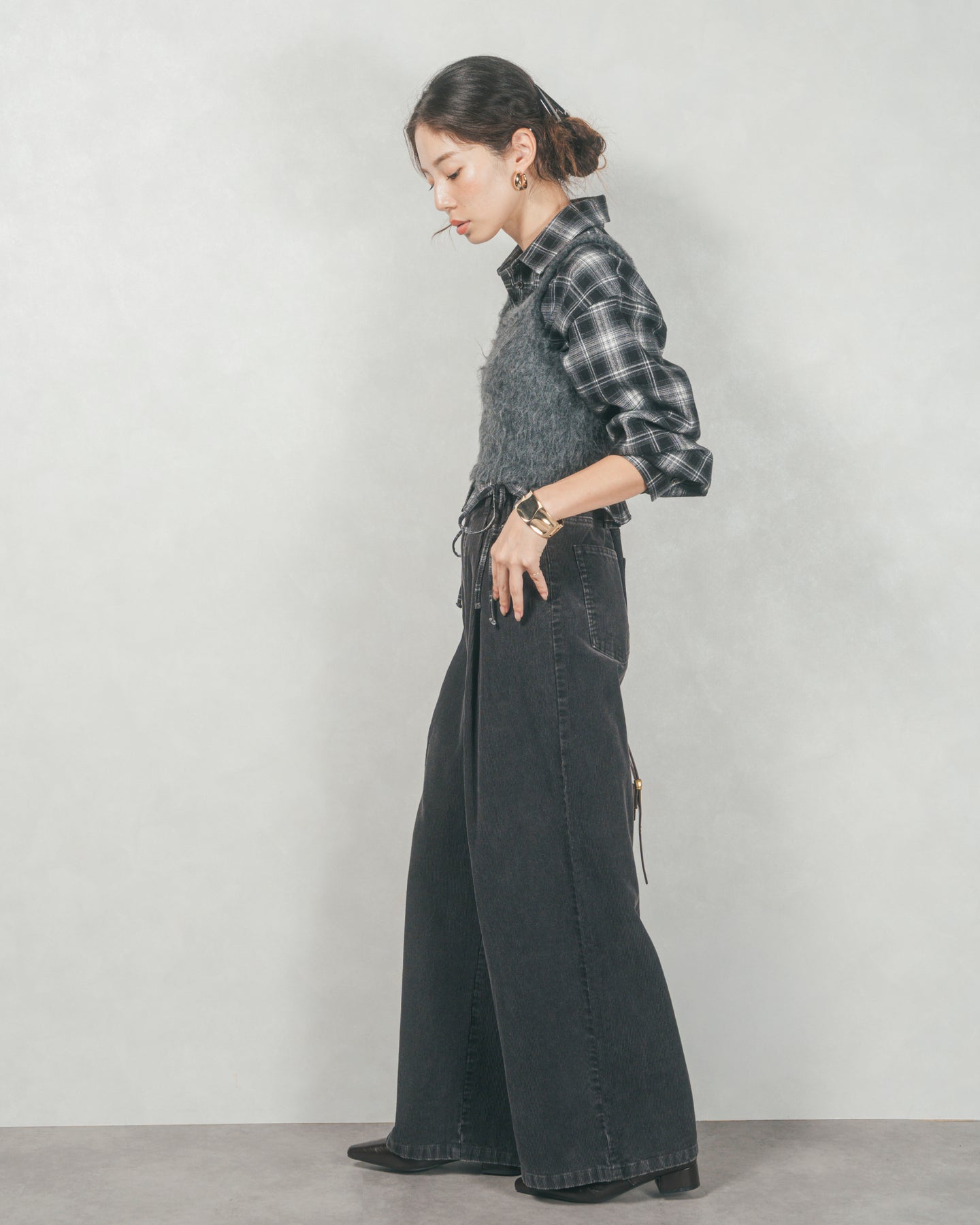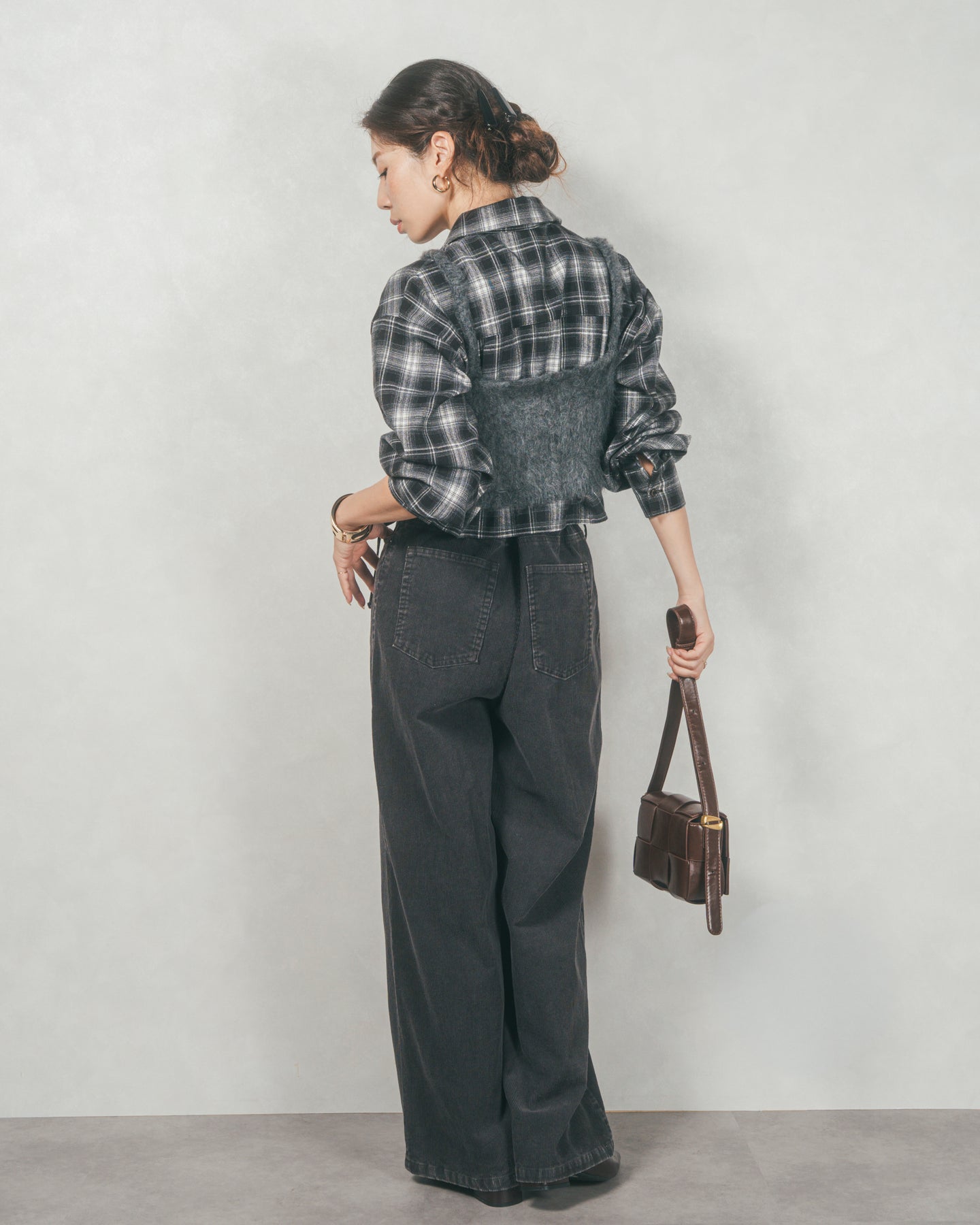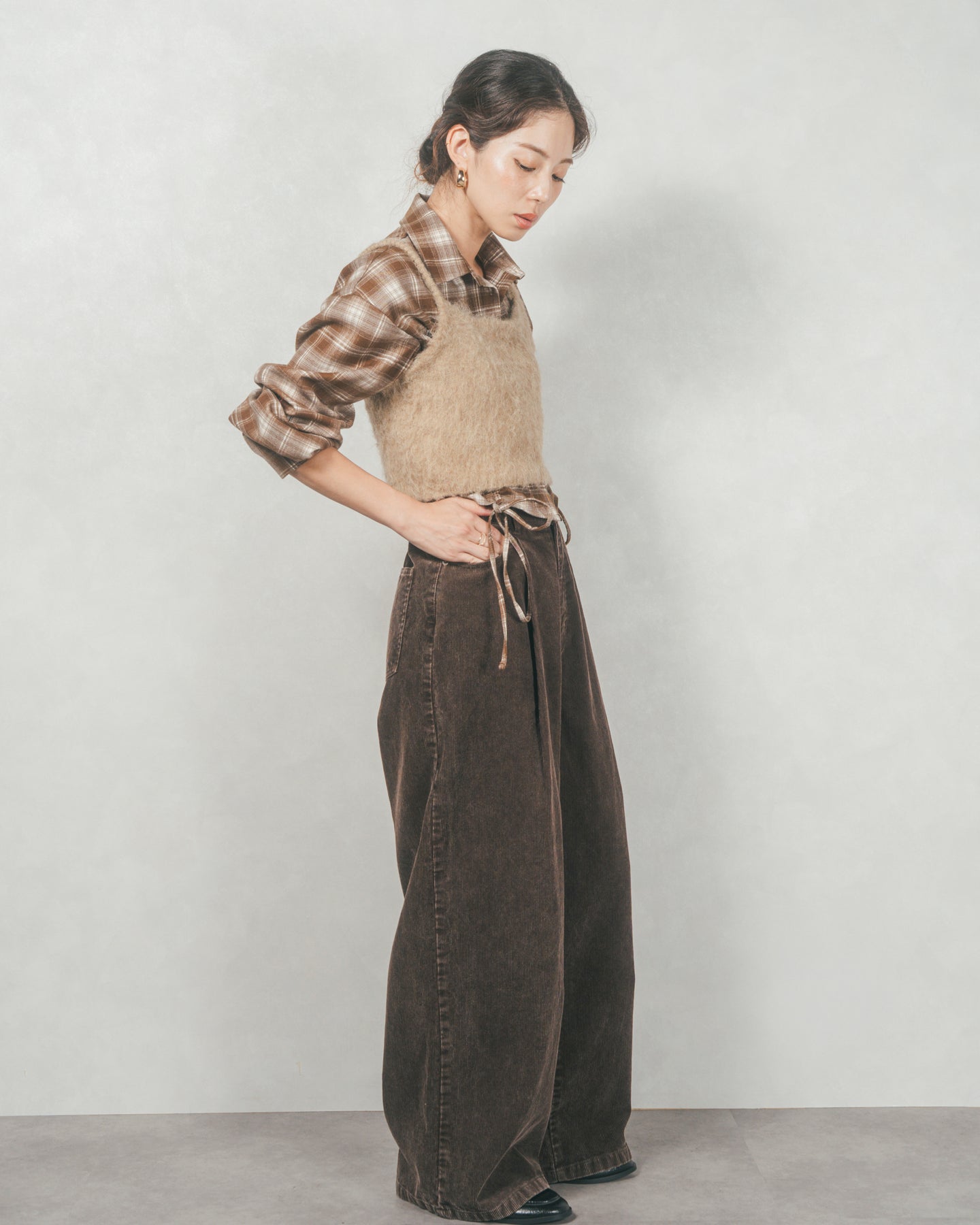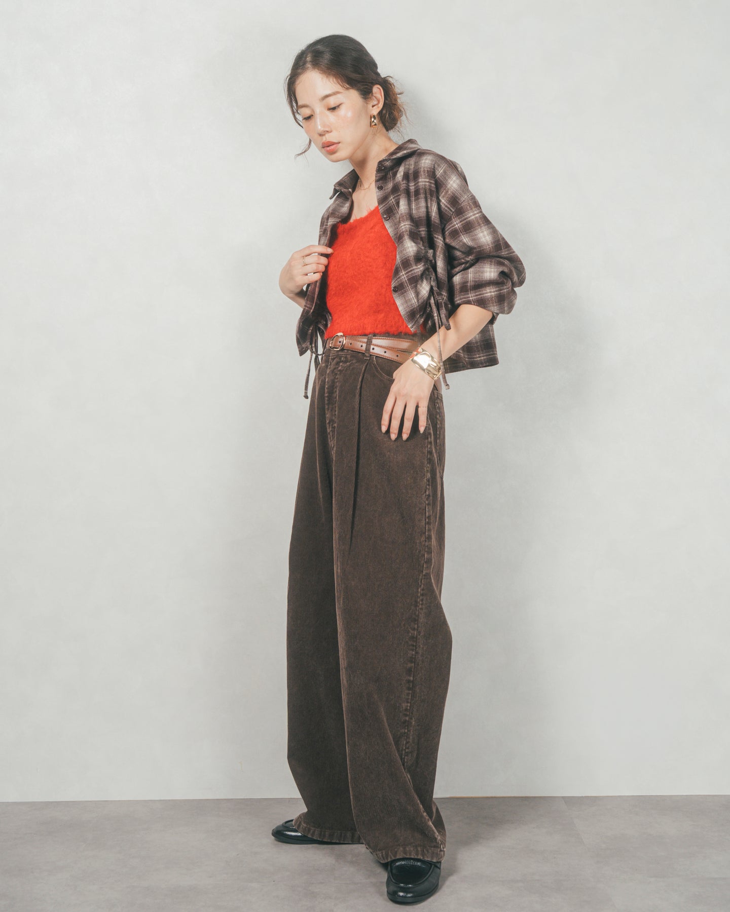 [SET]裾ドロストクロップドチェックシャツ+モヘアタッチKnitビスチェ+コーデュロイWideストレートパンツ(3SET)