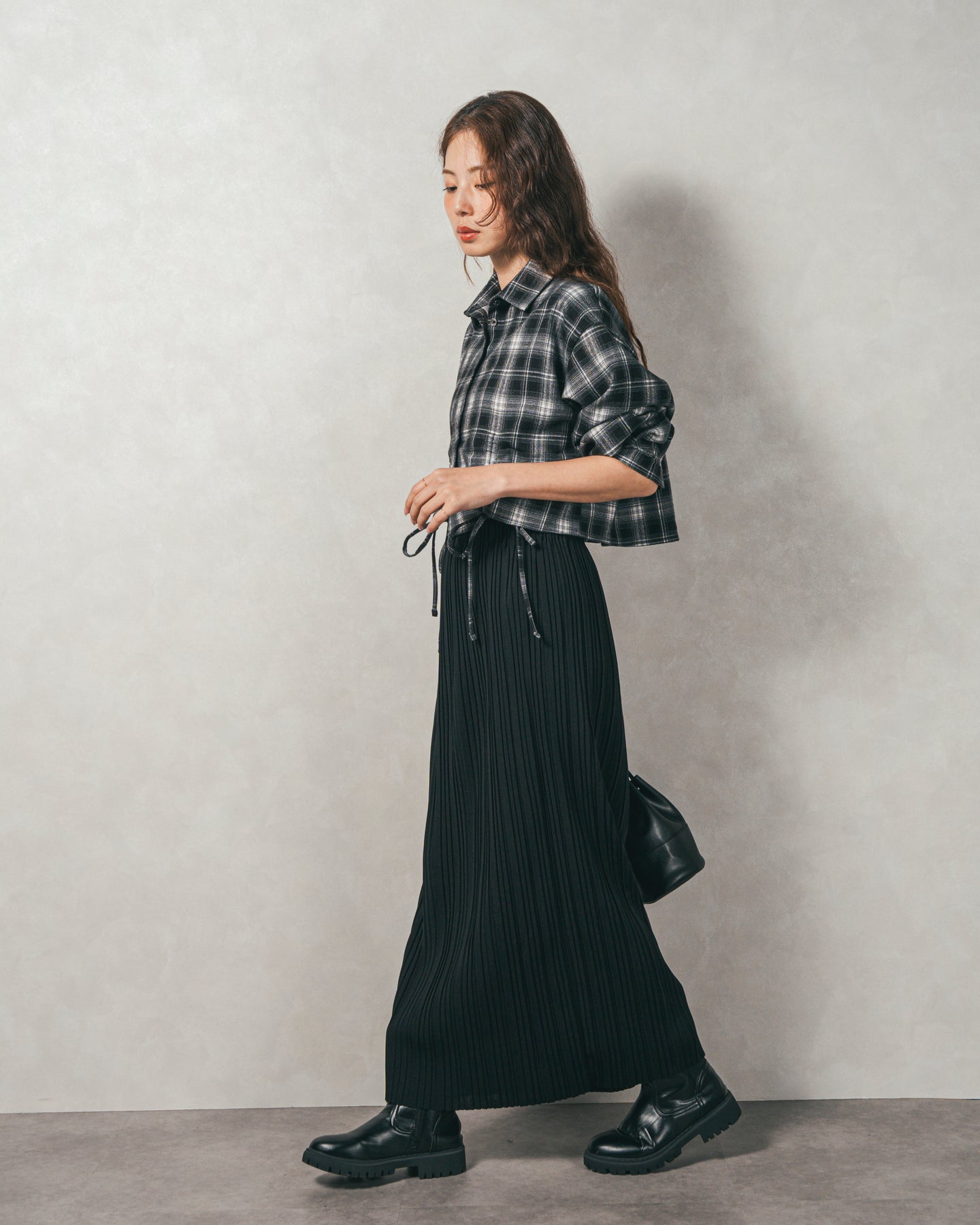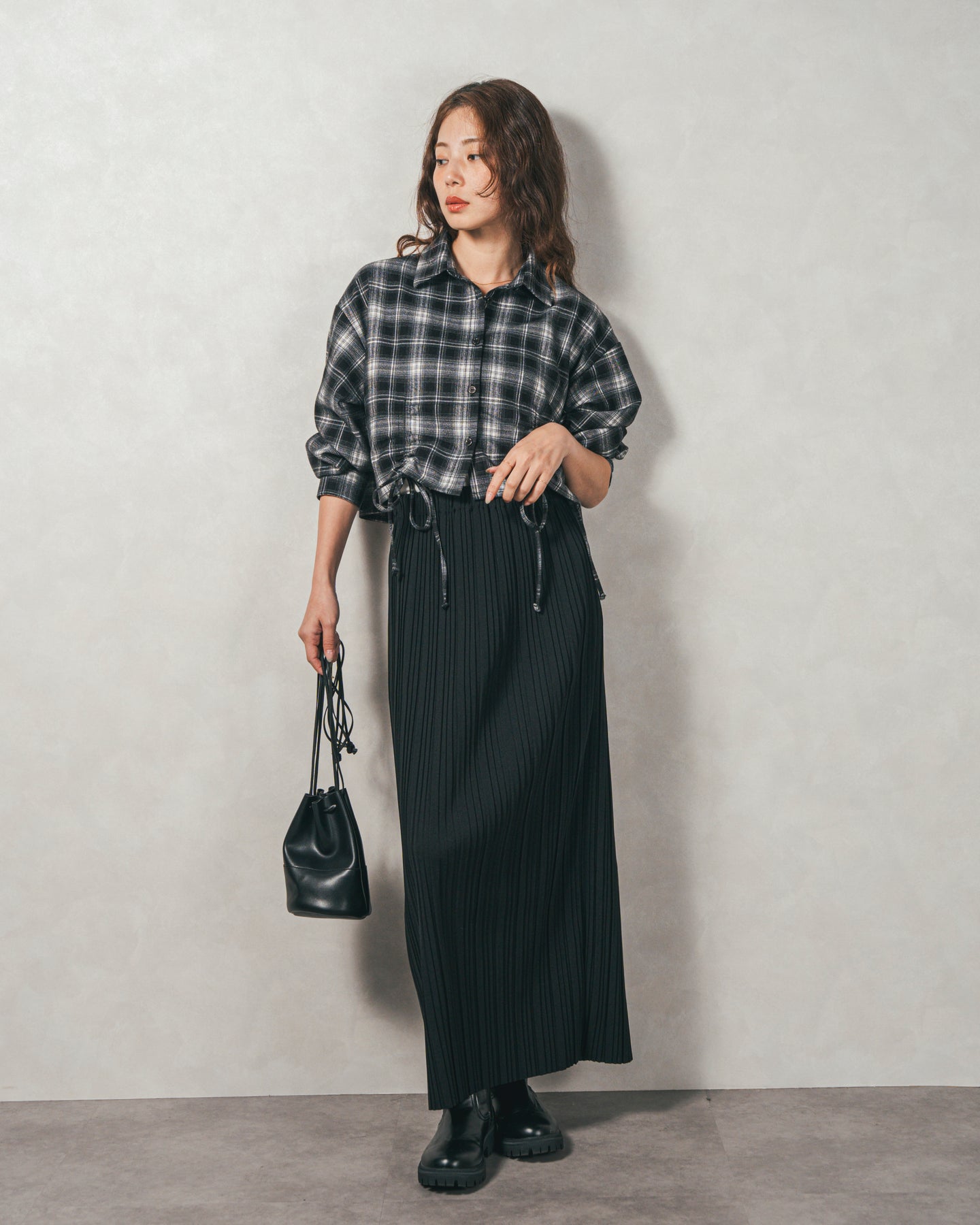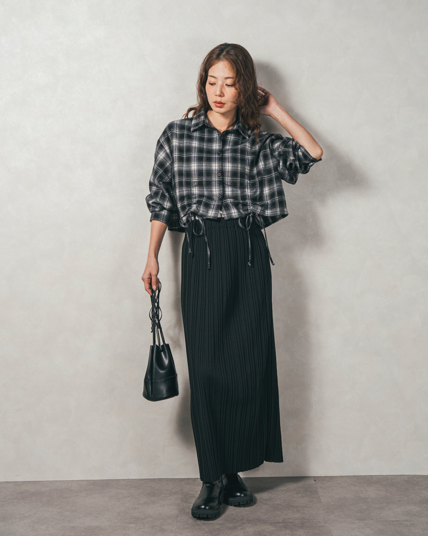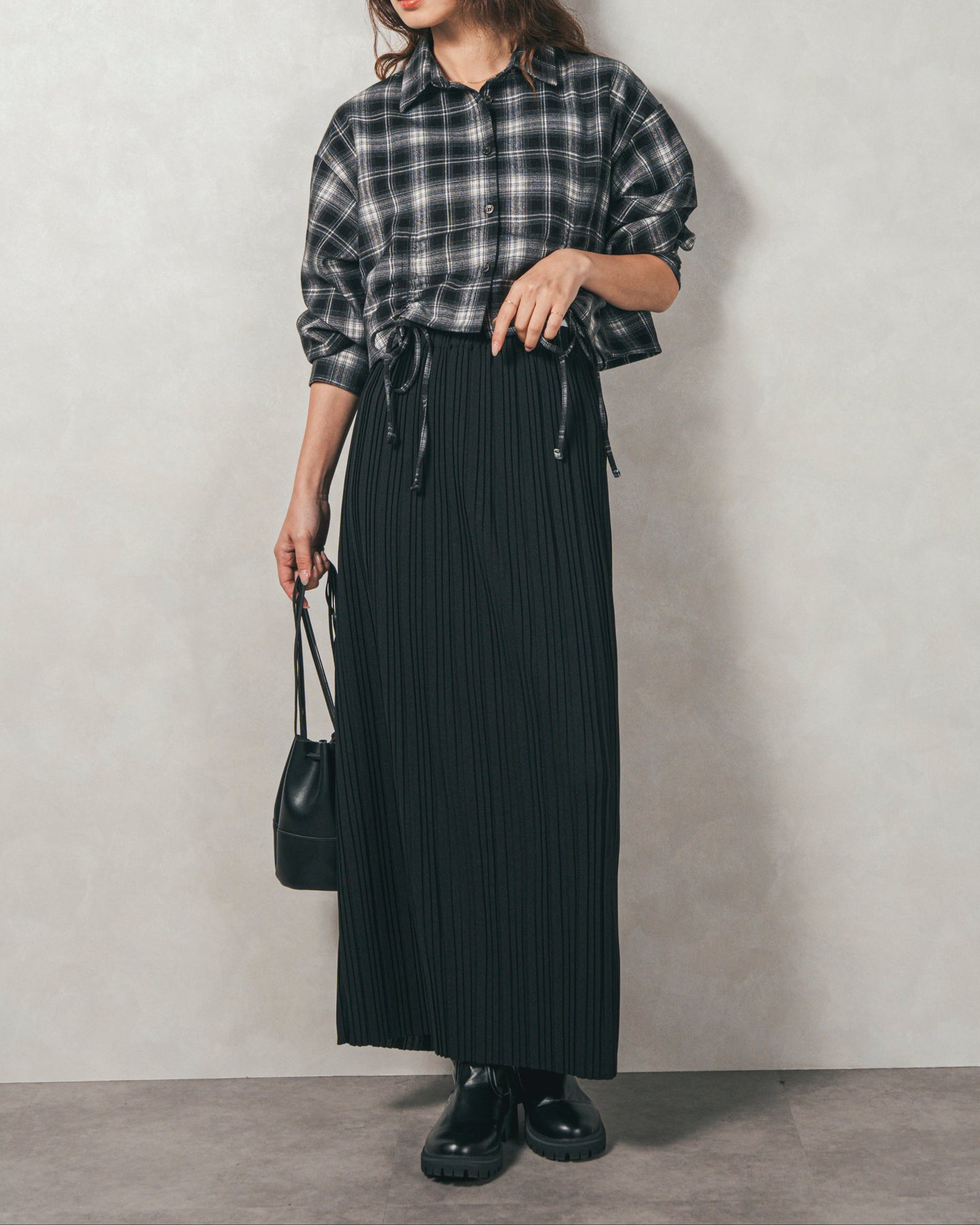 [SET]裾ドロストクロップドチェックシャツ+プリーツNarrowロングスカート(2SET)
