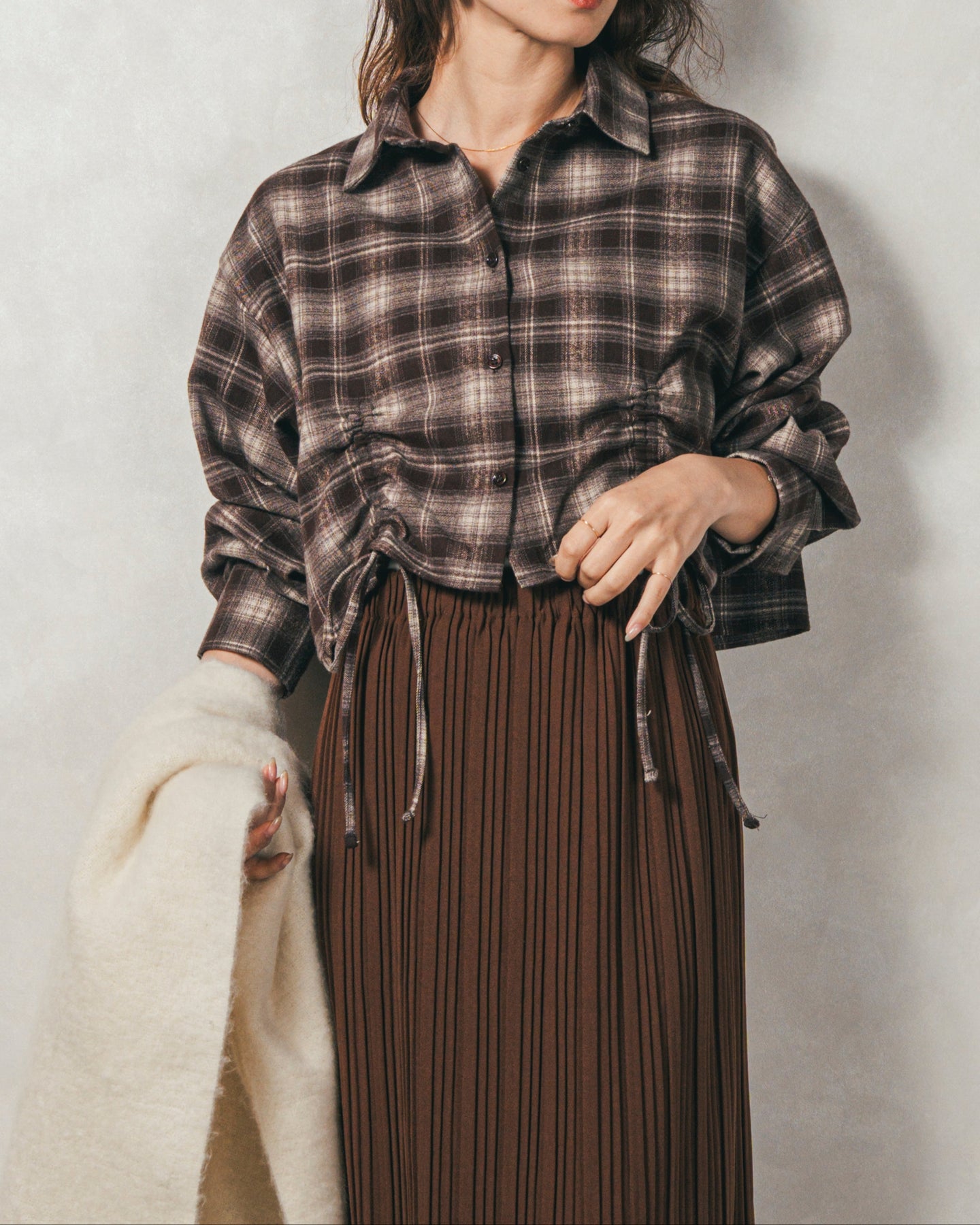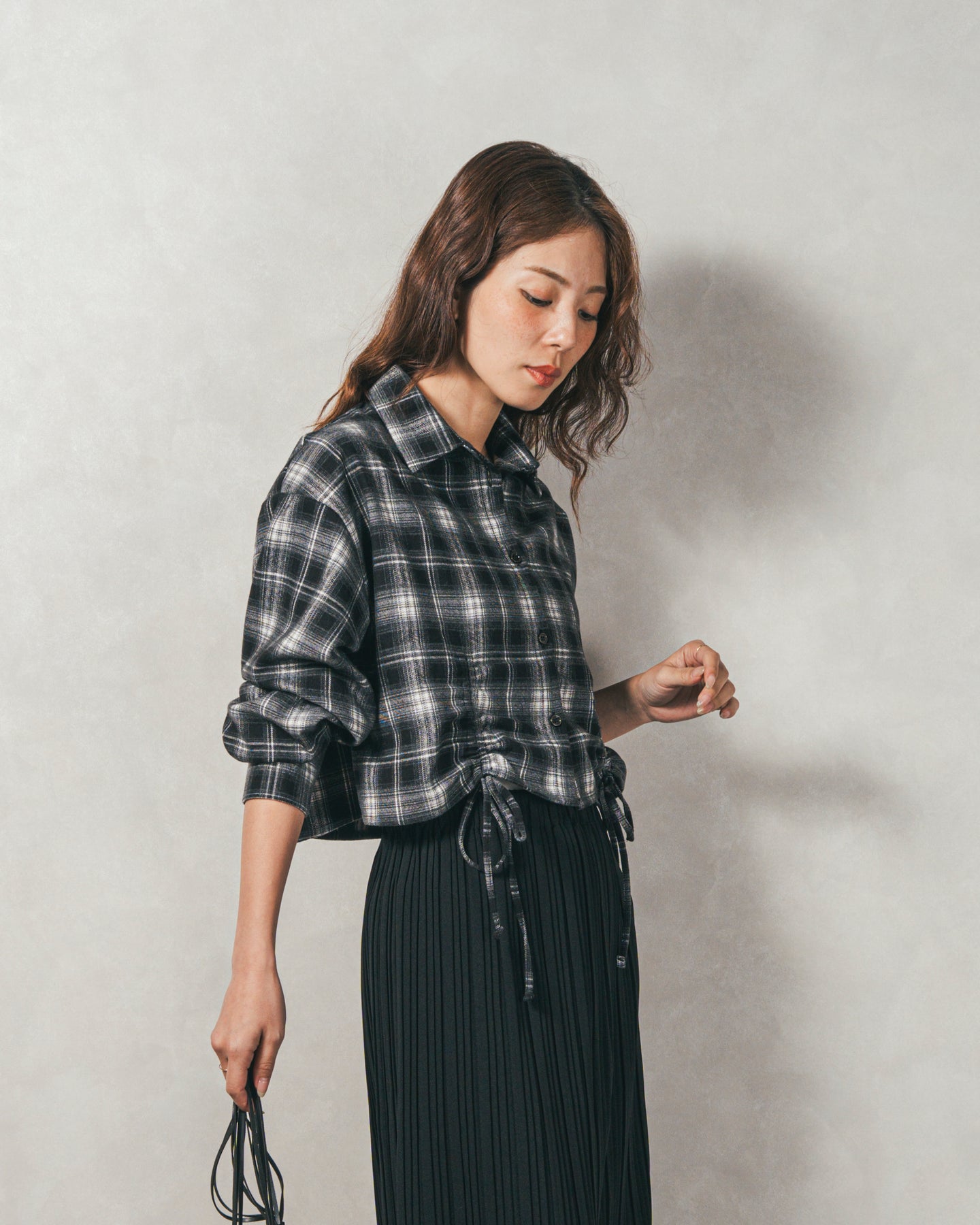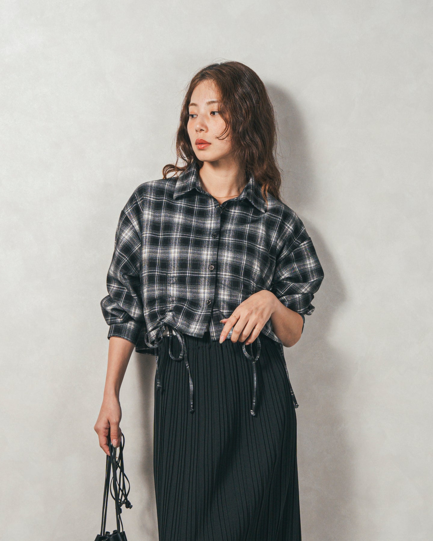 [SET]裾ドロストクロップドチェックシャツ+プリーツNarrowロングスカート(2SET)