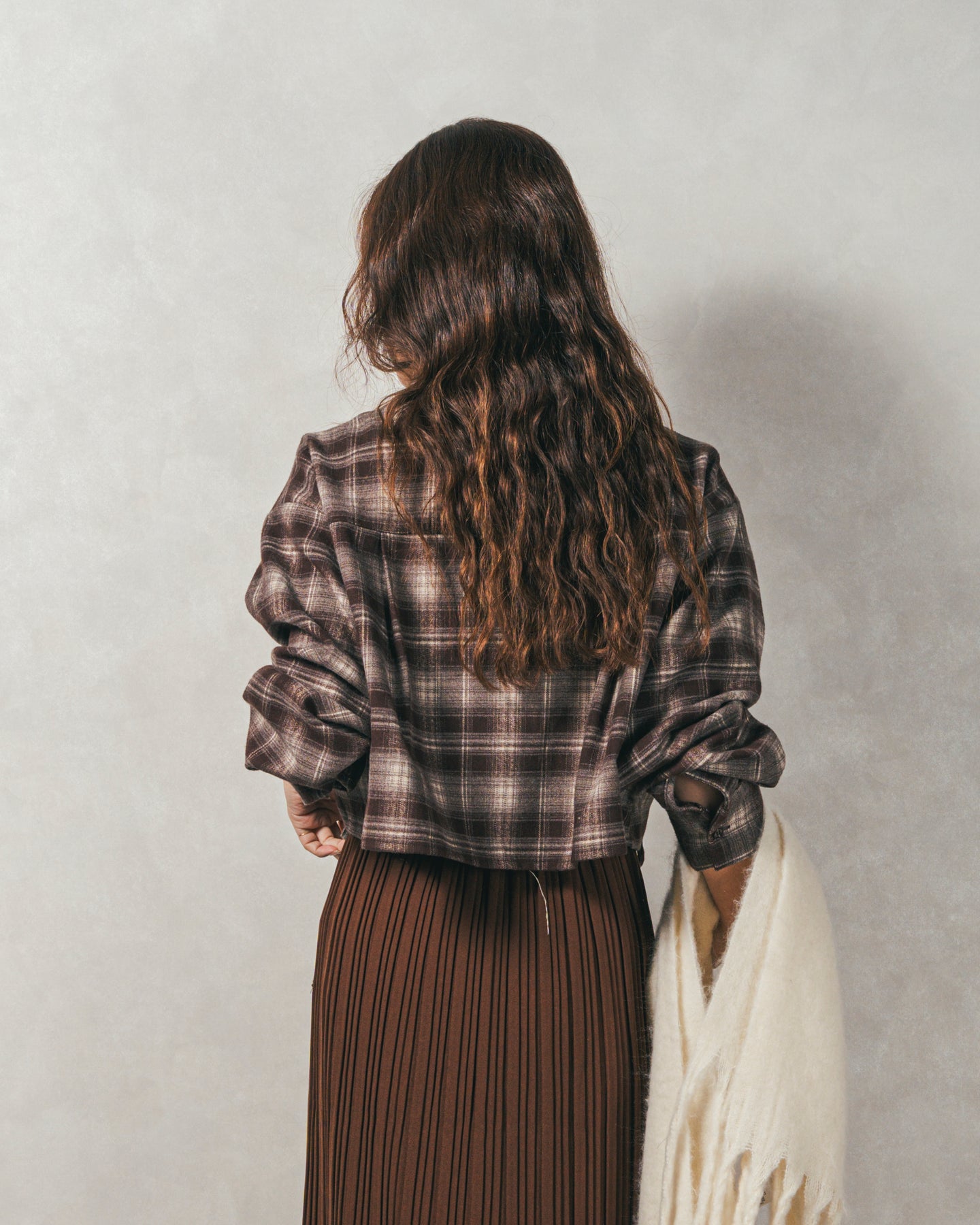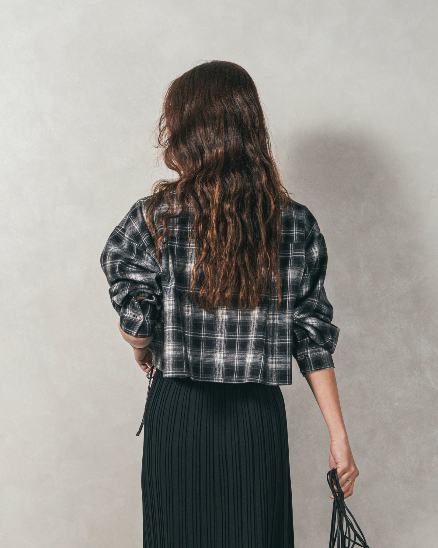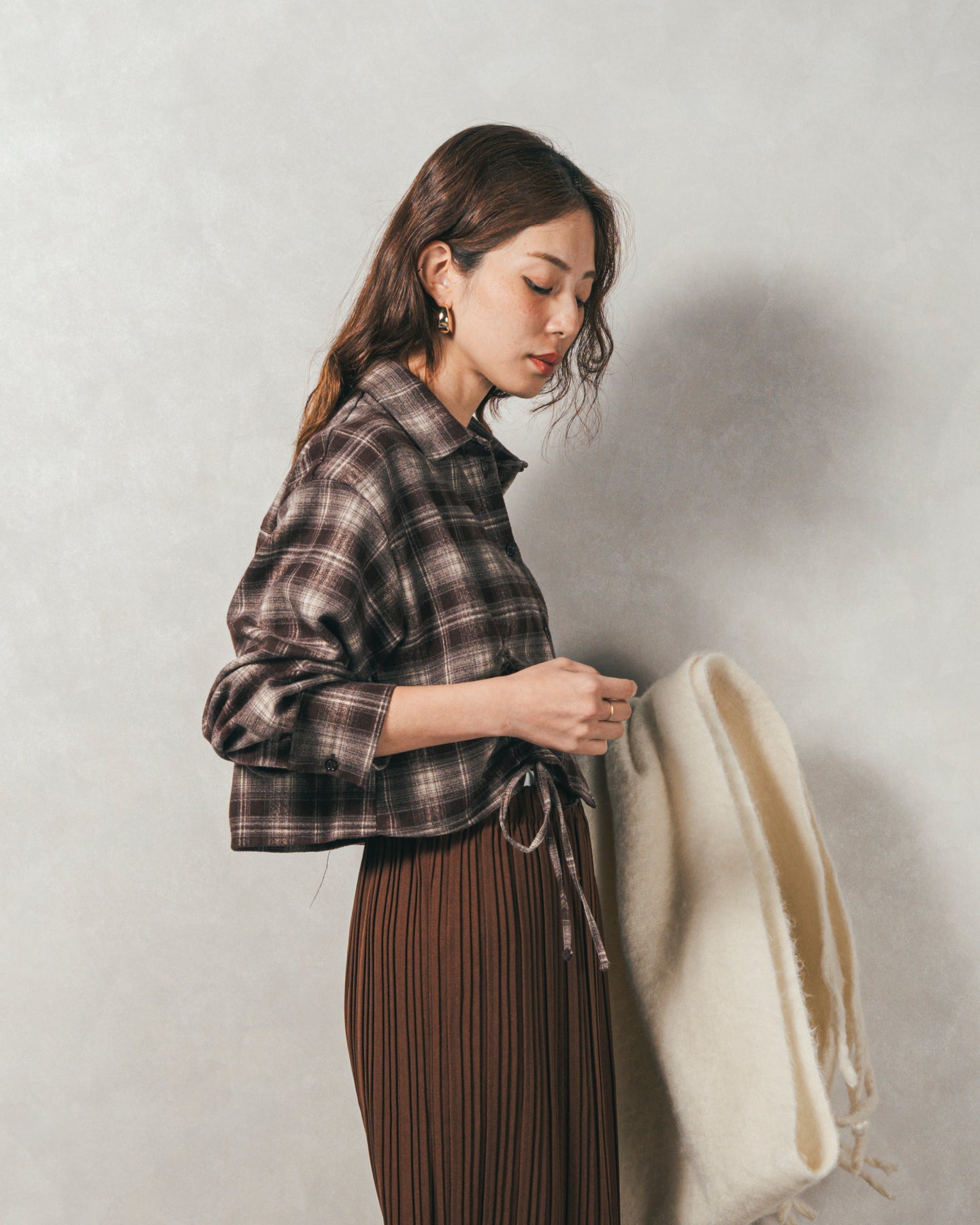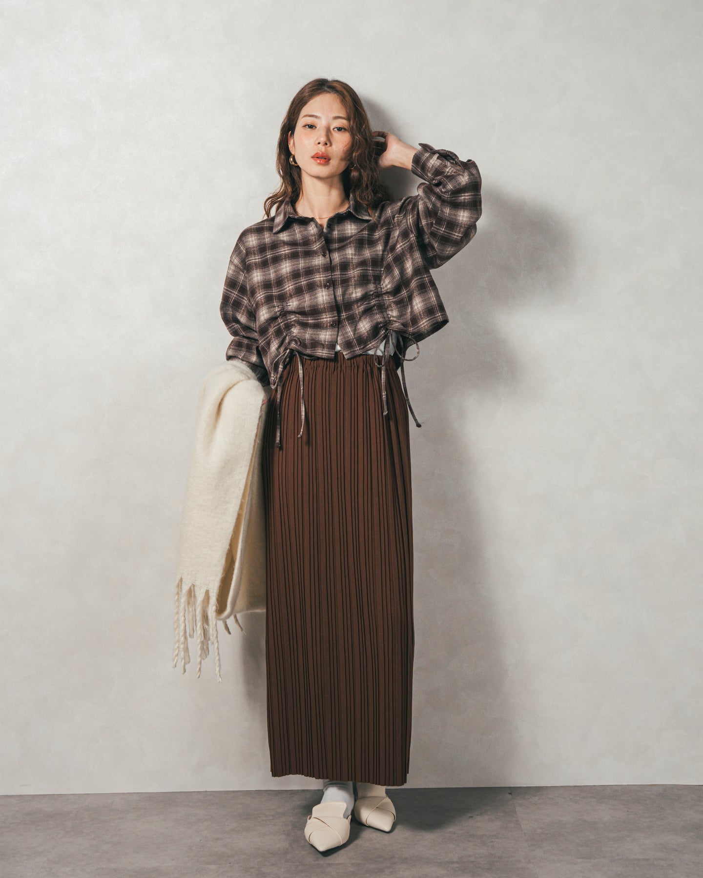 [SET]裾ドロストクロップドチェックシャツ+プリーツNarrowロングスカート(2SET)
