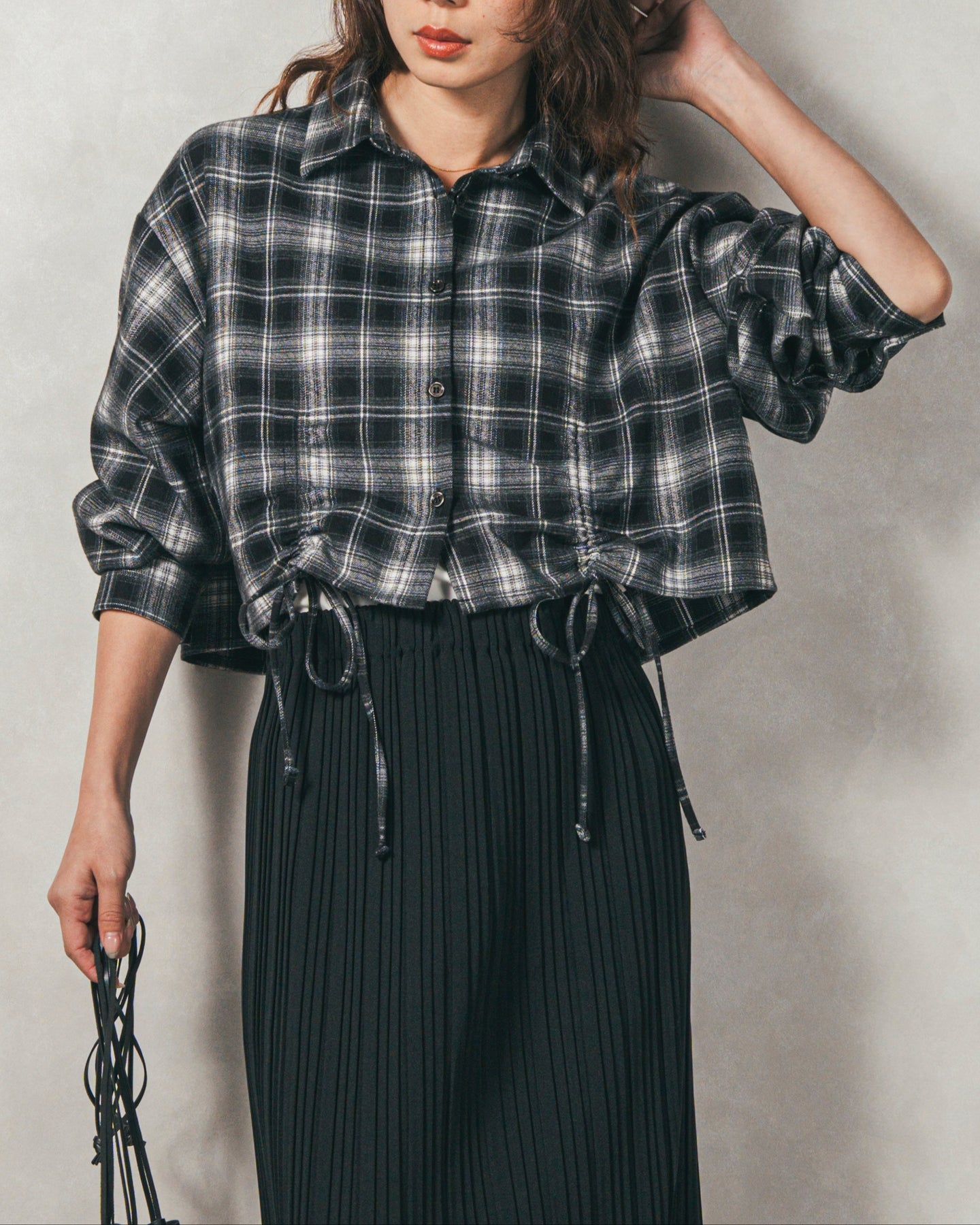 ・裾ドロストクロップドチェックシャツ