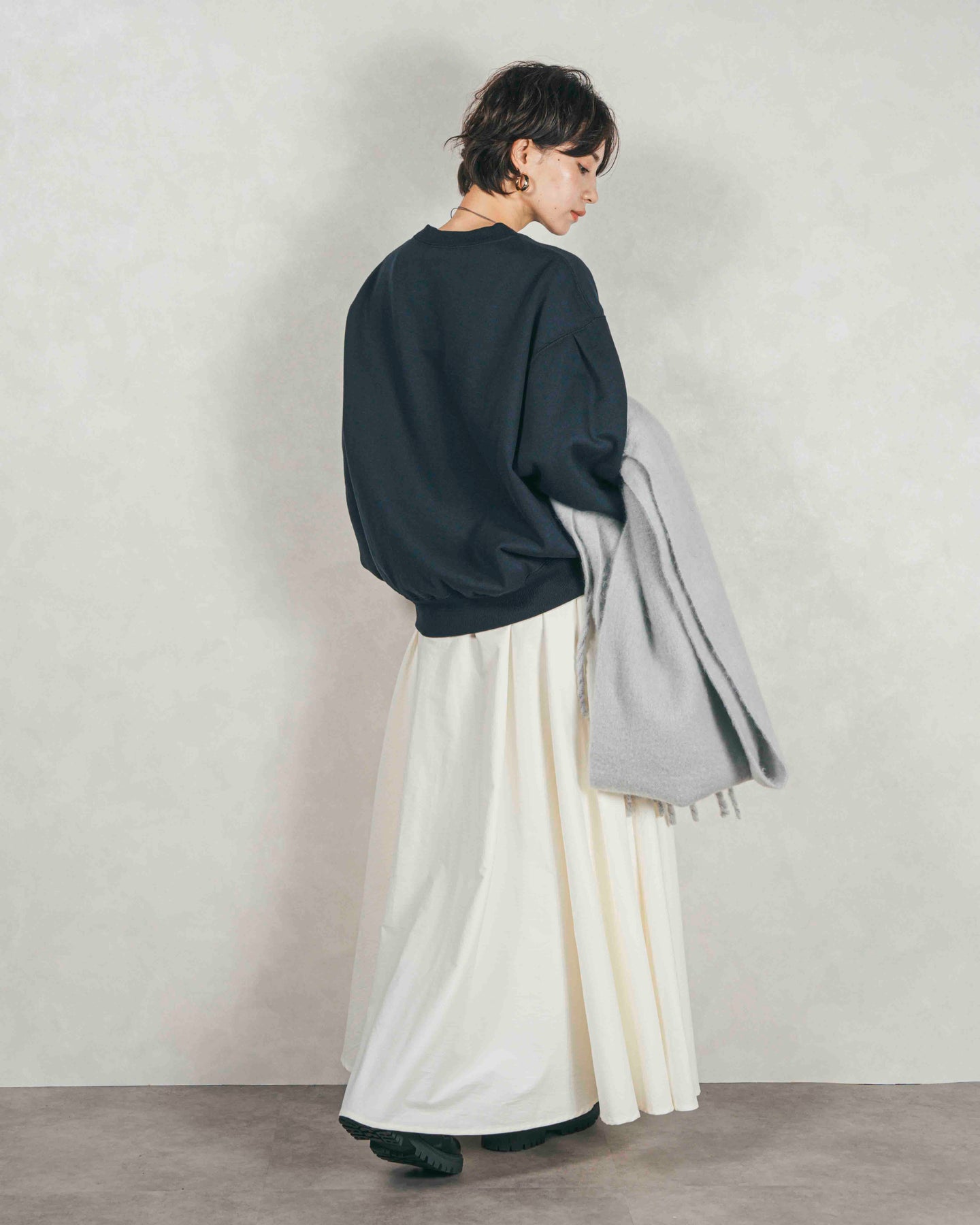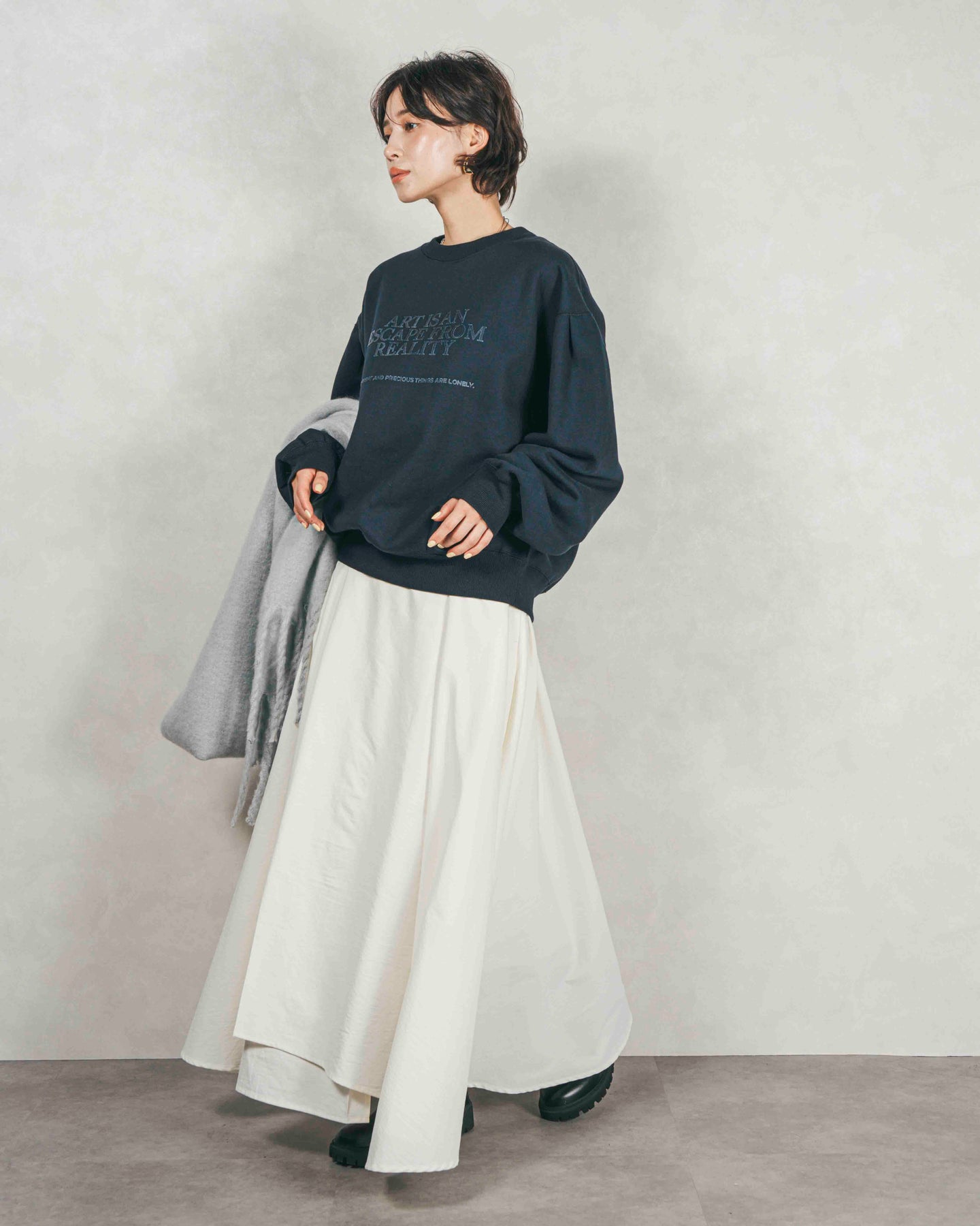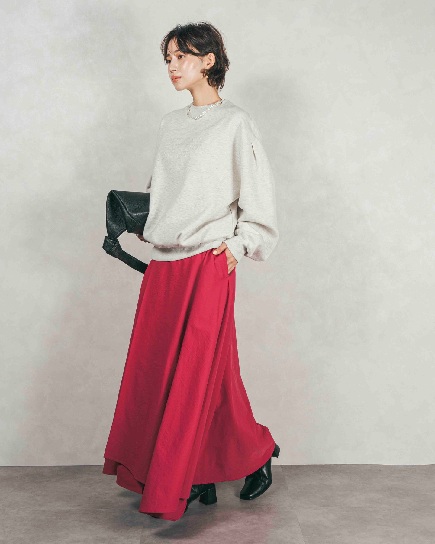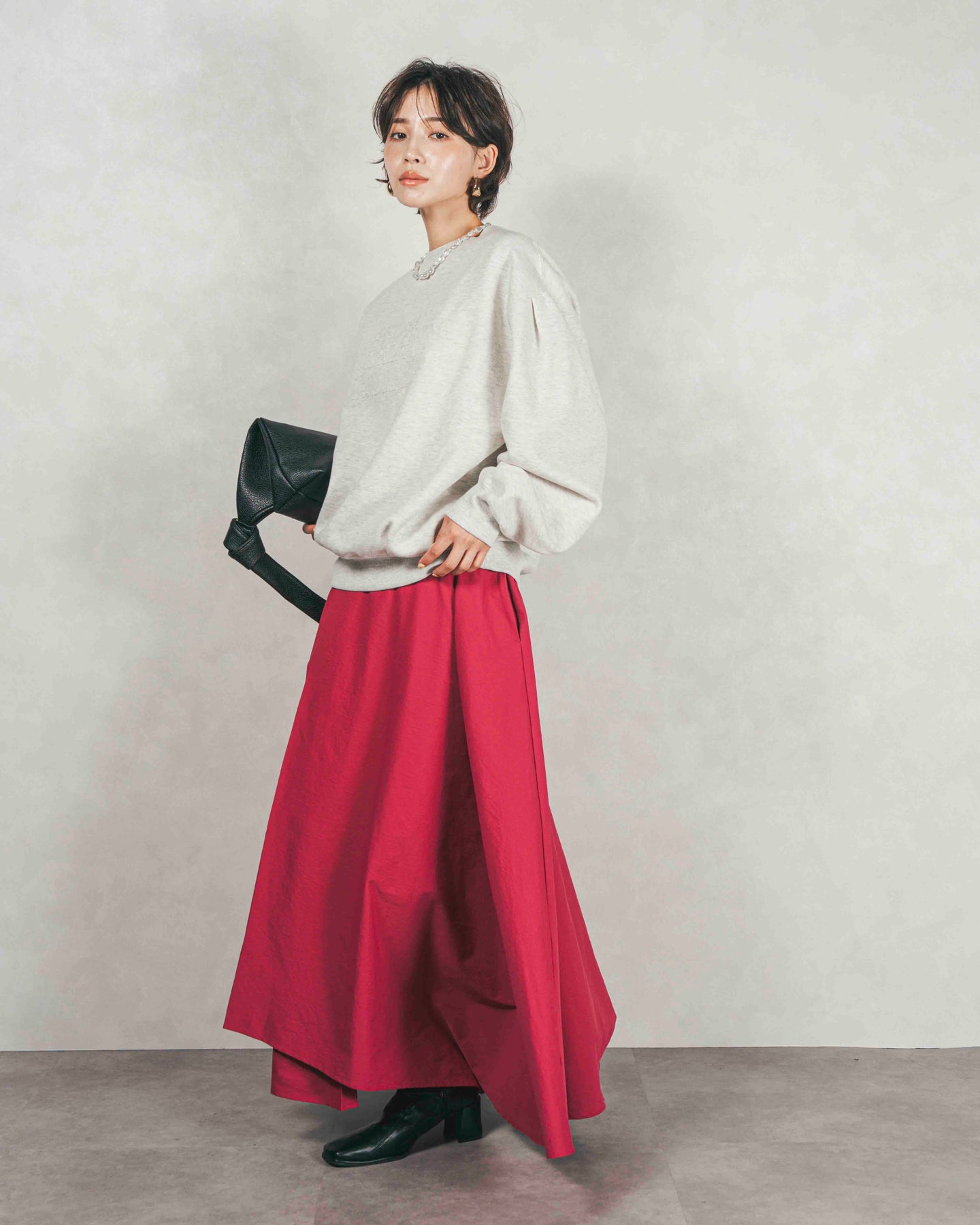 たっぷりと長さはあるものの、アシメデザインなので抜け感があり重く見えません。ボリュームあるニットやスウェットにも相性良く、合わせるトップスによってはきれいめにも着こなせる万能スカート。デイリー使いに便利なポケットも◎
