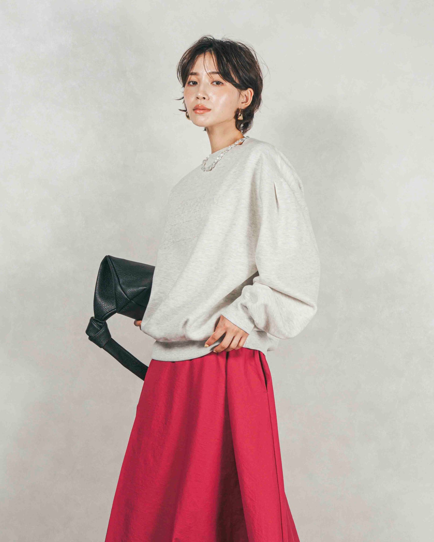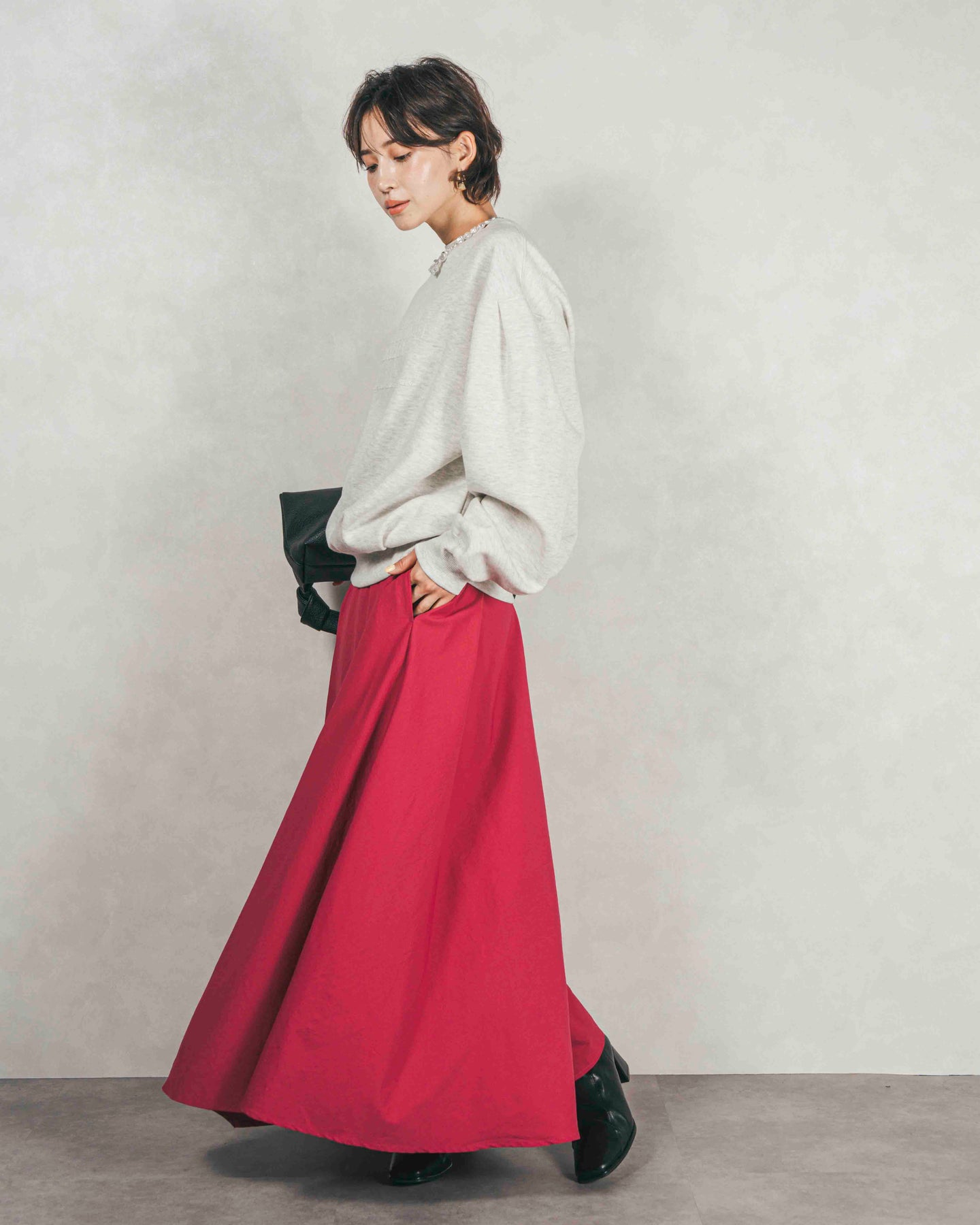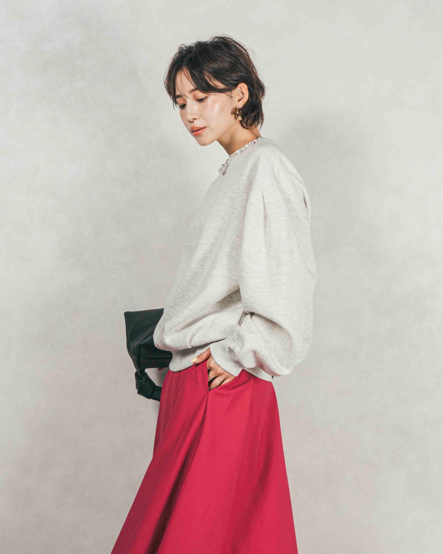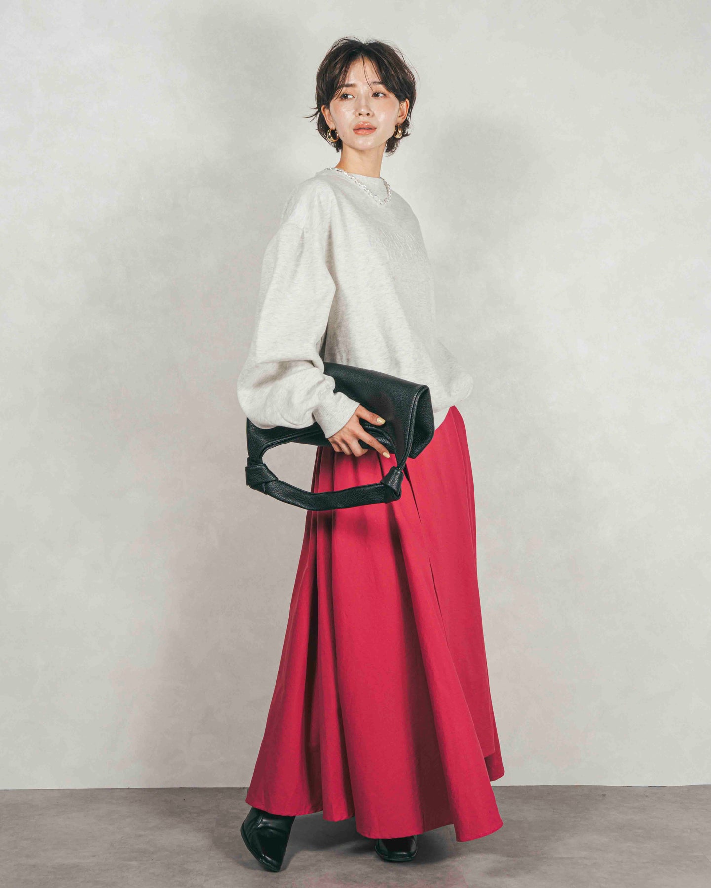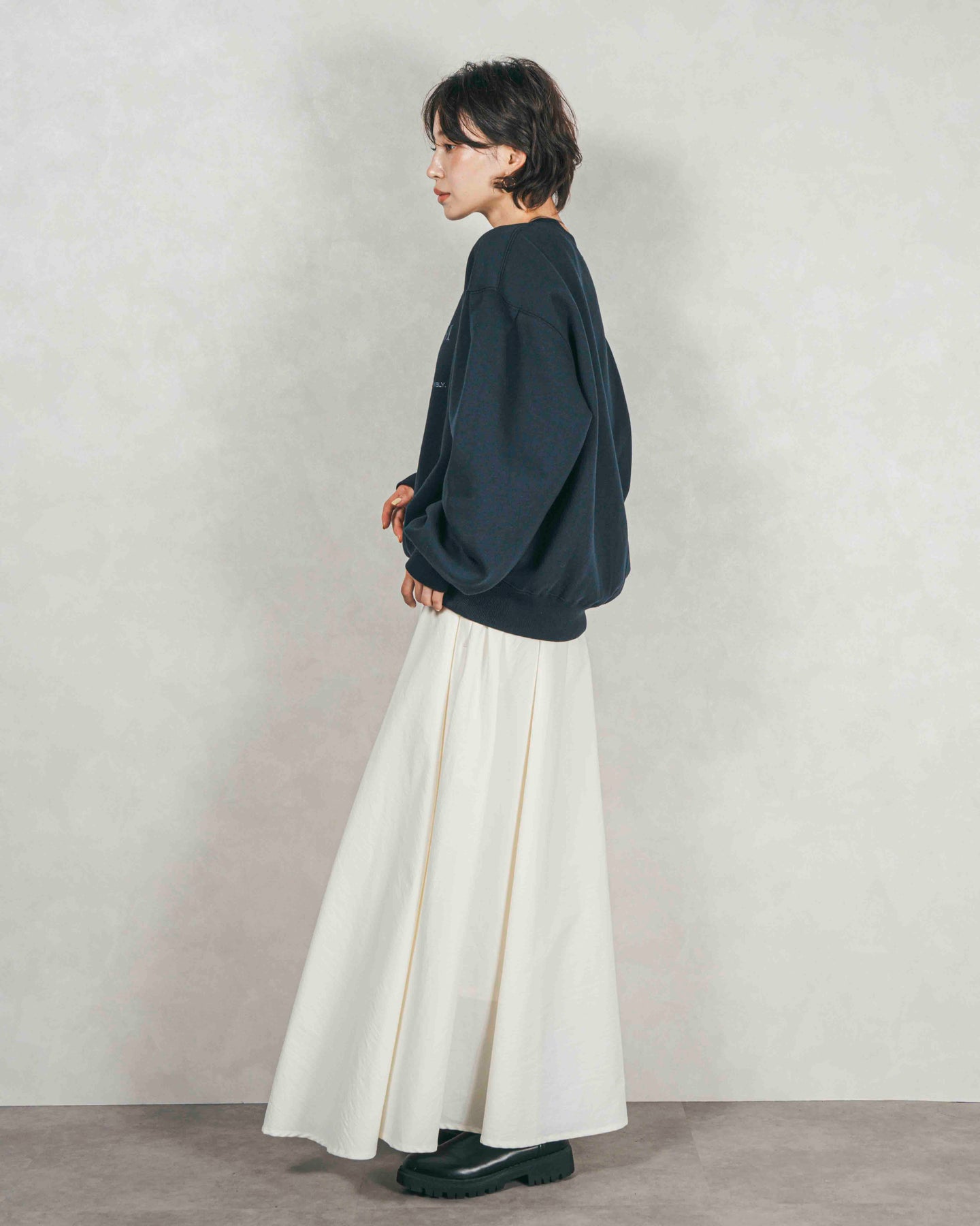 たっぷりと長さはあるものの、アシメデザインなので抜け感があり重く見えません。ボリュームあるニットやスウェットにも相性良く、合わせるトップスによってはきれいめにも着こなせる万能スカート。デイリー使いに便利なポケットも◎
