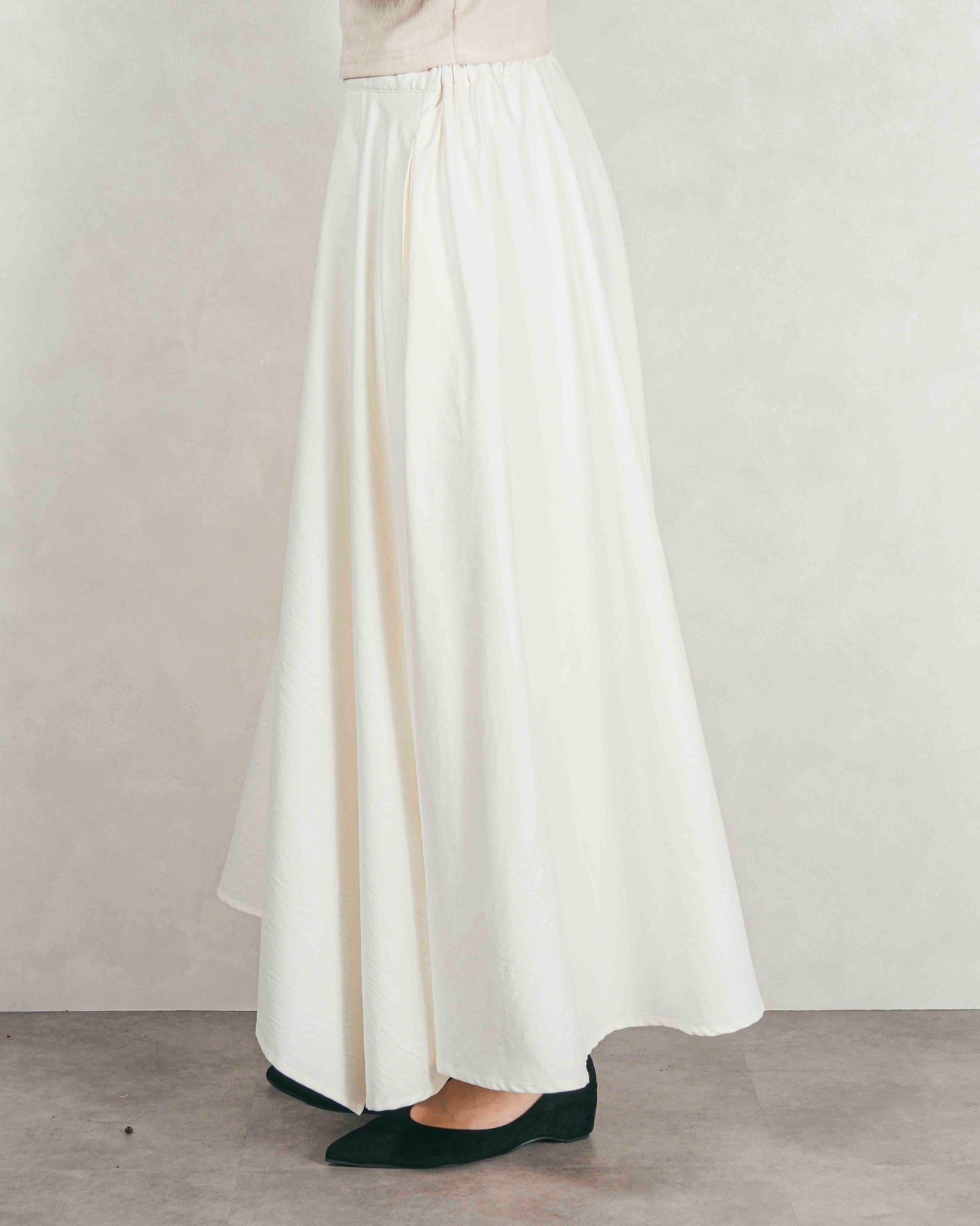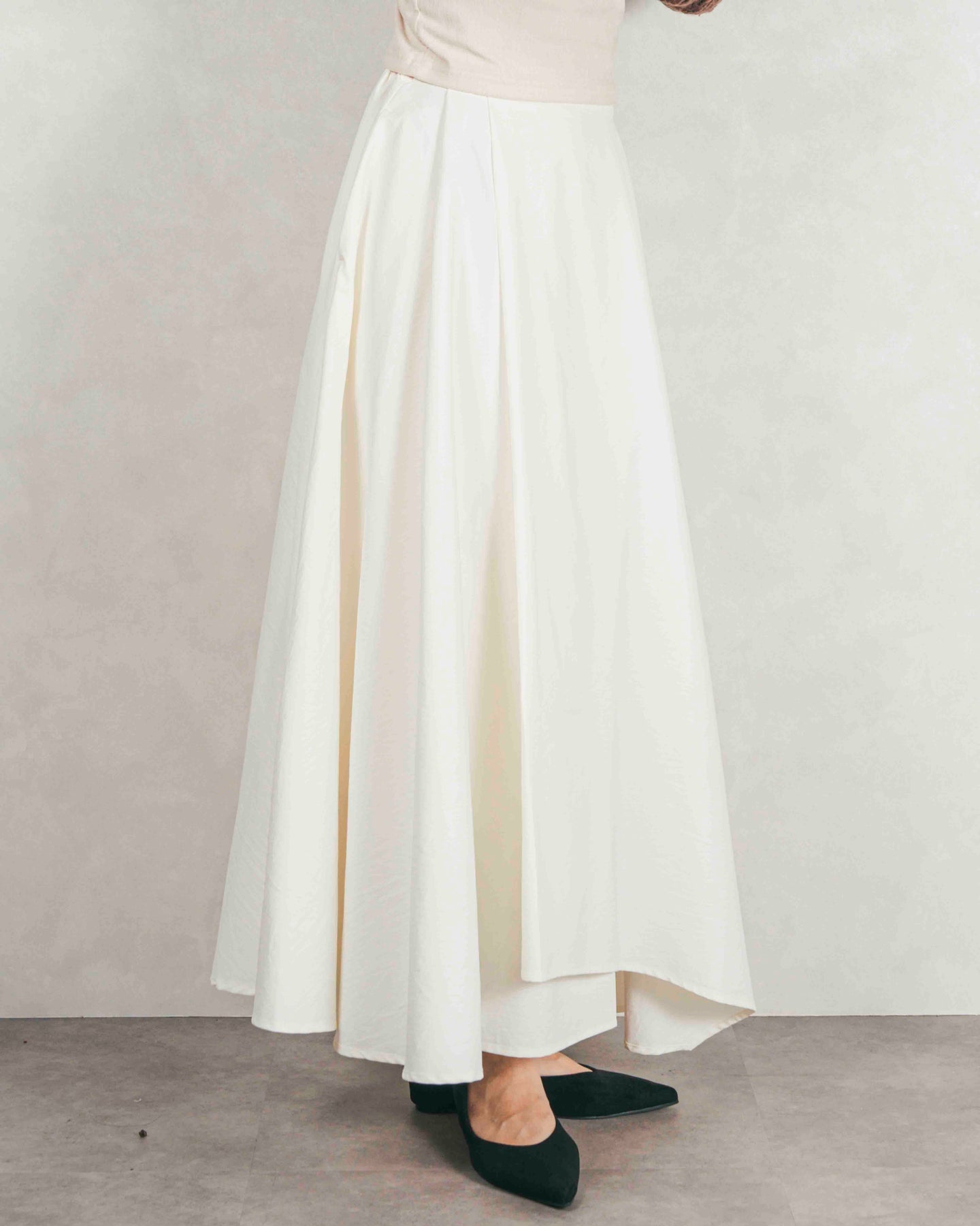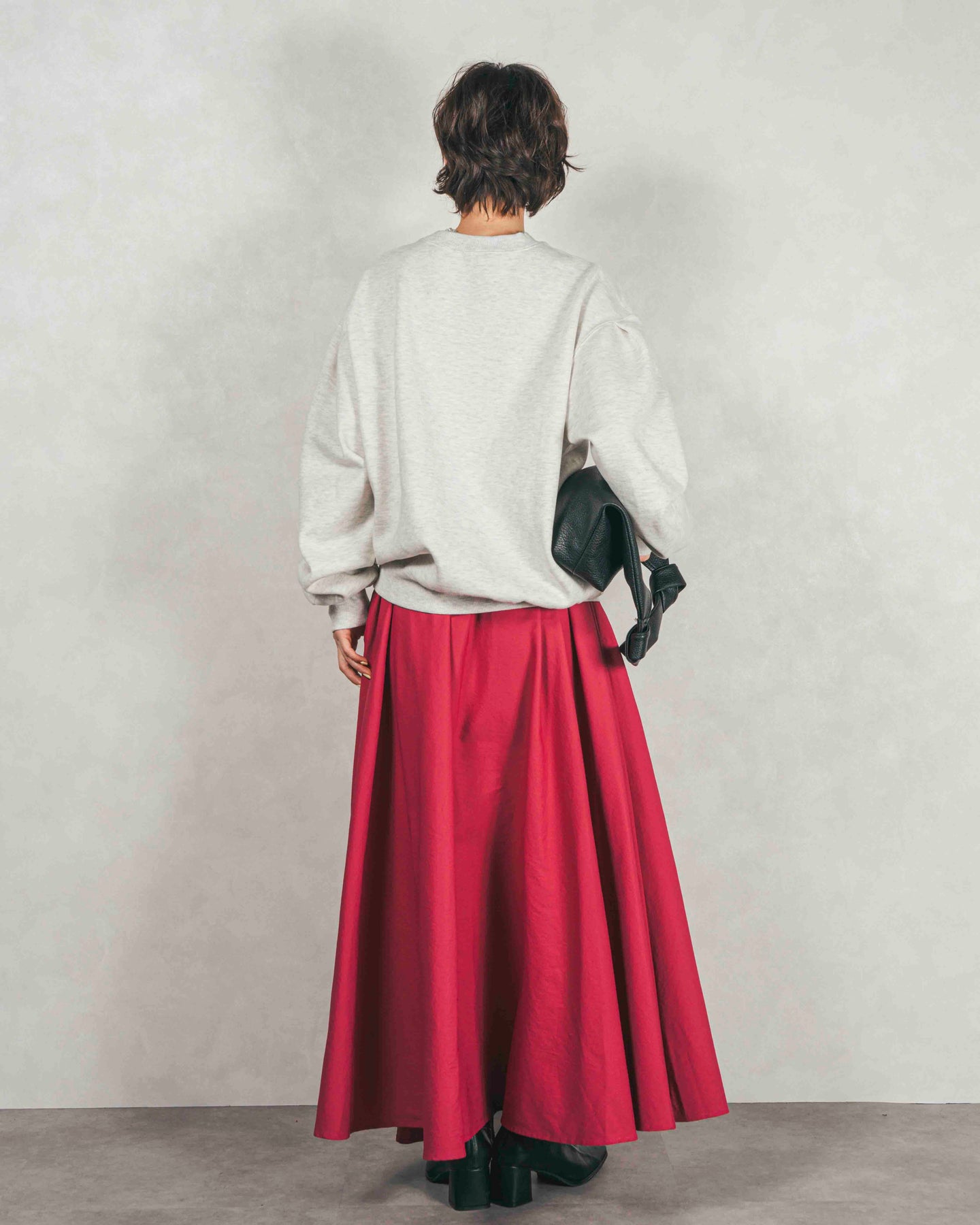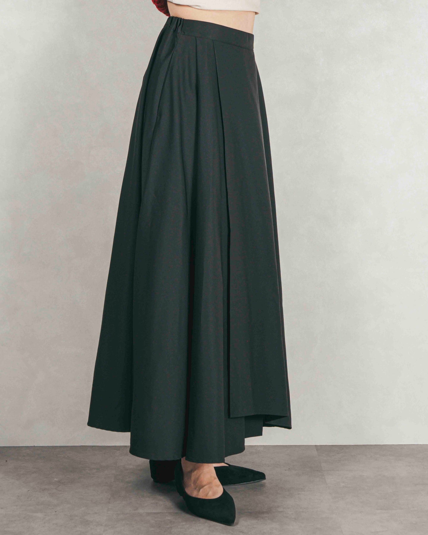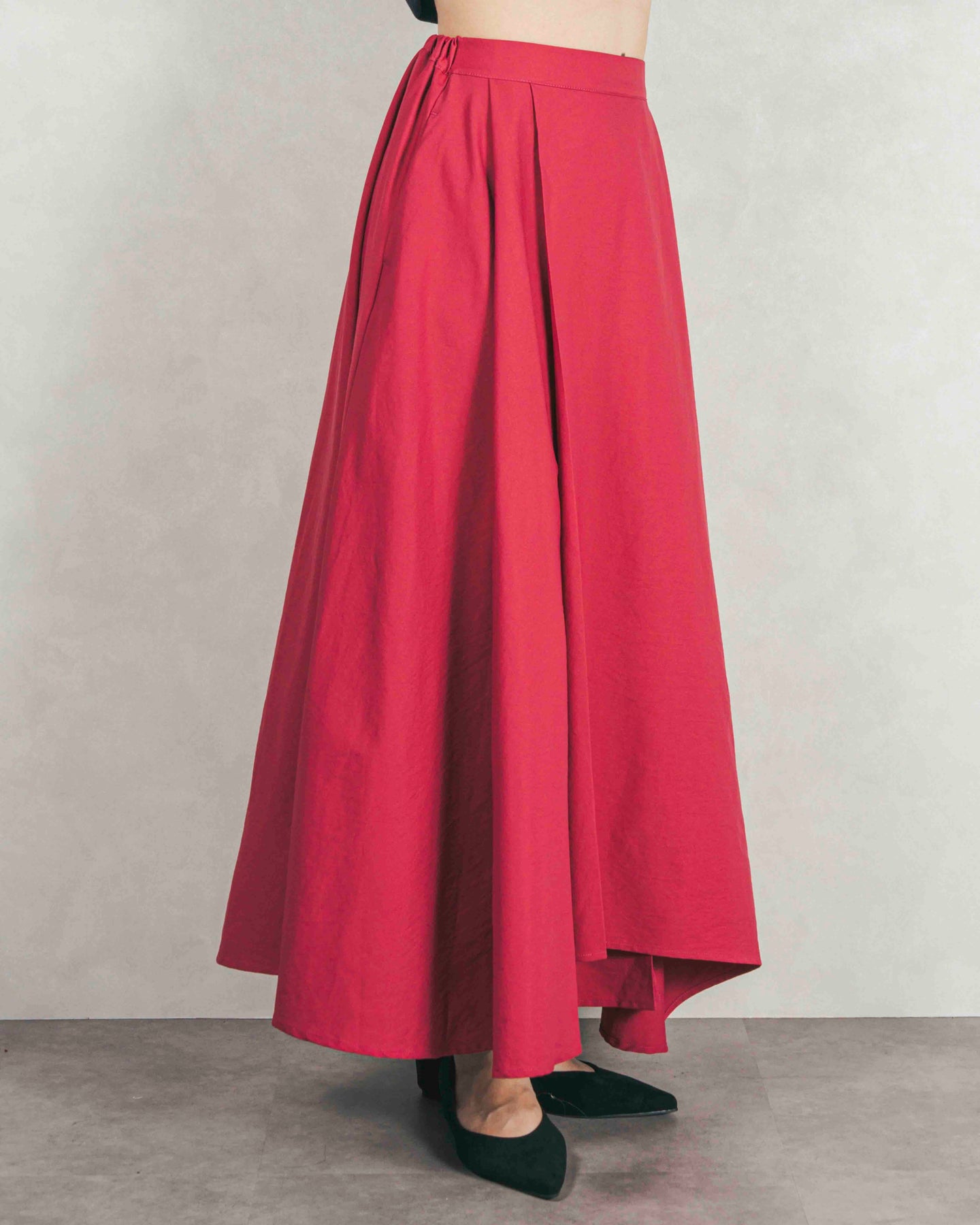たっぷりの生地で贅沢に作られたタックスカートです。アシメントリーのヘムラインが動きを出してくれ、ゆれるシルエットが華やか。タック奥にはスリットもあるので、足さばきも◎前ウエストにはギャザーを寄せていないので、タックインしたときもすっきりし、スタイルアップ見えします。
