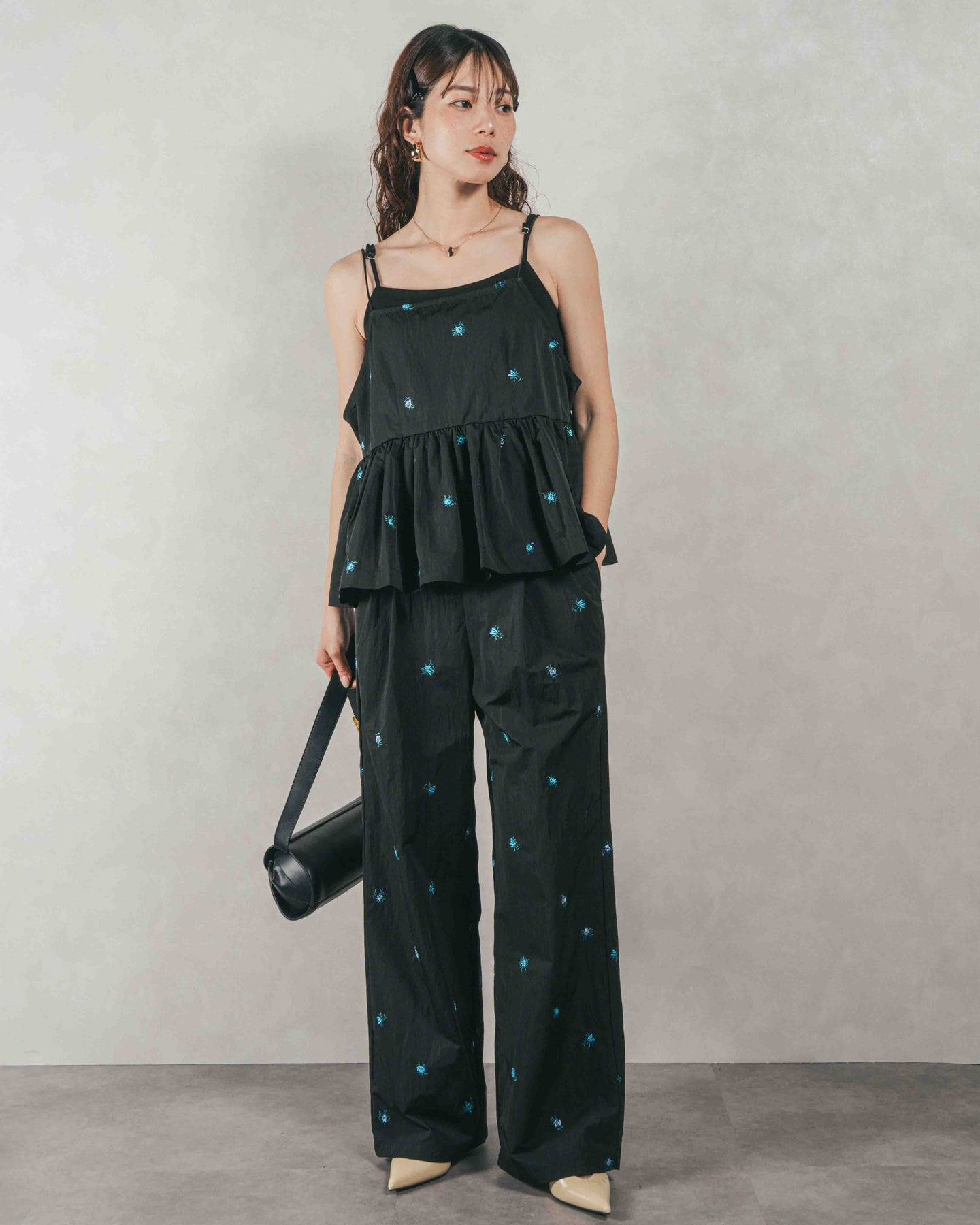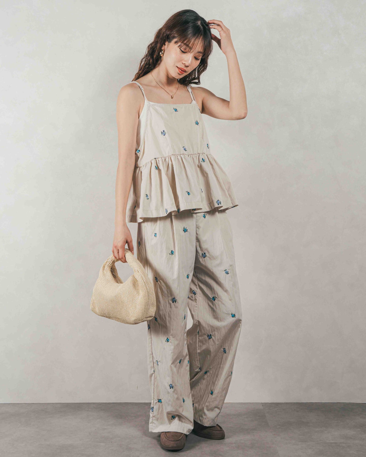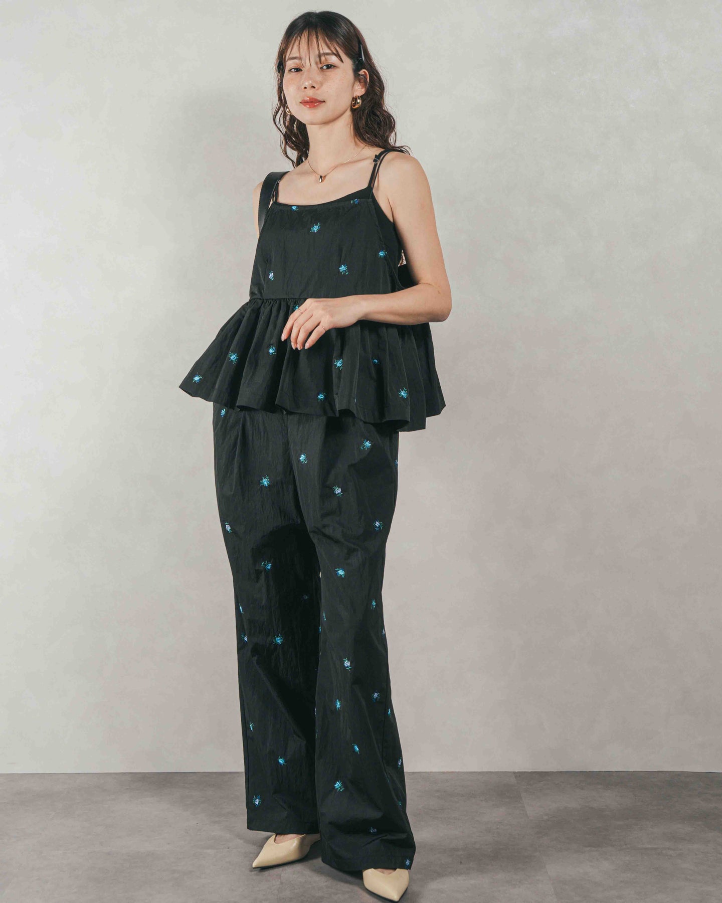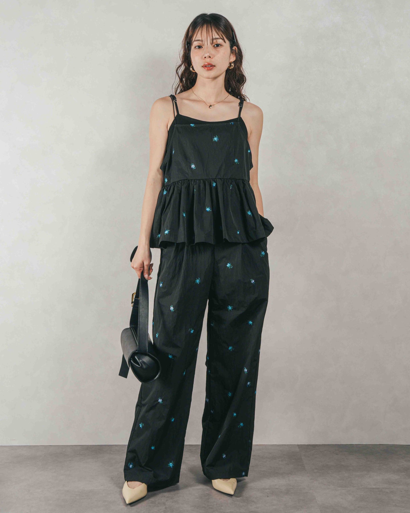 [SET]Flower刺繍 ボリュームキャミ + Flower刺繍 タックパンツ(2SET)
