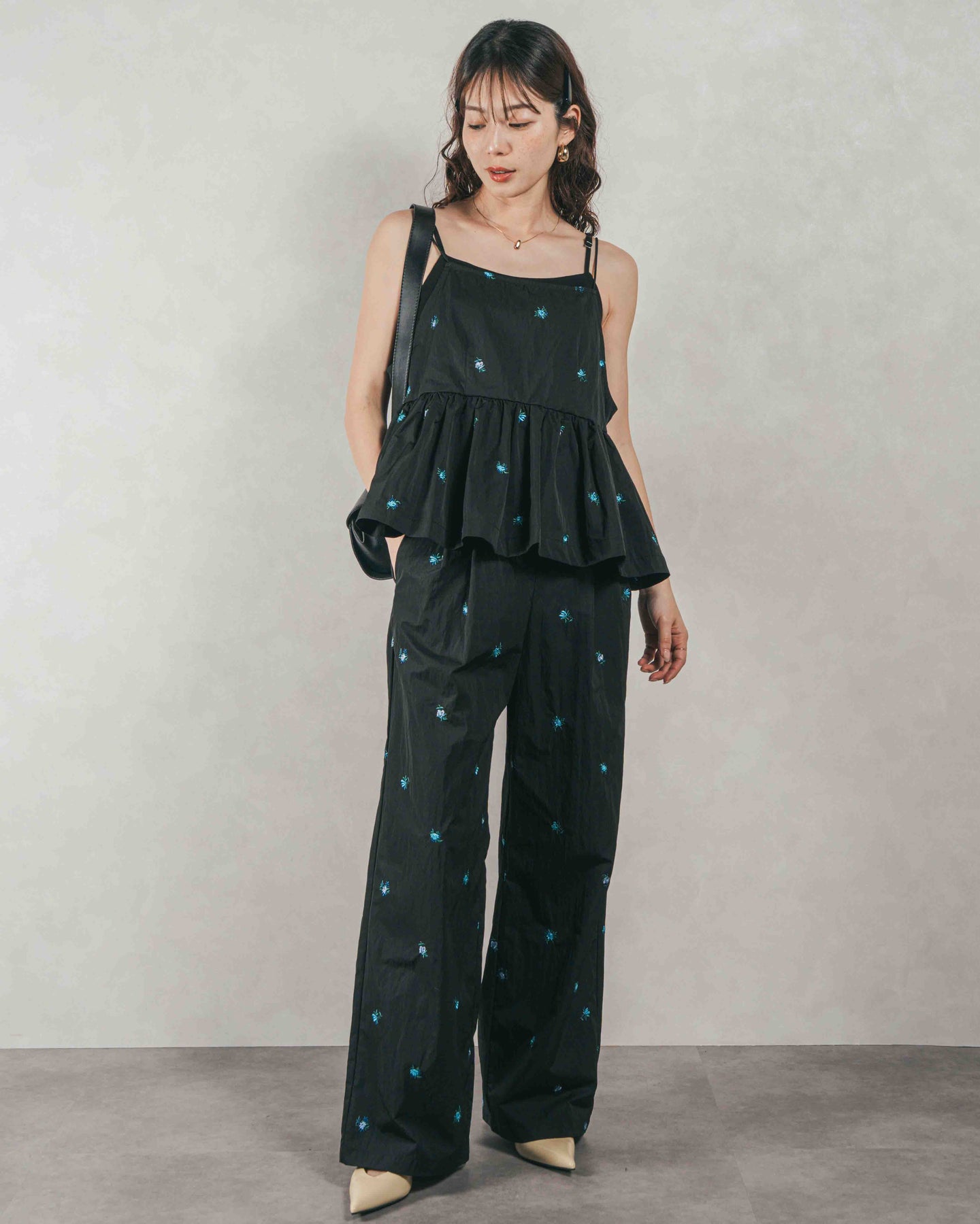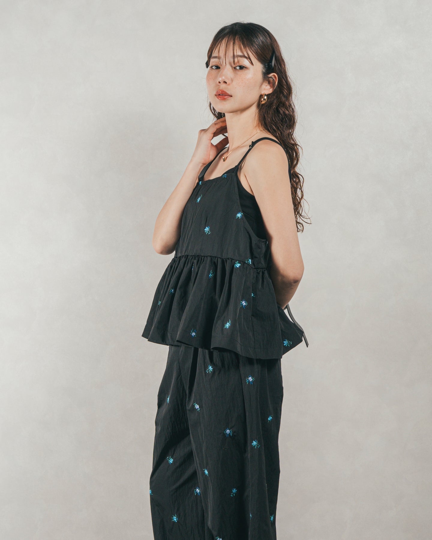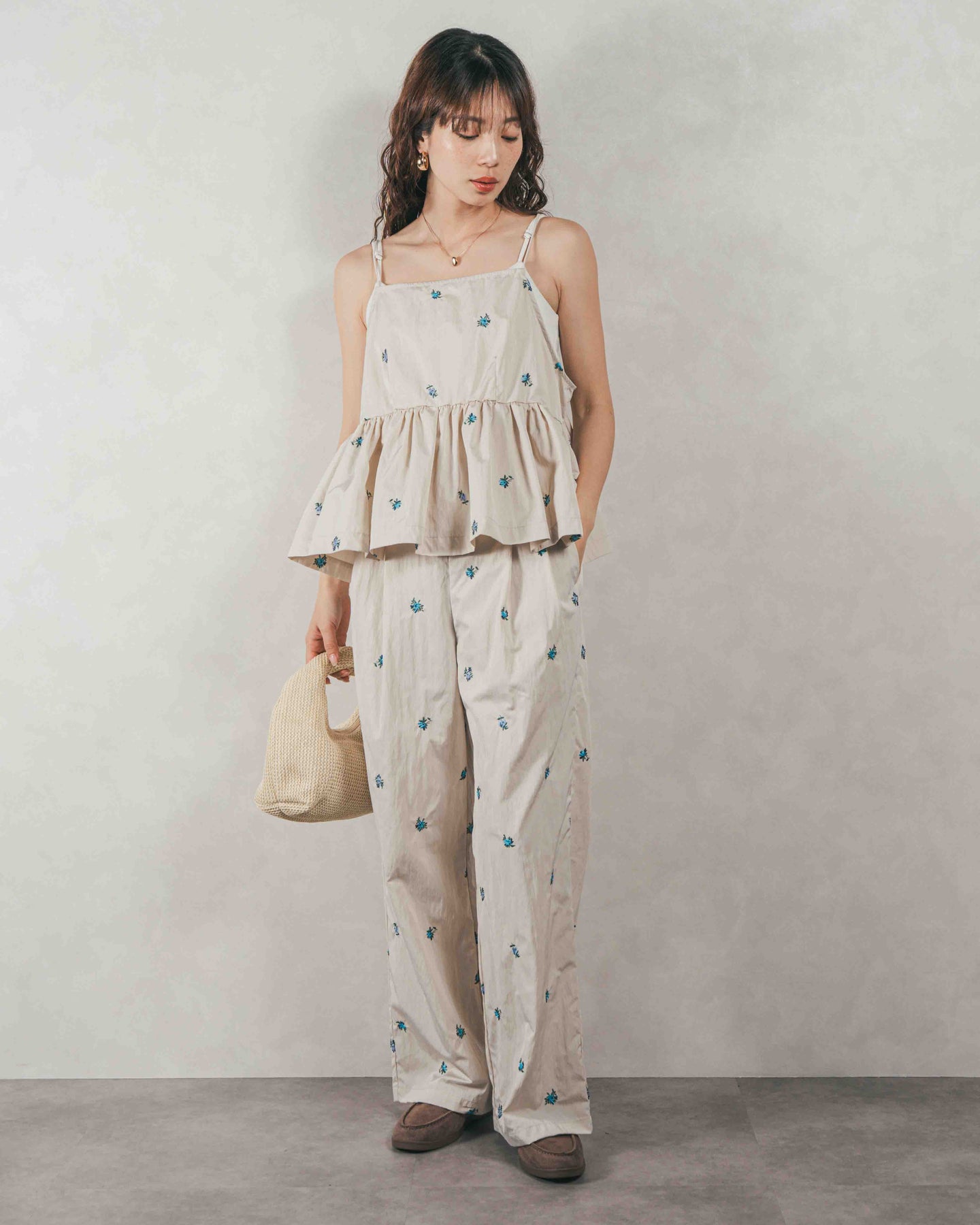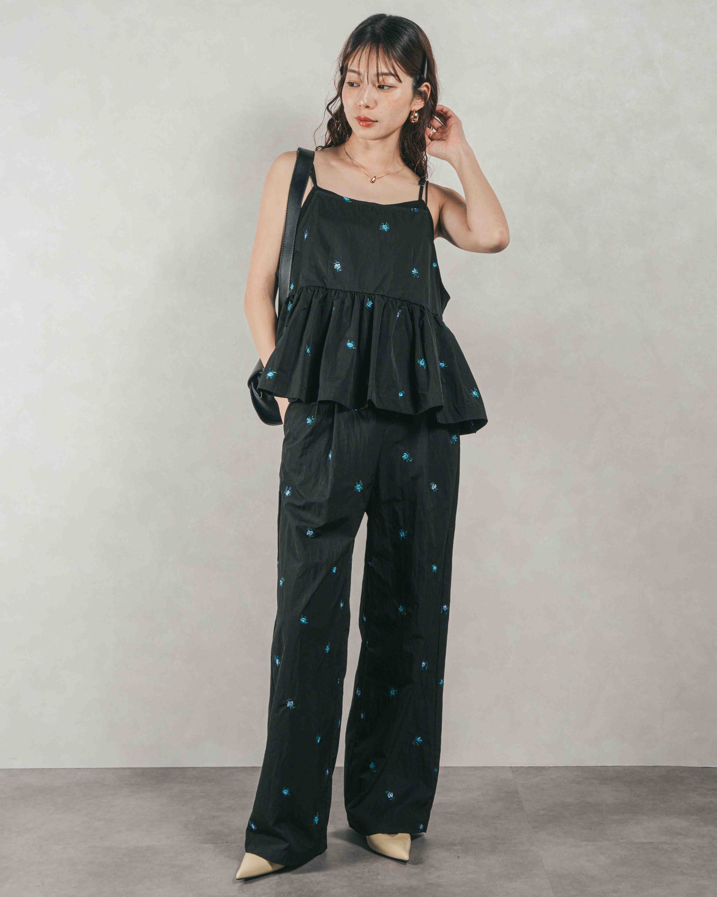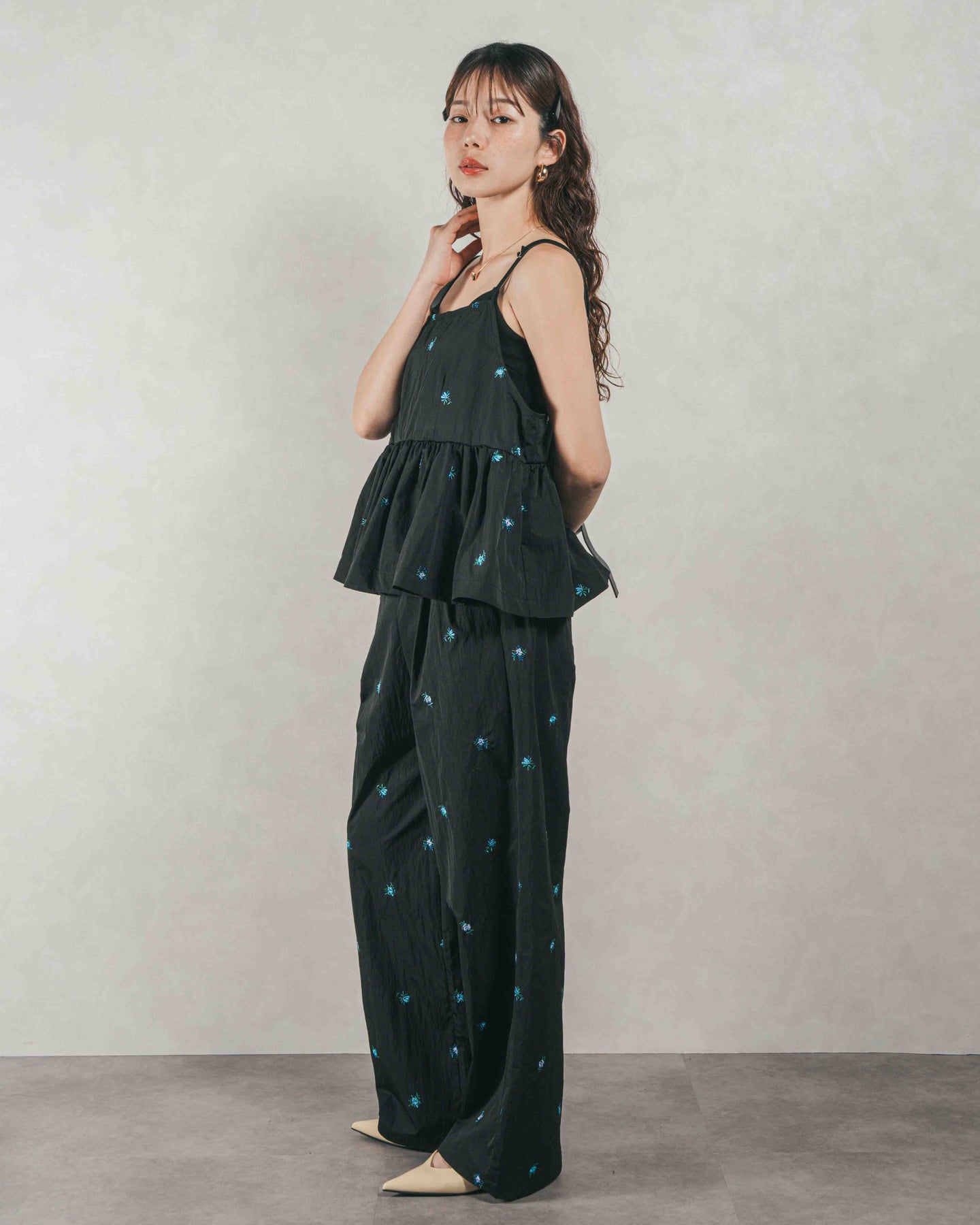 [SET]Flower刺繍 ボリュームキャミ + Flower刺繍 タックパンツ(2SET)