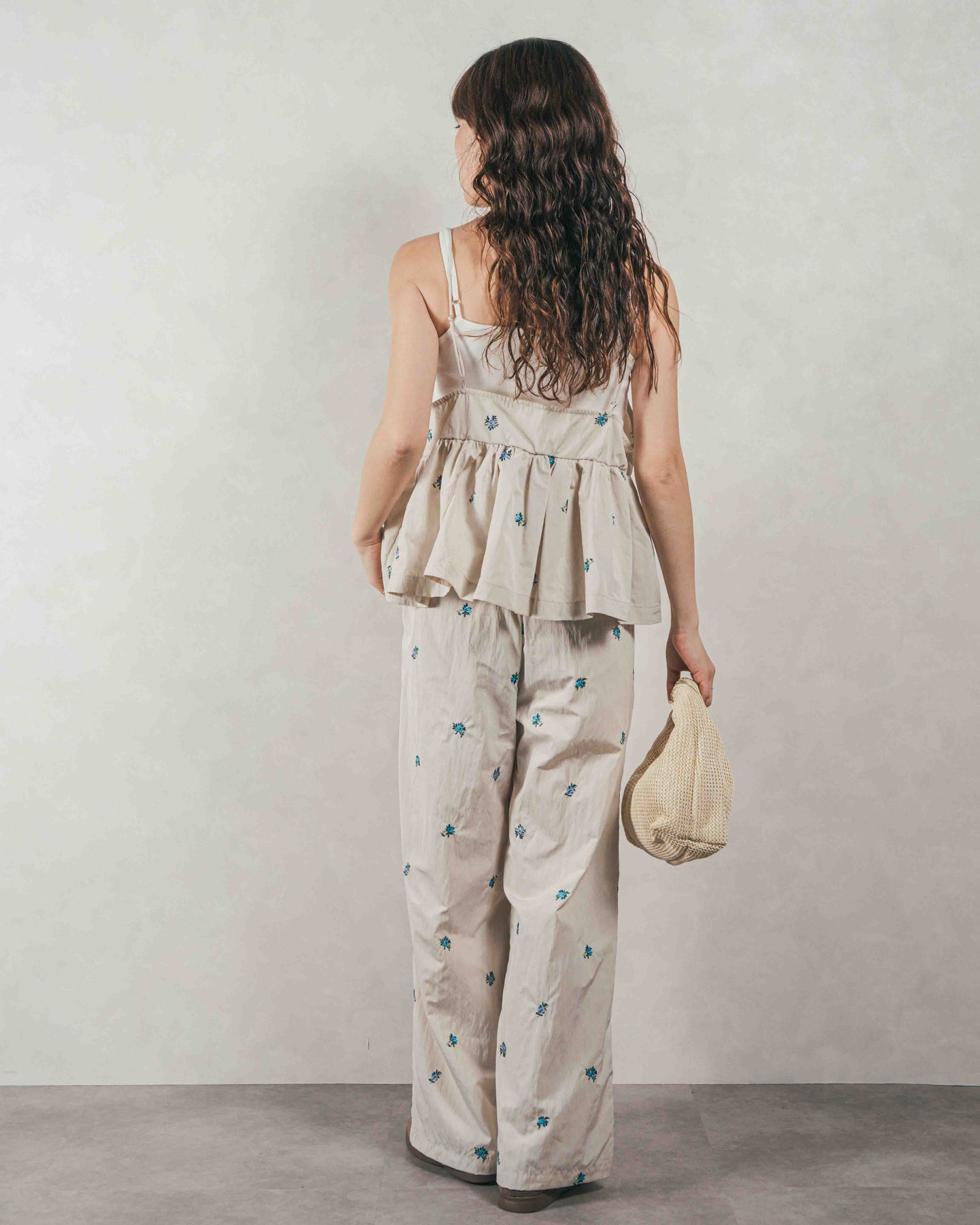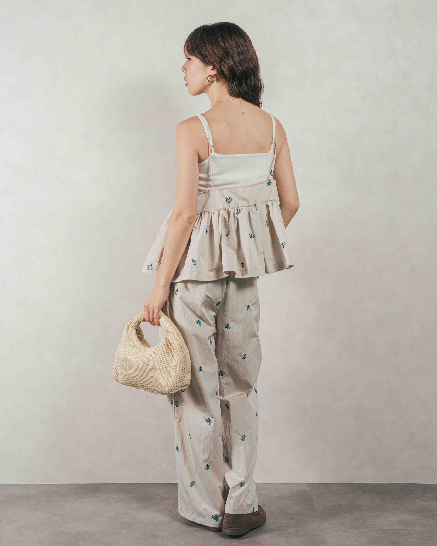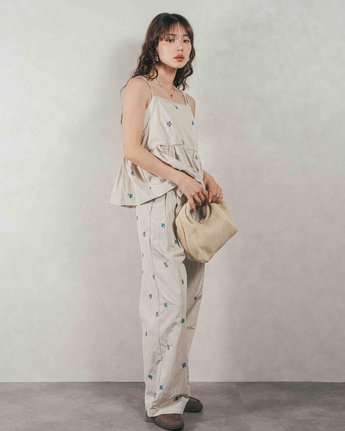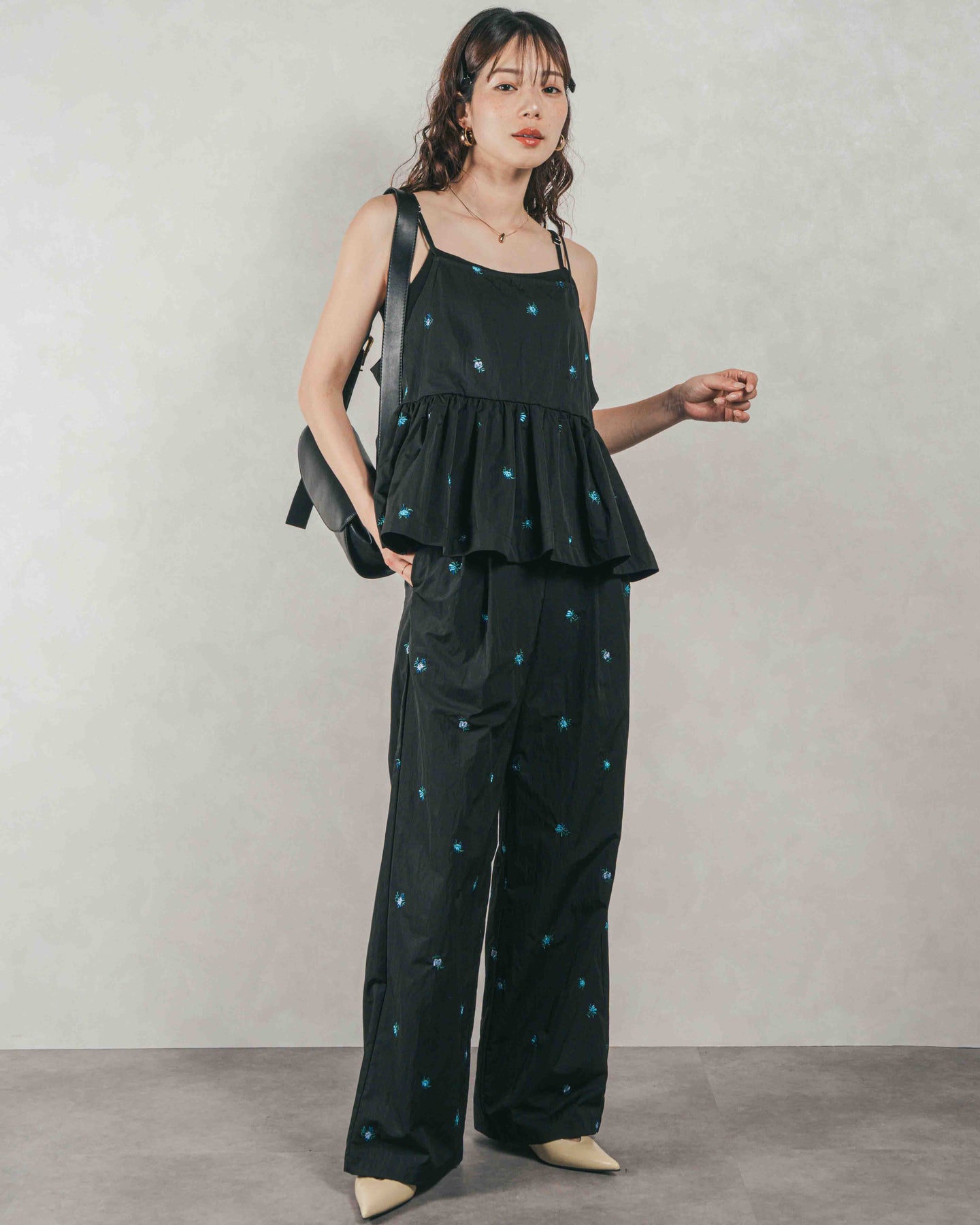 [SET]Flower刺繍 ボリュームキャミ + Flower刺繍 タックパンツ(2SET)