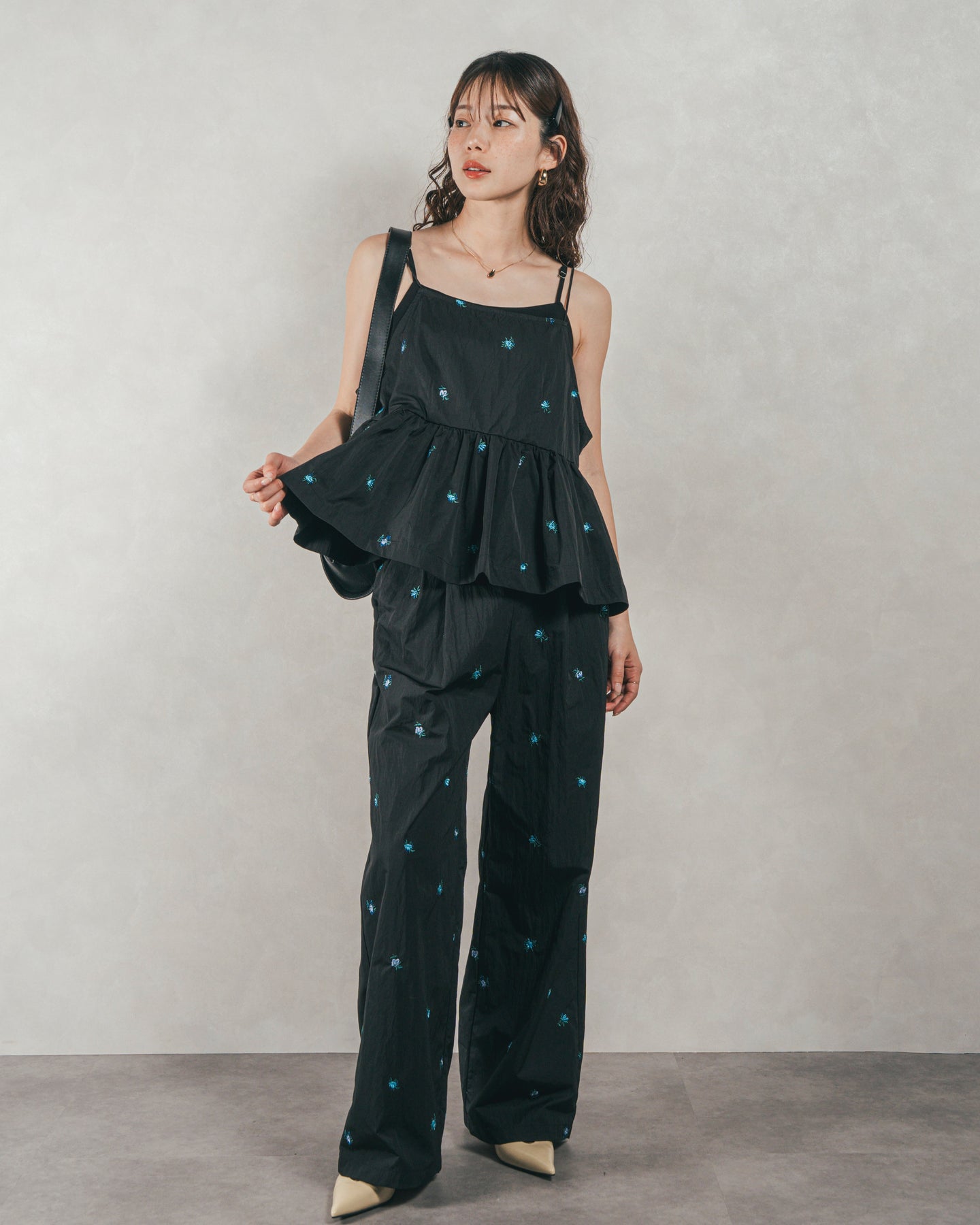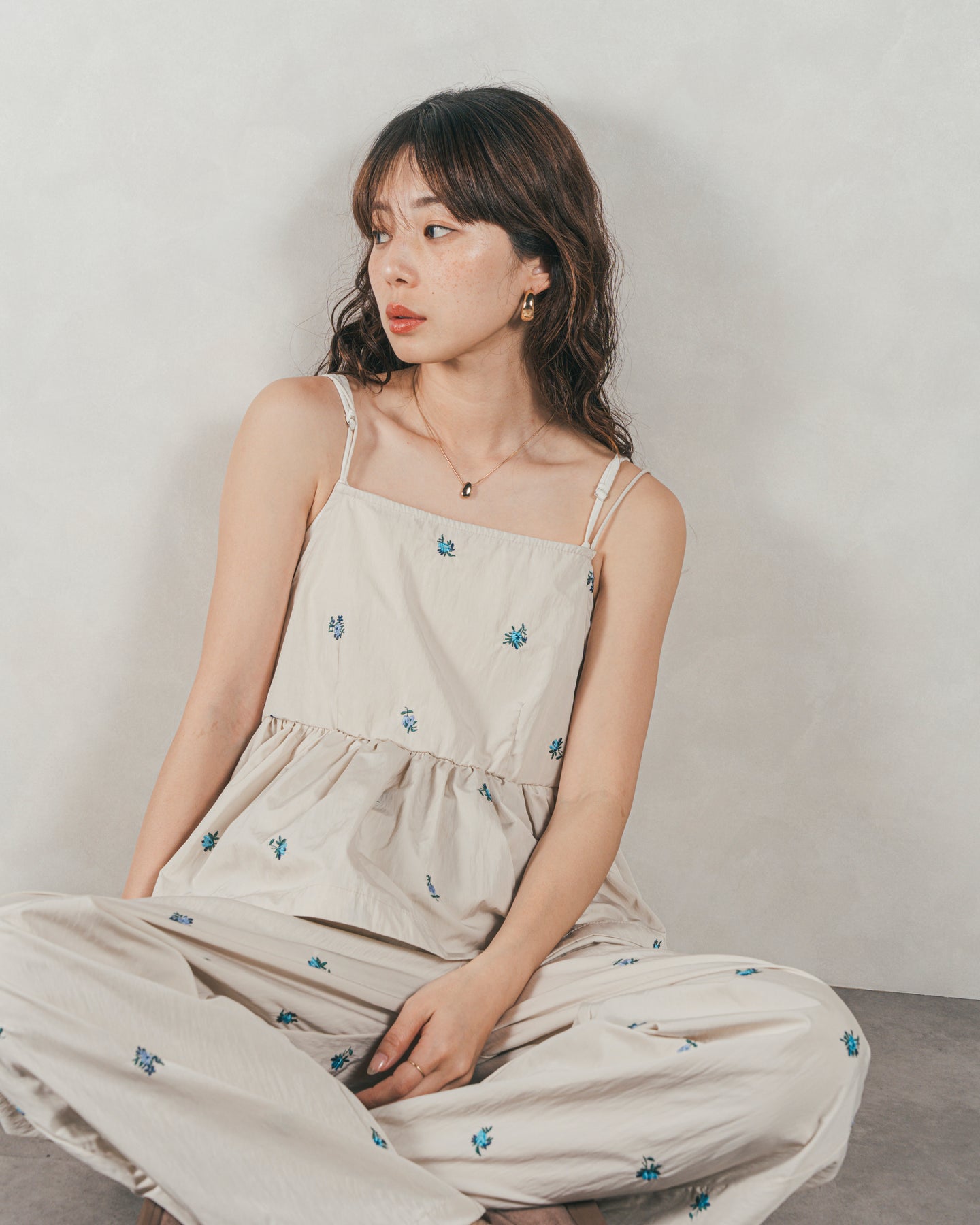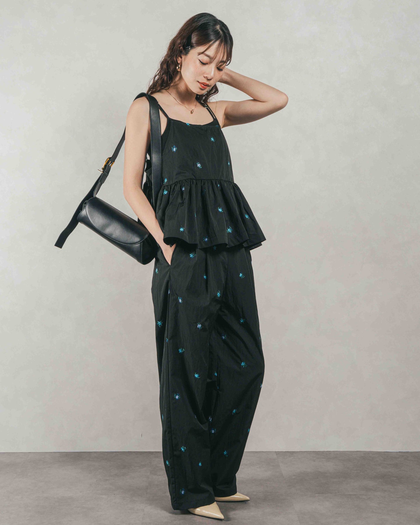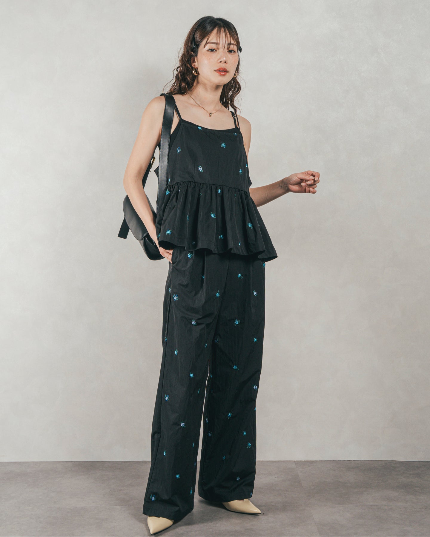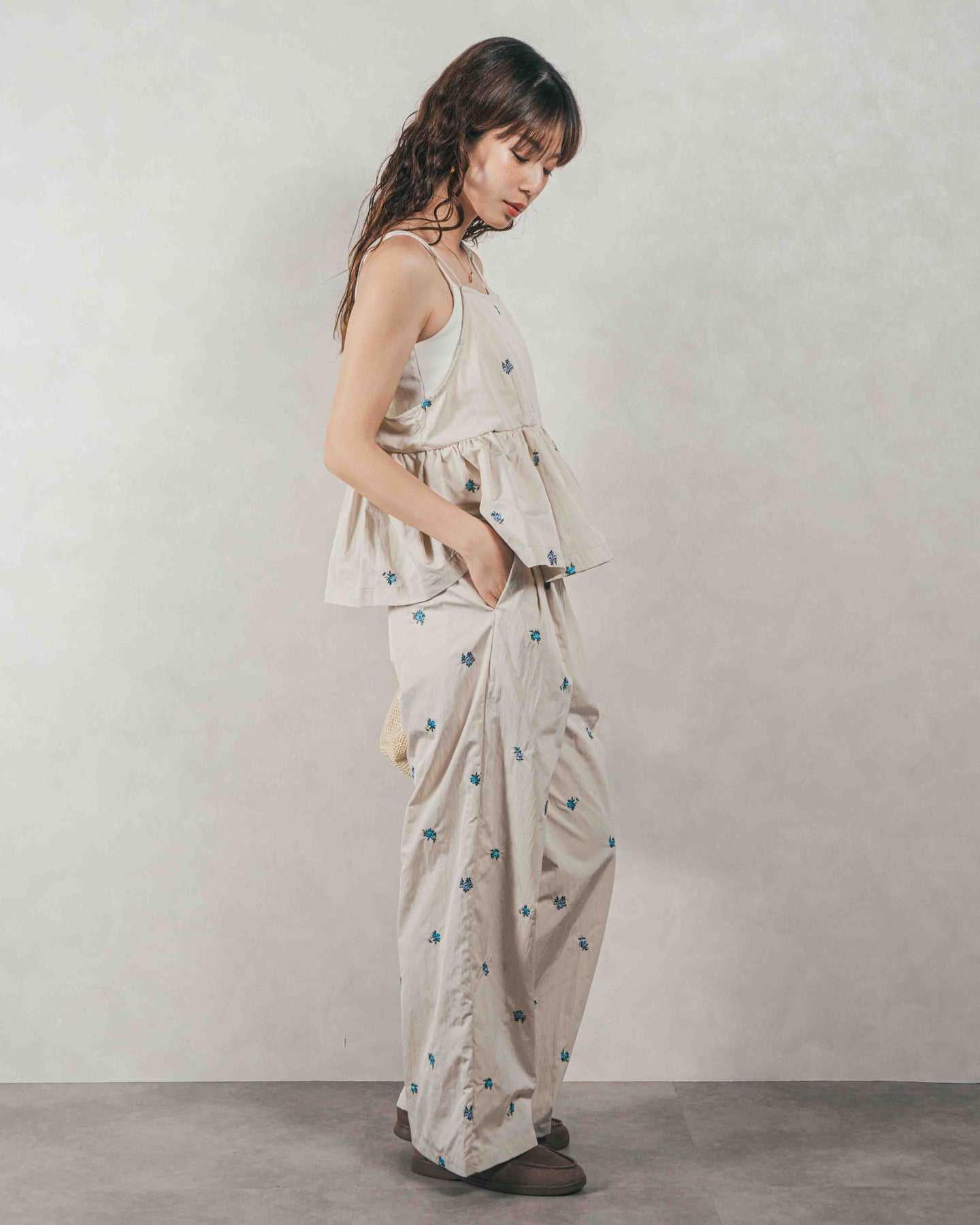 [SET]Flower刺繍 ボリュームキャミ + Flower刺繍 タックパンツ(2SET)