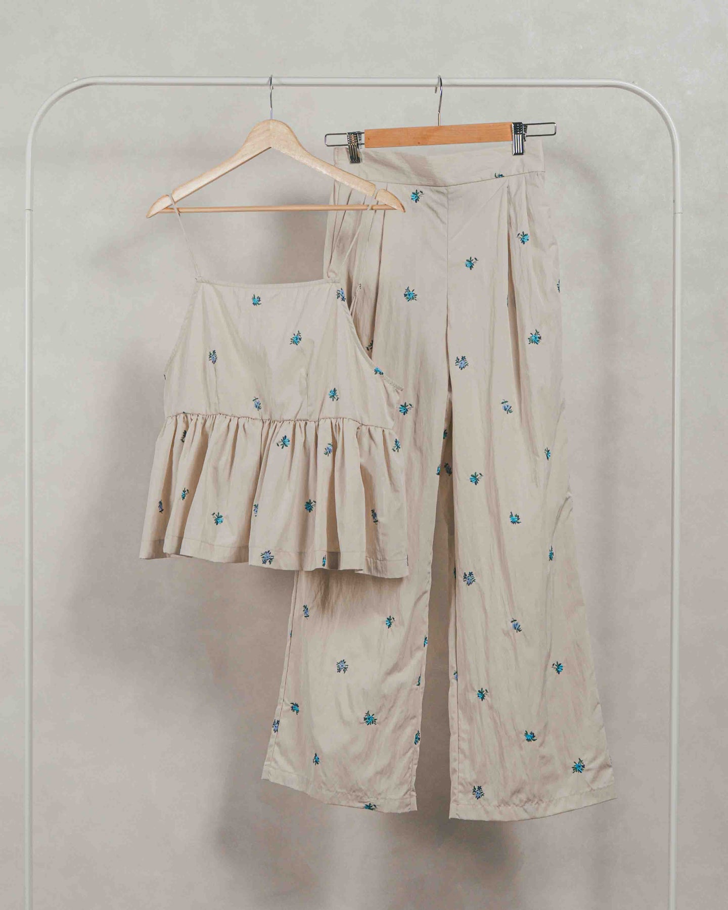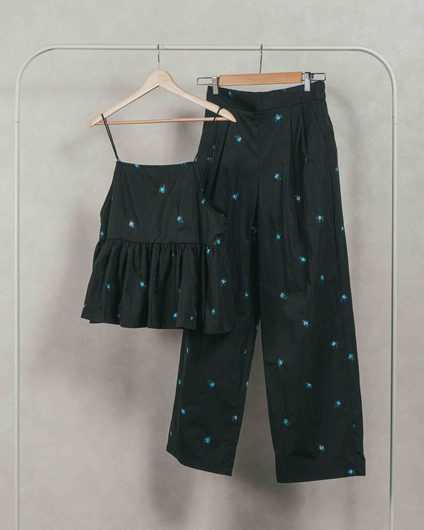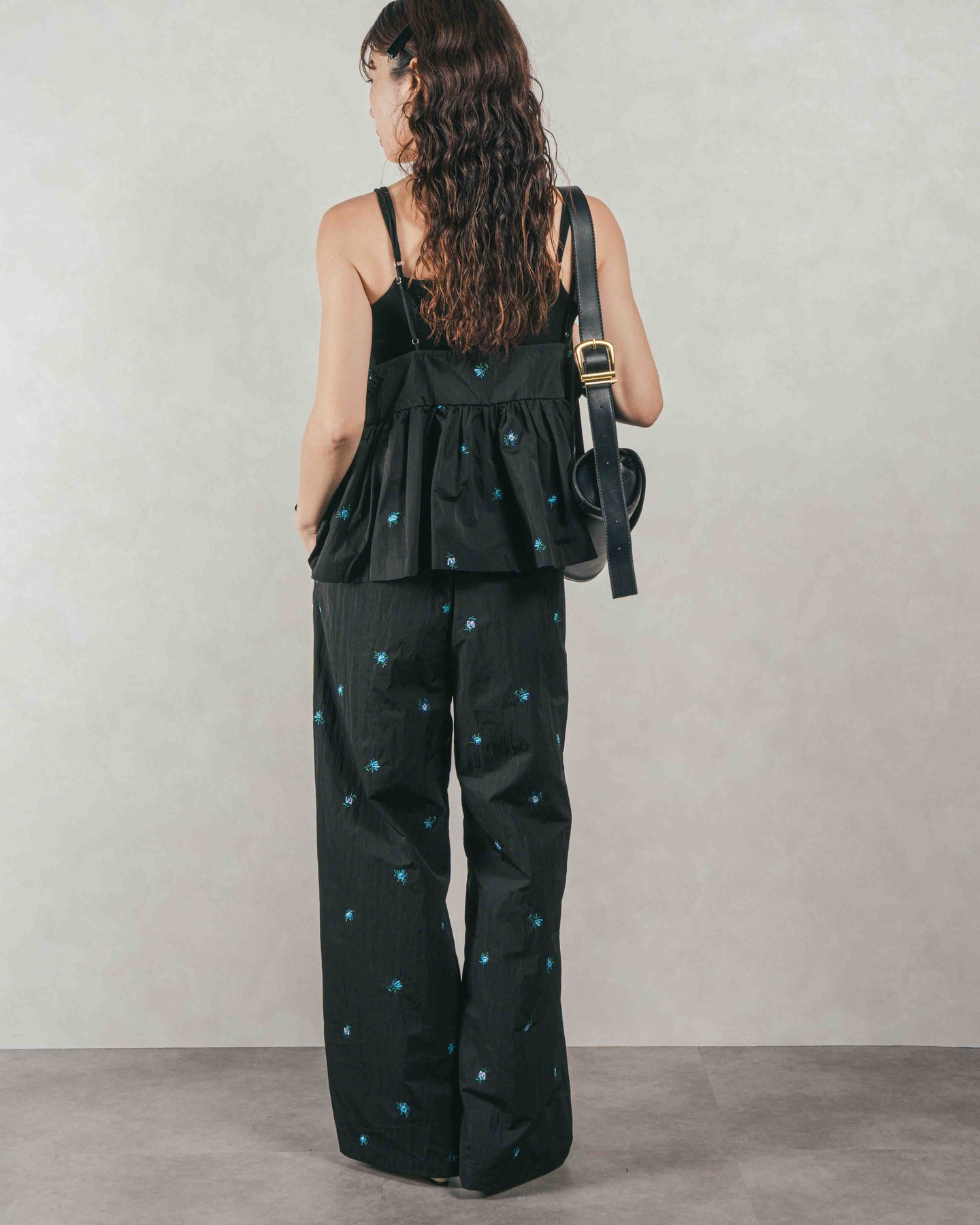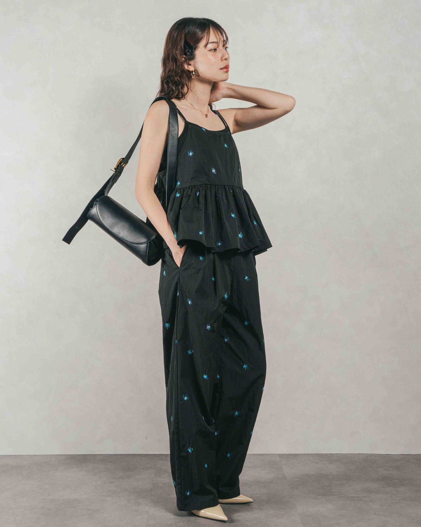 [SET]Flower刺繍 ボリュームキャミ + Flower刺繍 タックパンツ(2SET)