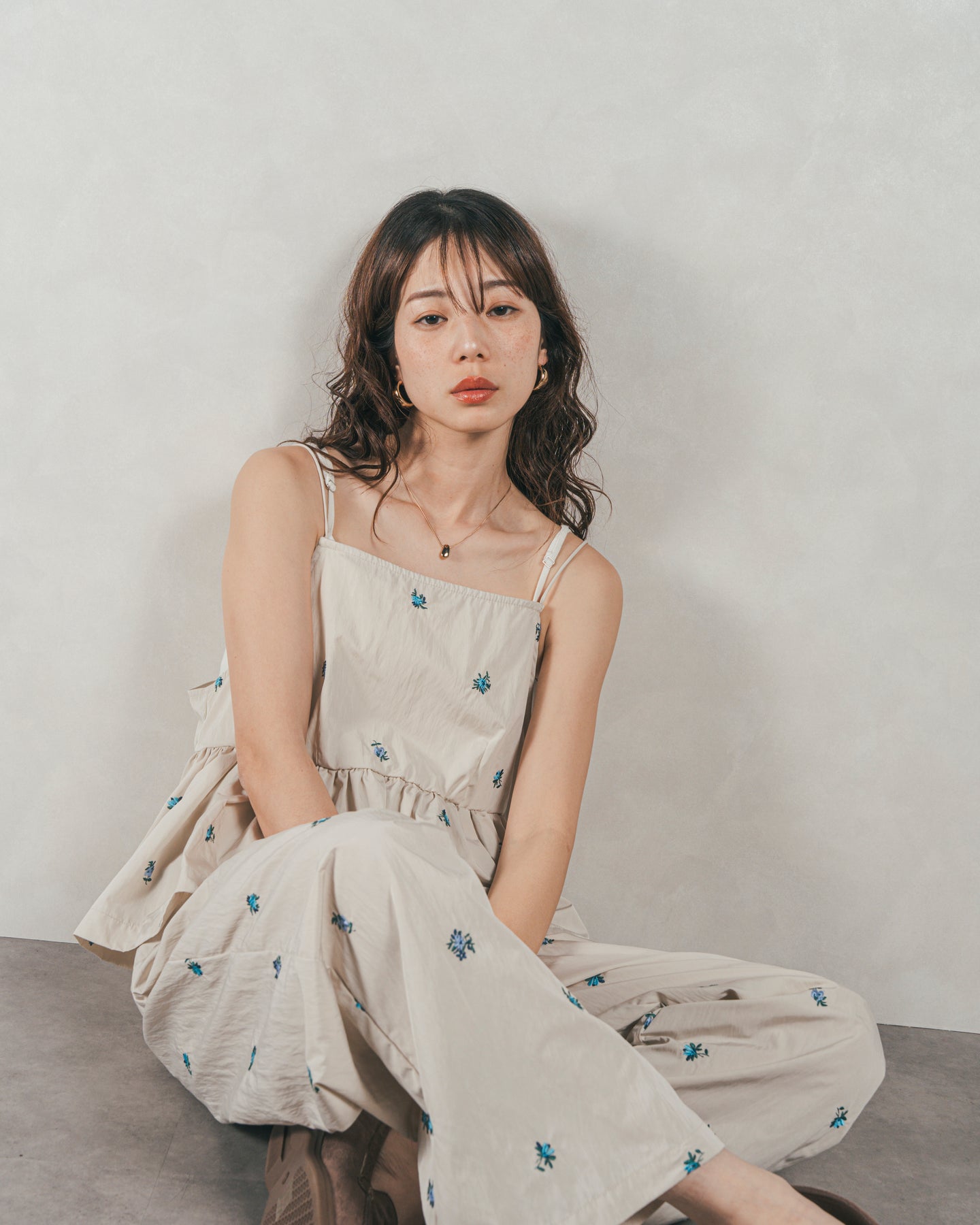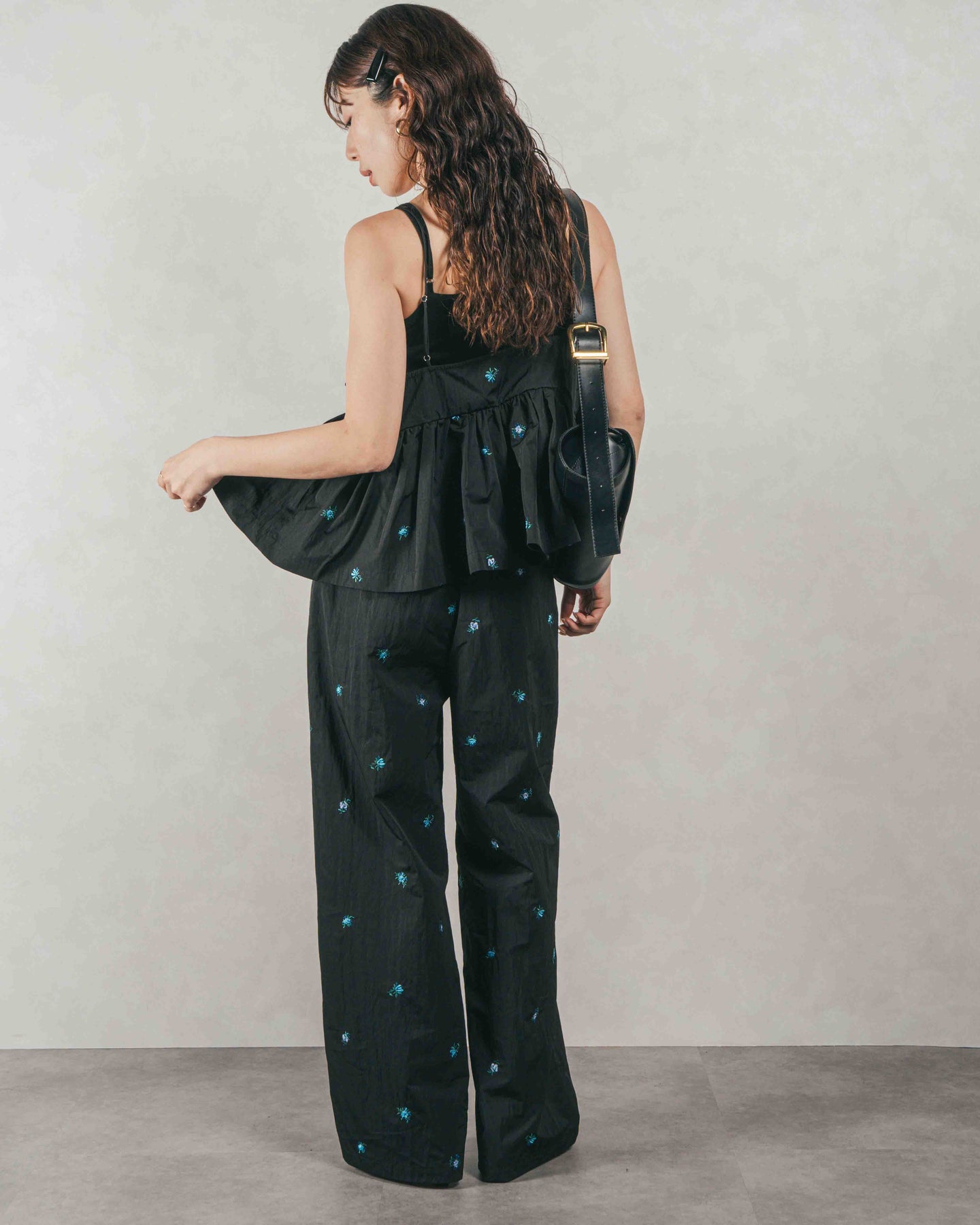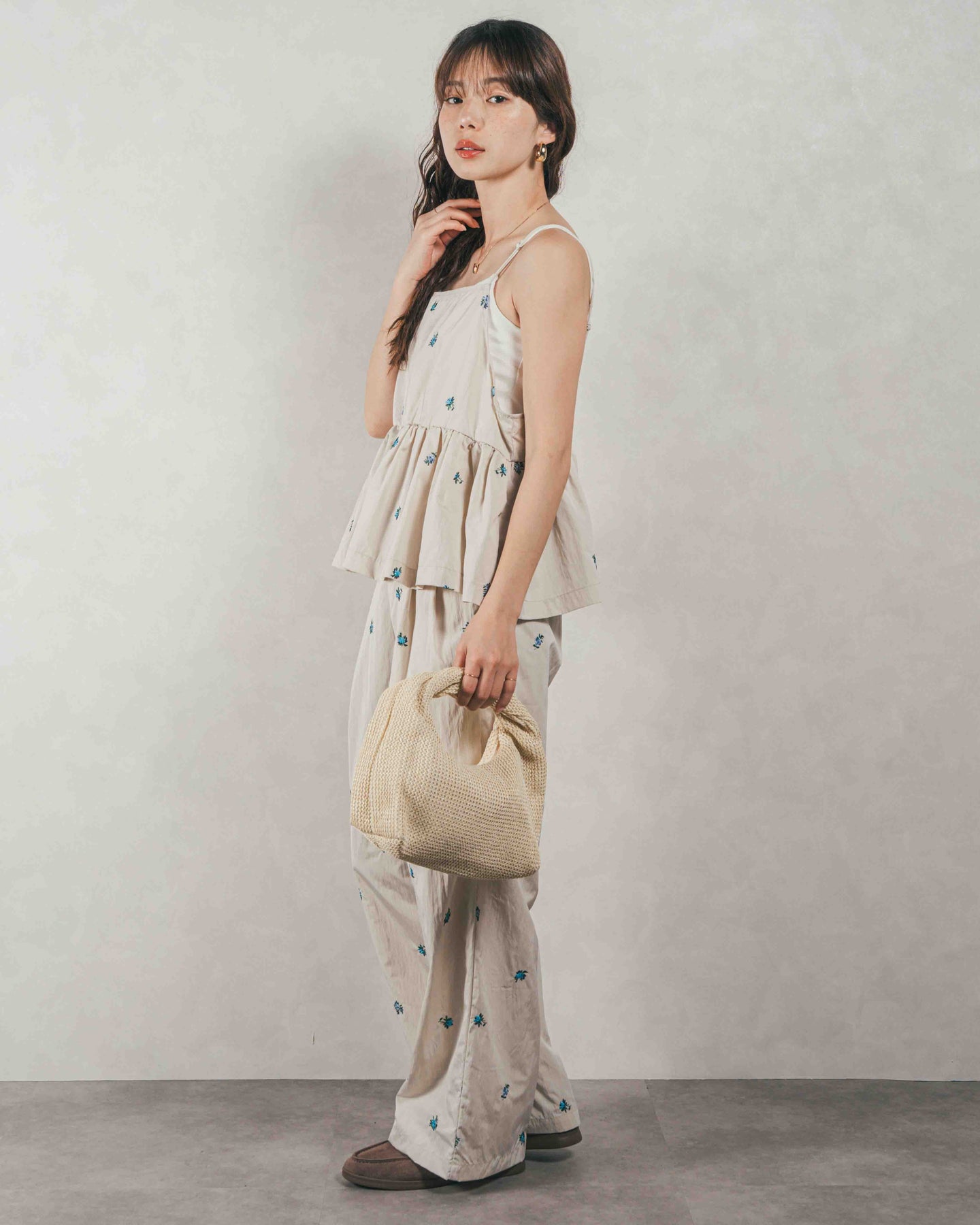 同素材の「Flower刺繍 ボリュームキャミ」と合わせたセットアップスタイルで、ごきげんなお出かけスタイルが完成。ボトムだけで合わせるスタイリング時は足元はサンダルでラフに、あるいはローファーでマニッシュに、気分に合わせた自由なスタイリングを楽めます。